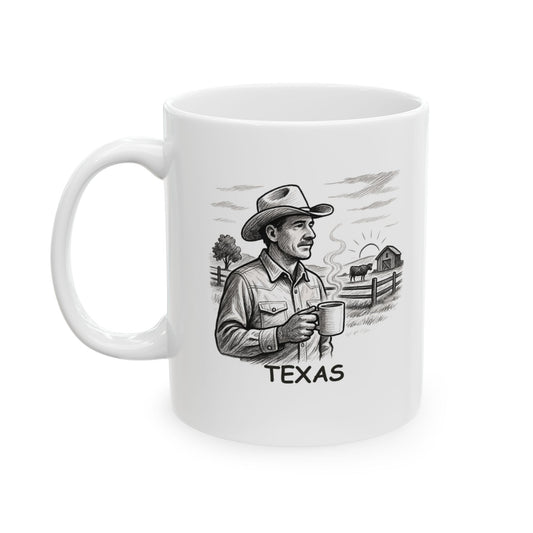 "Texas: Where ‘ranch life’ means waking up early, drinking coffee, and making the day a little bit bigger." Ceramic Mug - 12761
