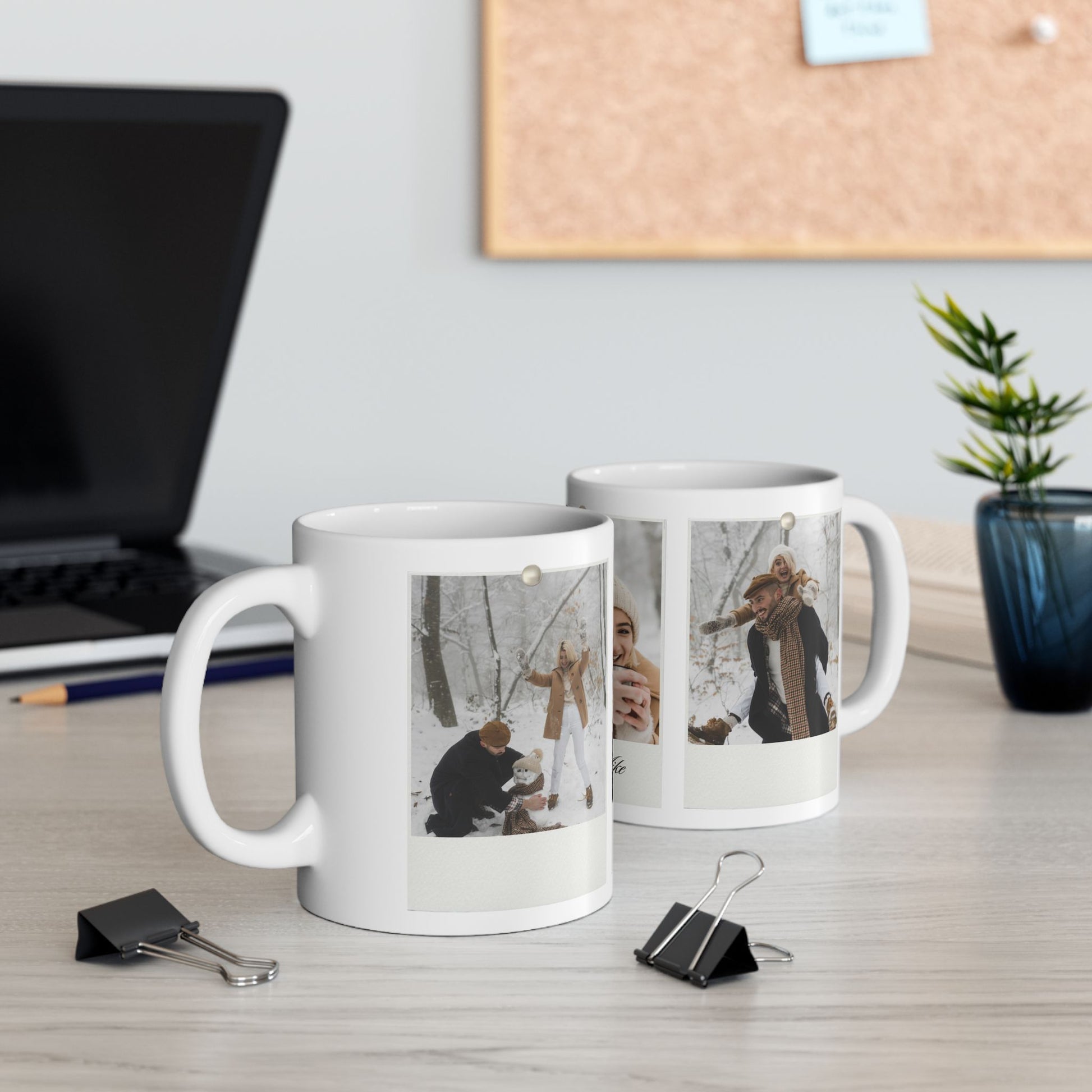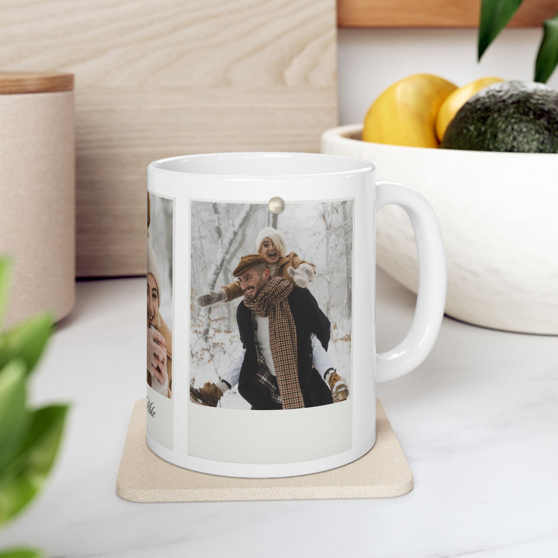 Cherish your favorite memories with the Ann & Mike, Photos, Customizable Ceramic Mug. This personalized mug lets you upload your own photos, making it the perfect gift or keepsake for any occasion. Whether it's a romantic moment, a family picture, or a snapshot of your special bond, this mug brings your memories to life.