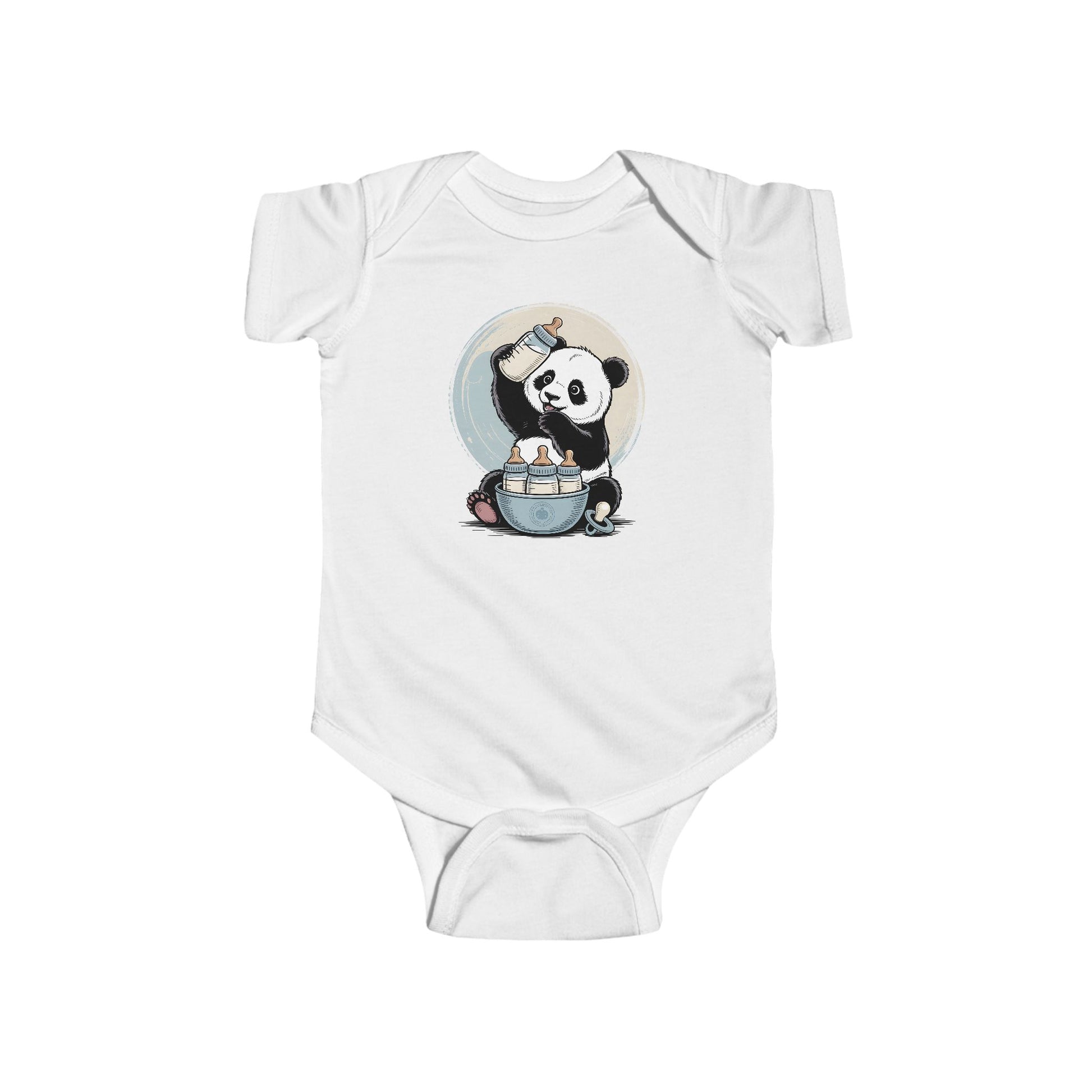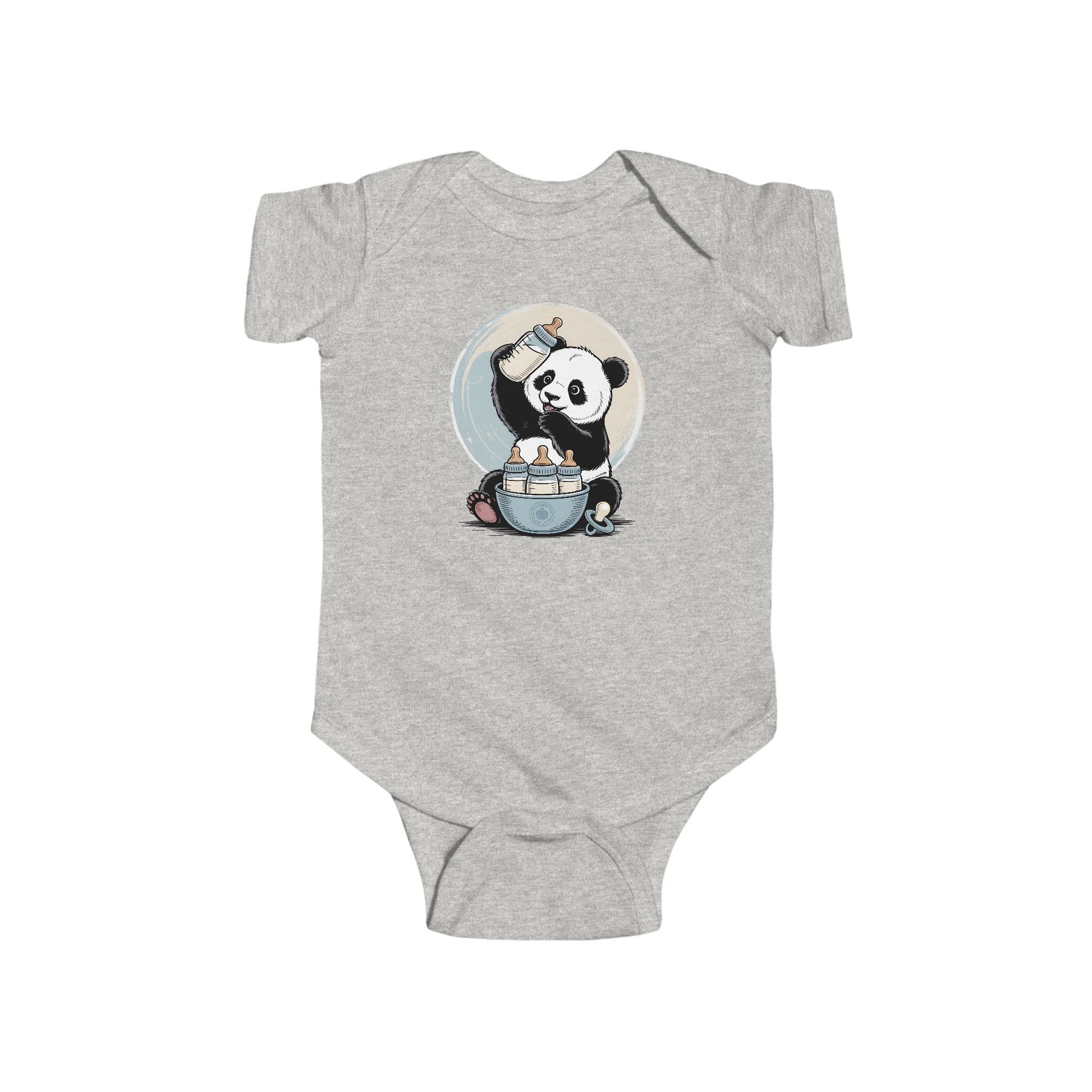 Featuring a playful baby panda surrounded by milk bottles and soft pastel tones, this charming onesie is perfect for newborn cuddles, baby showers, and precious first photos.