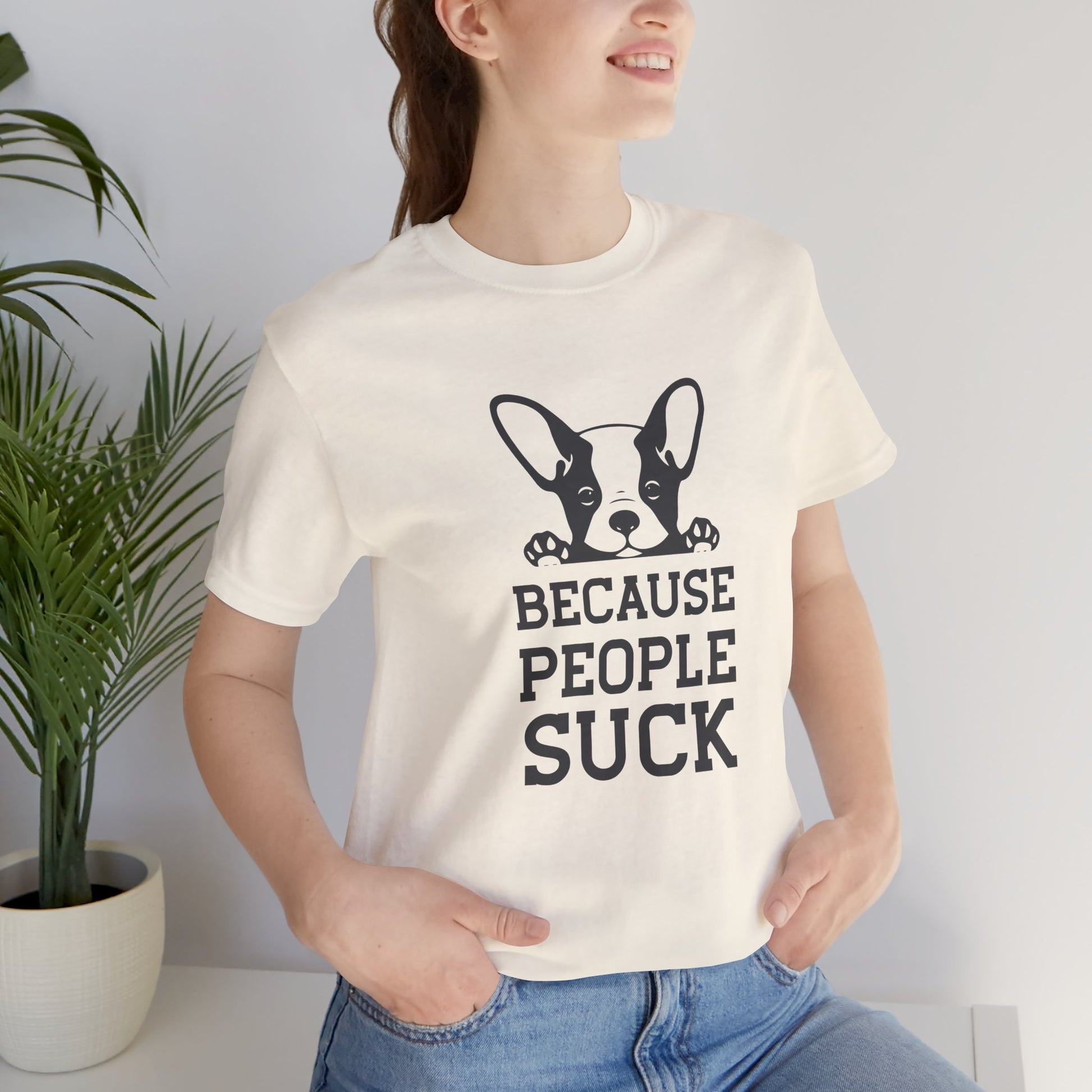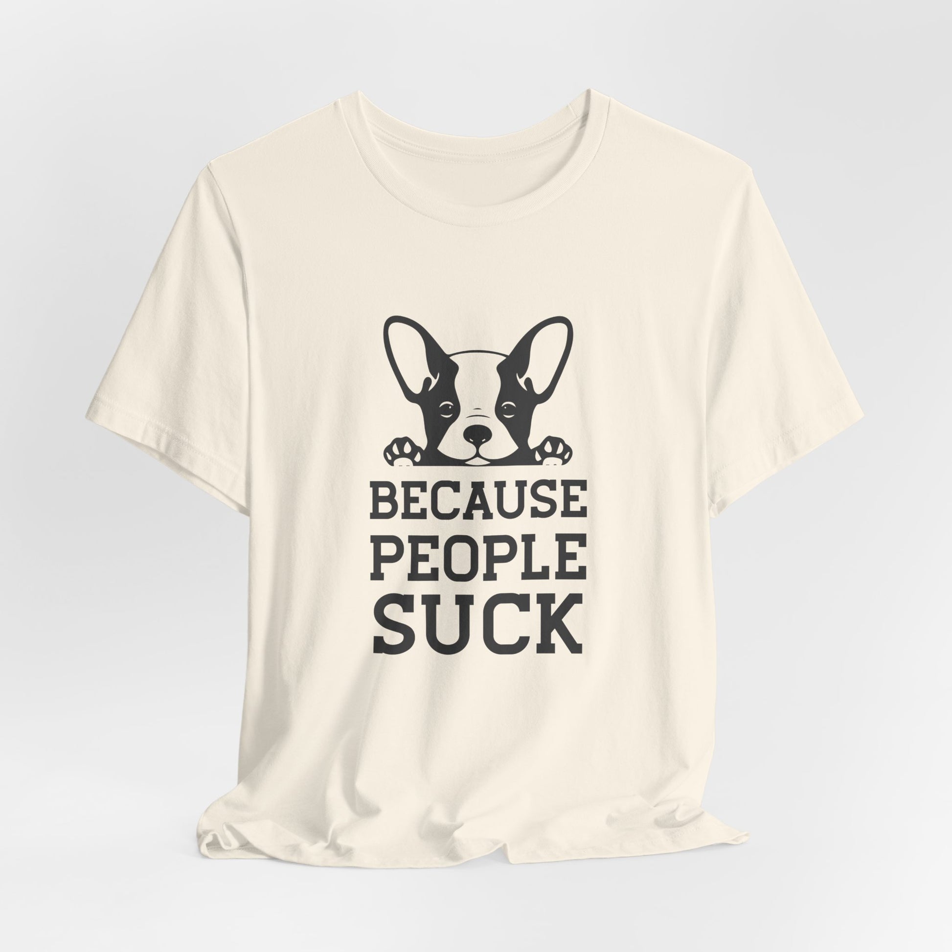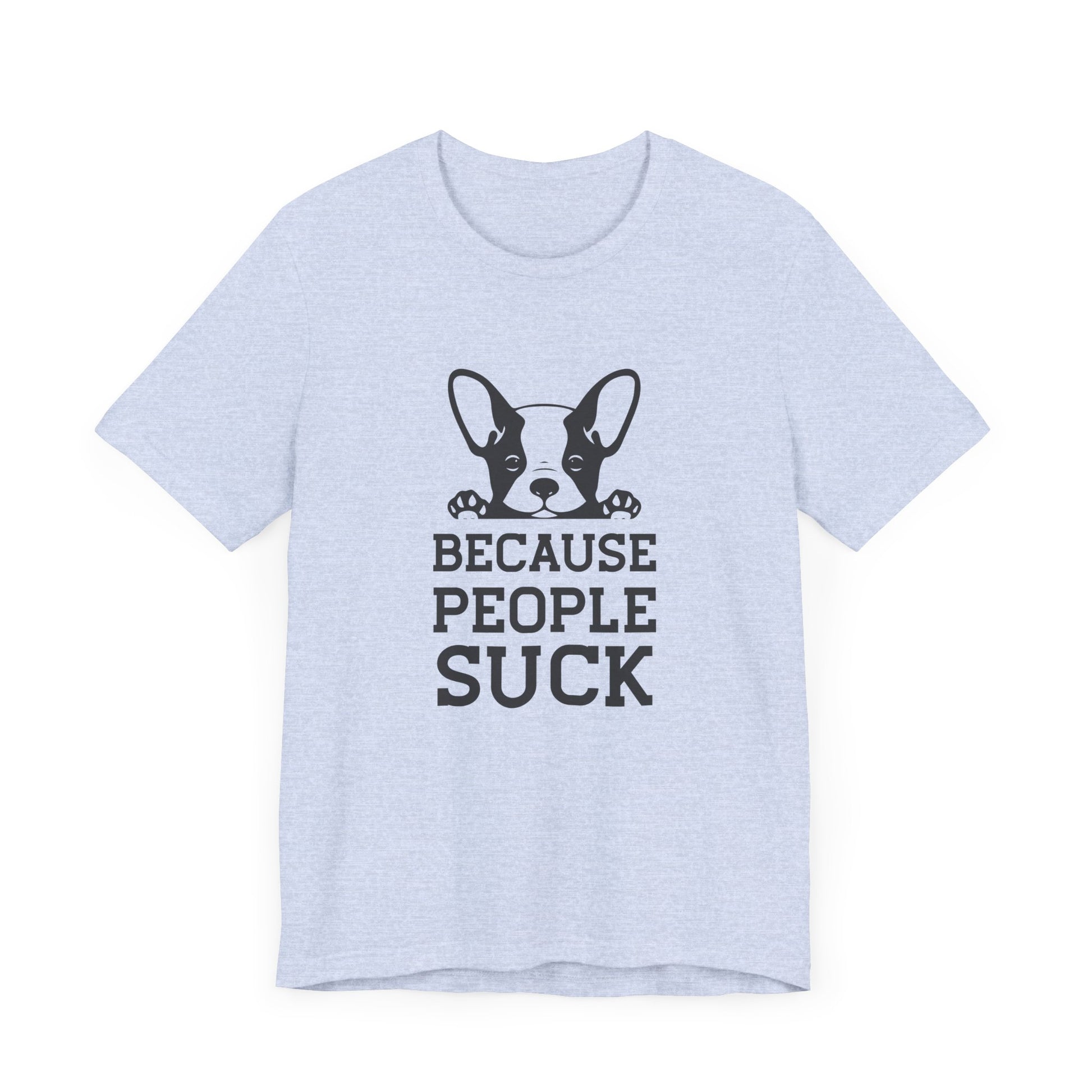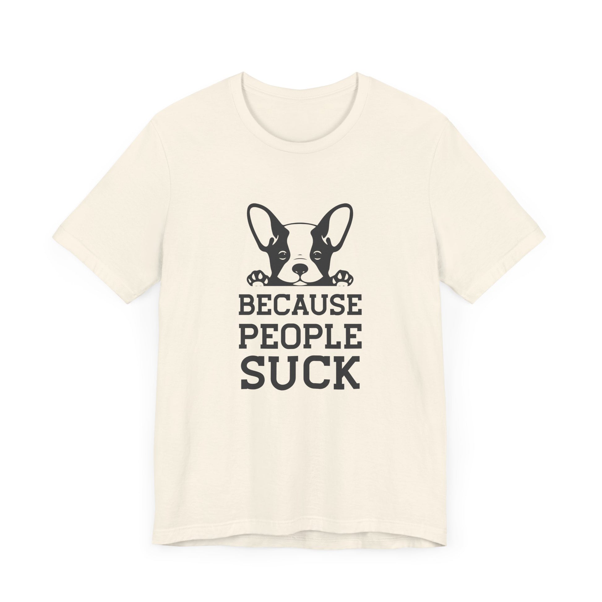 Let your wardrobe reflect your true feelings with our "Because People Suck" Unisex Jersey Short Sleeve Tee. Order yours today and wear your love for dogs and your candid sense of humor with pride!