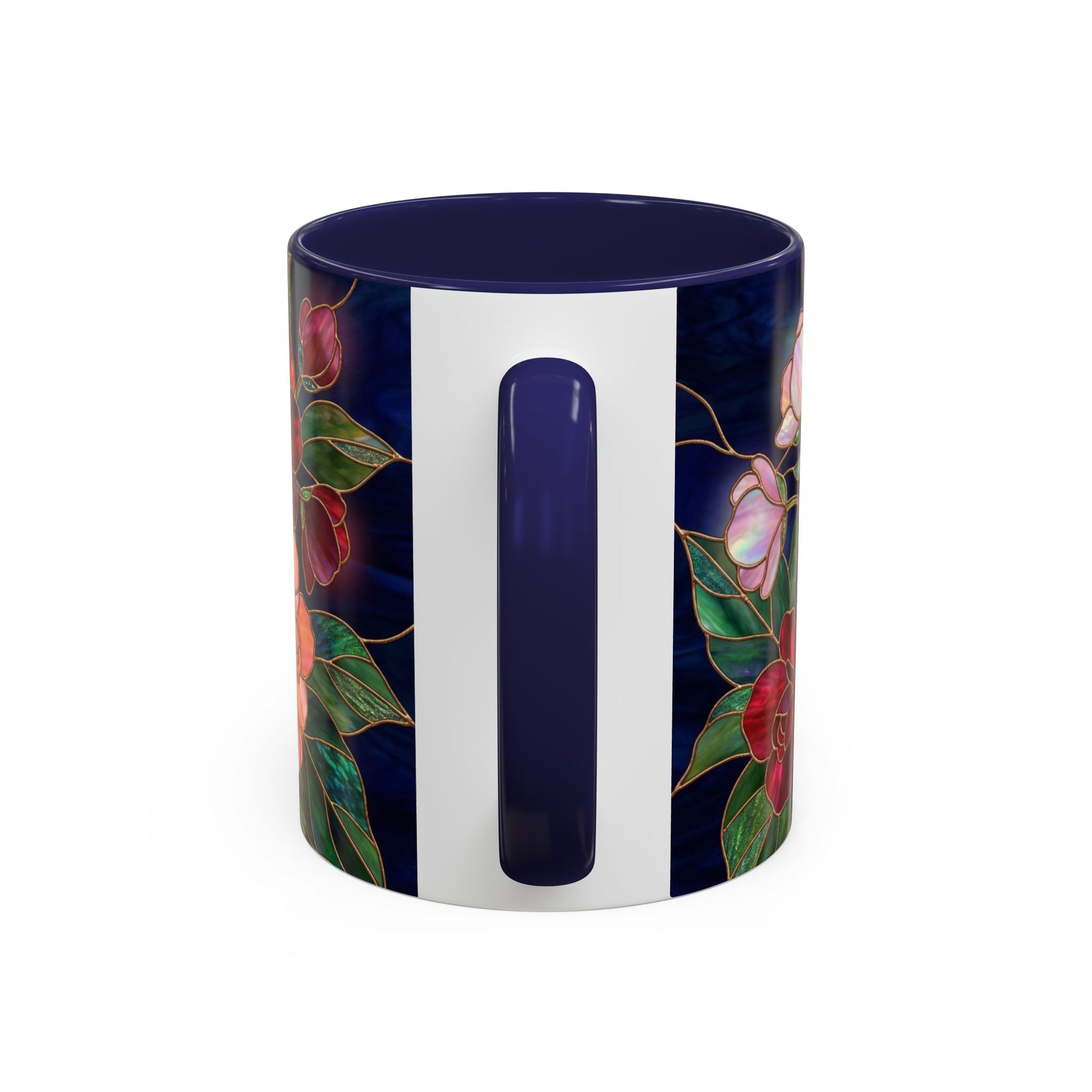 This glossy ceramic coffee mug brings a garden of hand-painted camellias to your morning ritual. Deep navy wraps the background so the pinks, reds, and creamy blooms pop with stained-glass richness. The colored interior and handle add a bold contrast that makes every sip feel considered and a little luxurious. It’s sturdy enough for daily use—microwaveable, dishwasher-safe, and free from lead and BPA—so the art stays vivid through regular routines. Keep it on your desk to brighten work hours or use it for slow, quiet mornings where the floral detail earns a moment of attention.