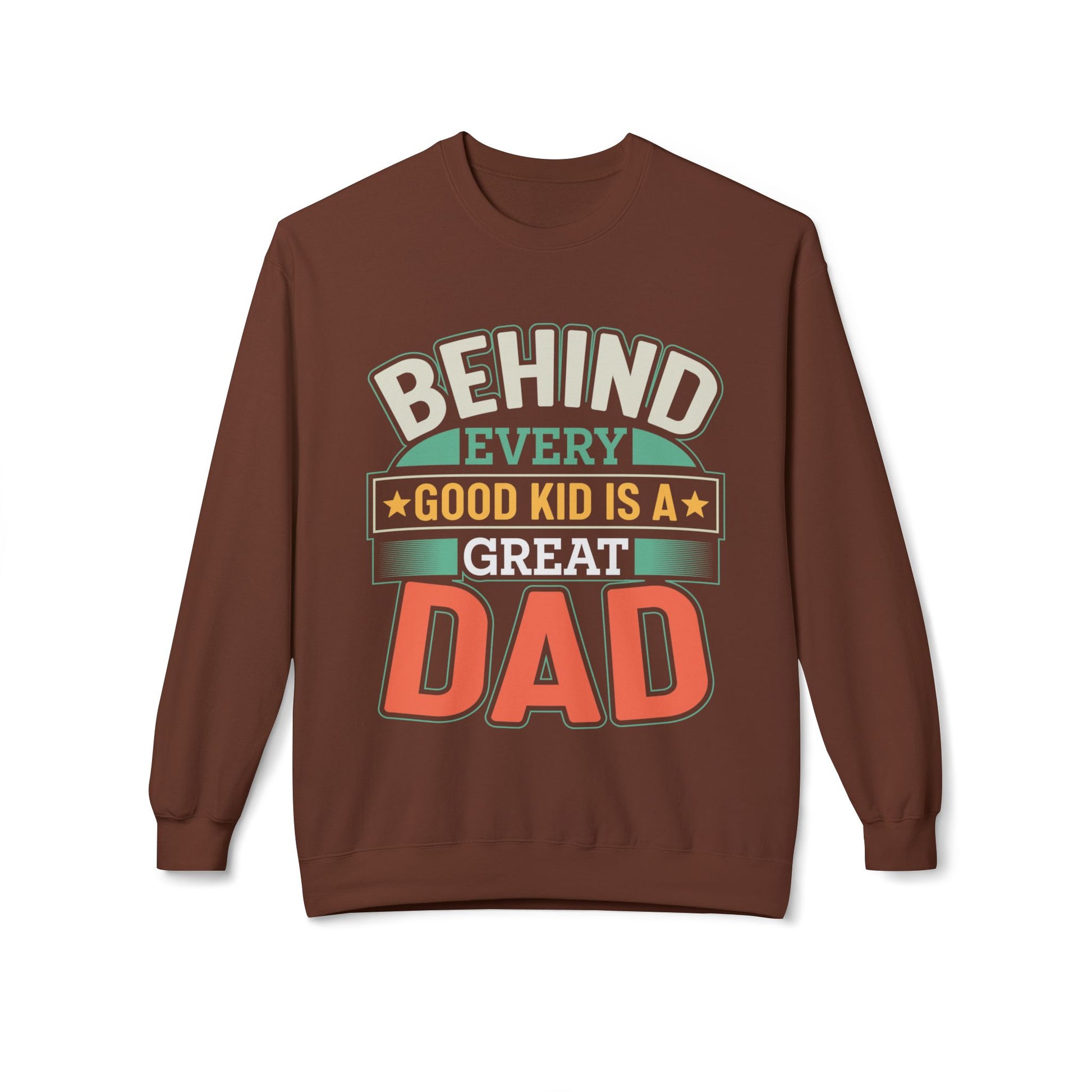 This cozy Unisex Midweight Softstyle Fleece Crewneck Sweatshirt is the perfect addition to any casual wardrobe. Crafted with a soft, medium-heavy fabric, it envelops you in comfort while you relax at home or venture out on a chilly day. The unique design, featuring the phrase 'Behind Every Good Kid Is A Great Dad,' makes it a heartfelt statement piece, celebrating the bond between fathers and their children. Ideal for dads who appreciate comfort and style, this sweatshirt is perfect for casual outings, family gatherings, or simply lounging in style.