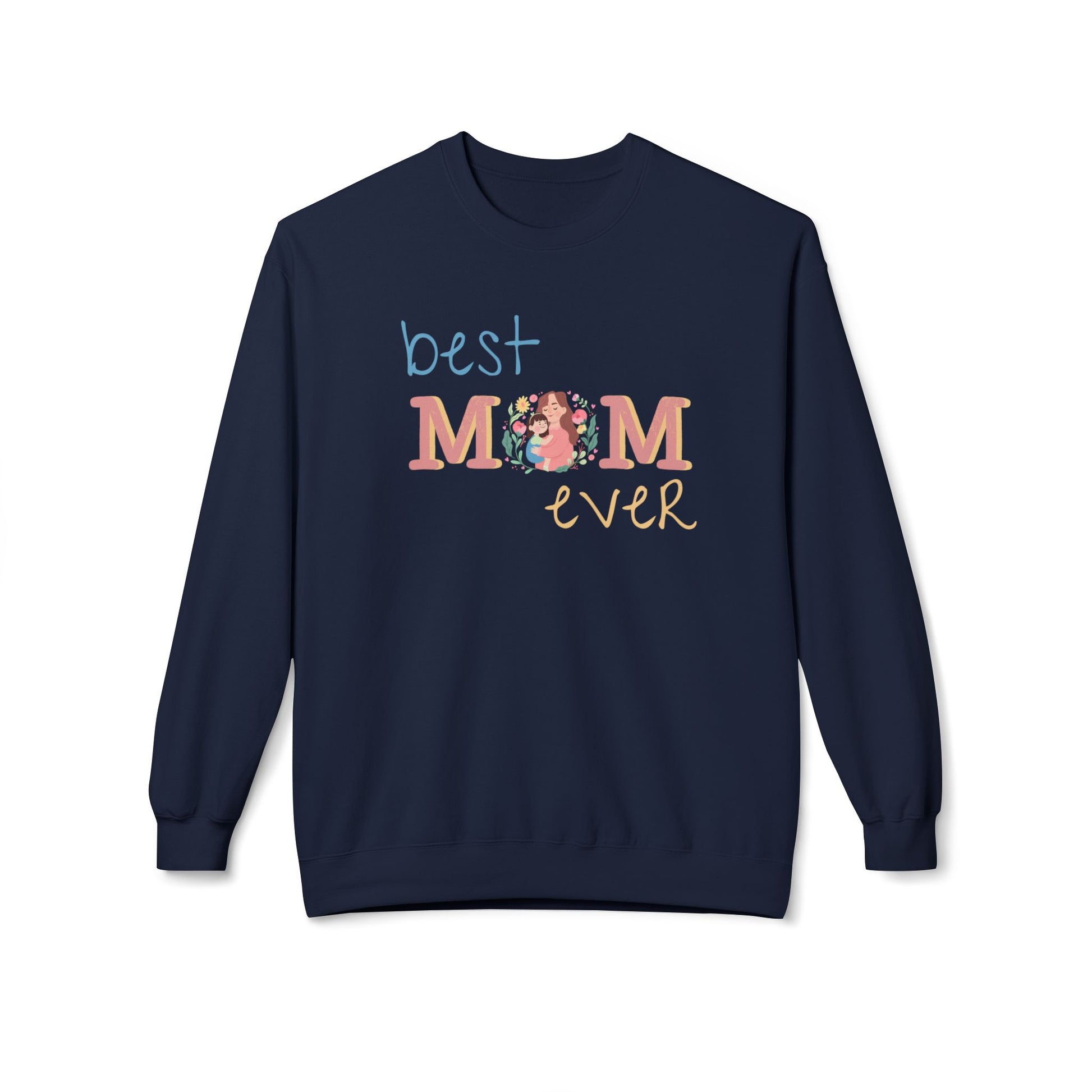 Elevate your cozy wear with this unisex midweight softstyle fleece crewneck sweatshirt. Designed for both comfort and style, this sweatshirt features dropped shoulders for a relaxed and easy vibe. Perfect for chilly days, it's a wonderful addition to your casual wardrobe, ideal for lounging at home or running errands. The classic fit makes it suitable for everyone, making it an excellent gift for friends and family. Celebrate Mother’s Day, birthdays, or any special occasion with this heartfelt ‘Best Mom Ever’ design. This sweatshirt is perfect for moms looking to express their love and warmth every day, and it fits seamlessly into a family’s casual collection.