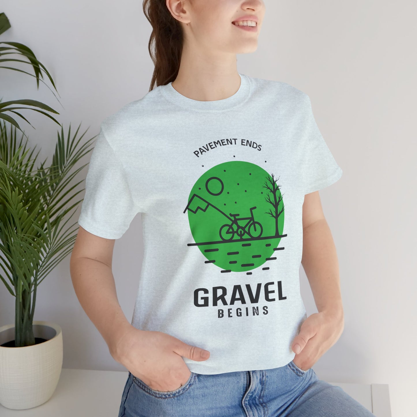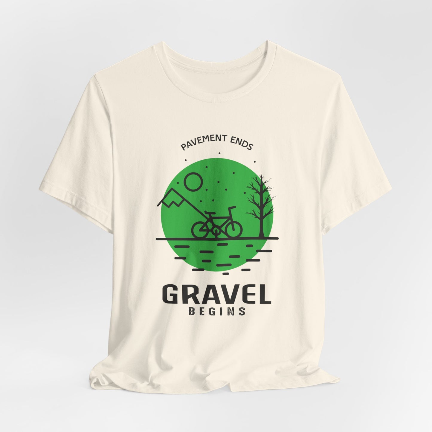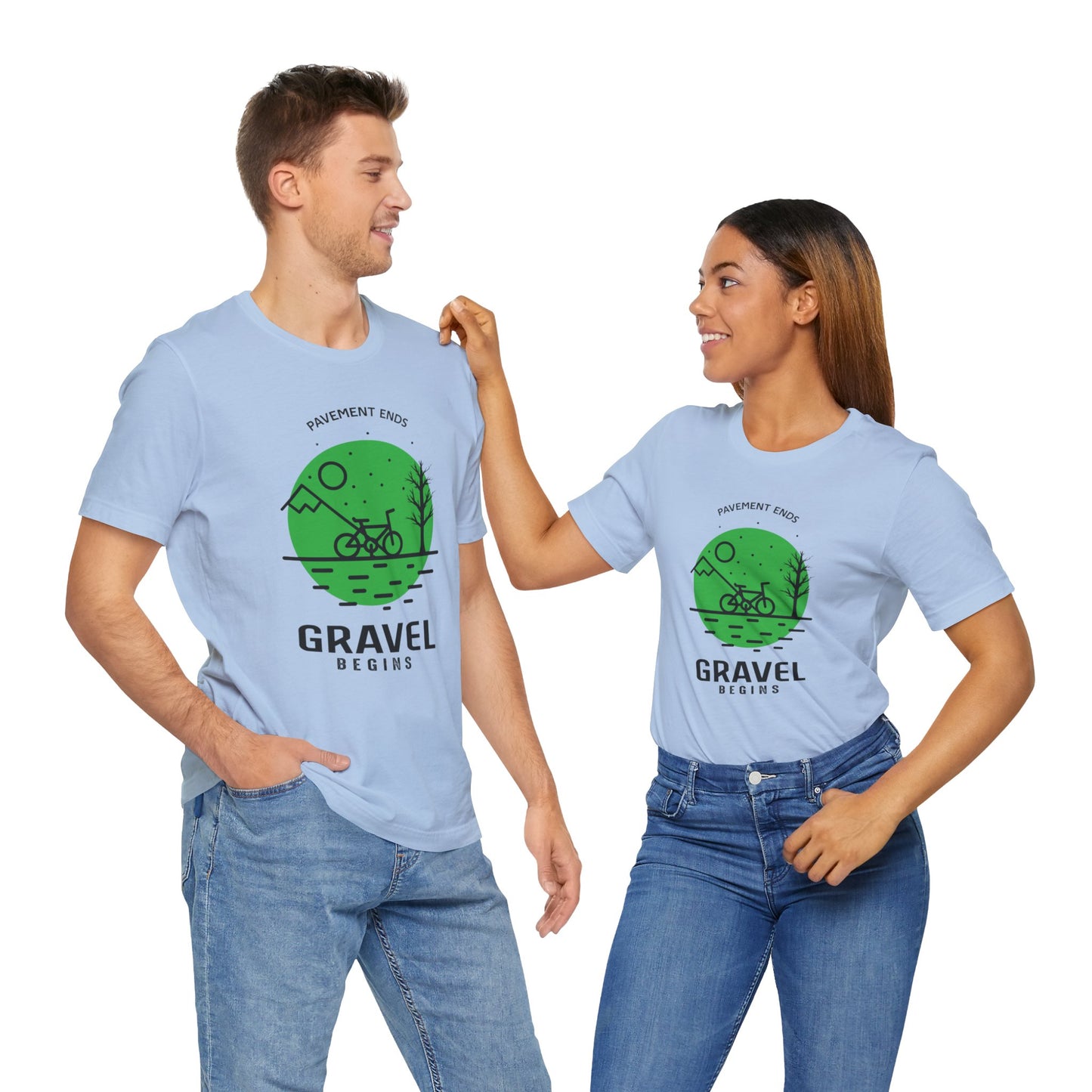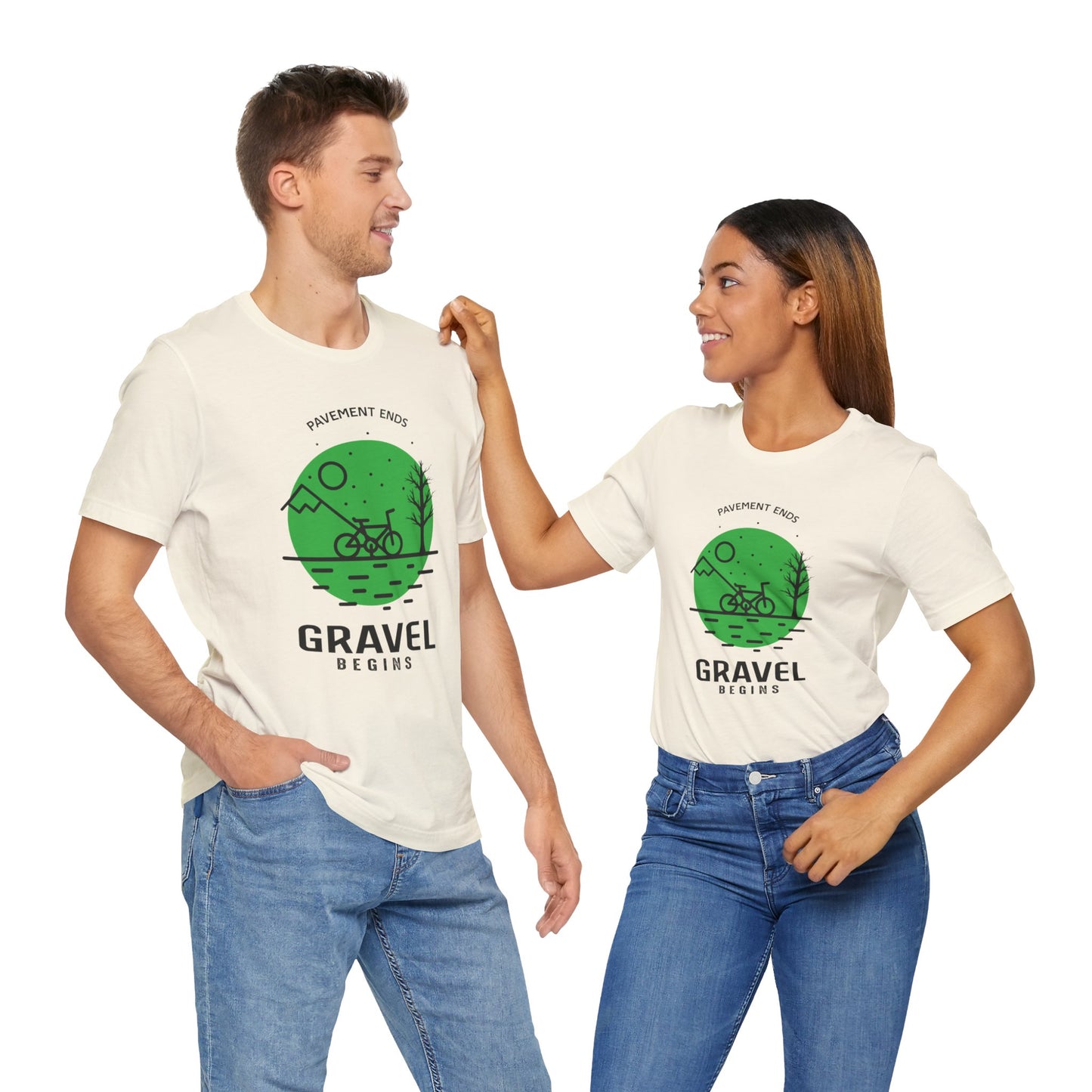 Celebrate the adventure of gravel biking with our "Pavement Ends, Gravel Begins" Unisex Jersey Short Sleeve Tee. Perfect for those who love to explore the unknown and embrace the freedom of the open trail. Available now – get yours and ride where the road ends and the adventure begins!
