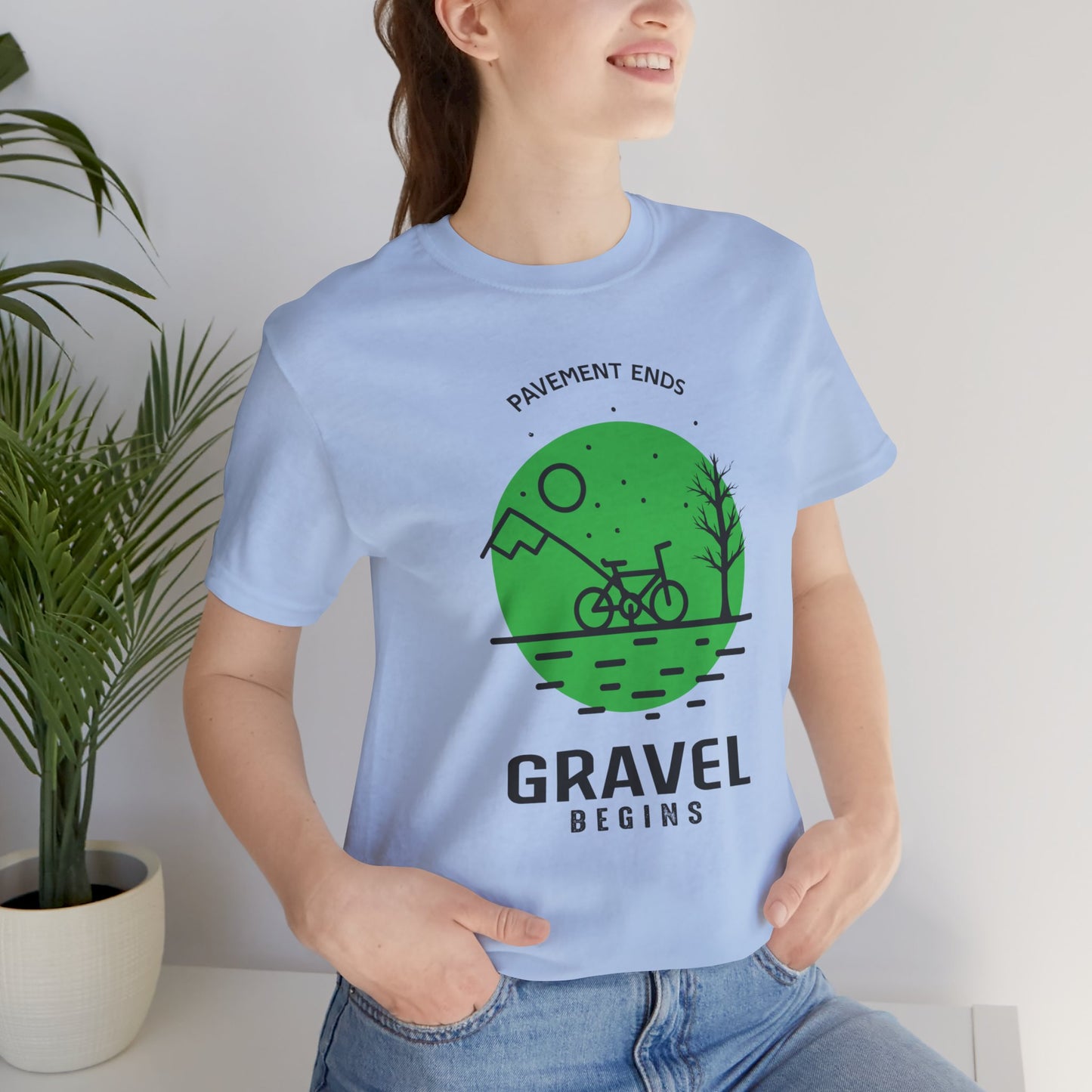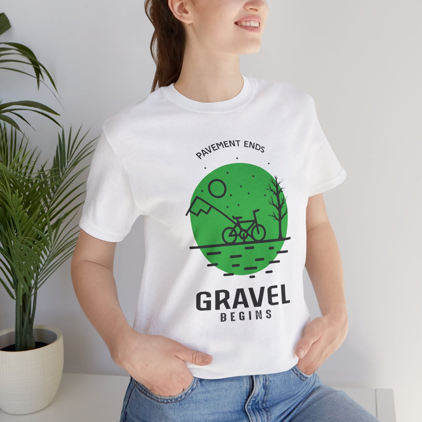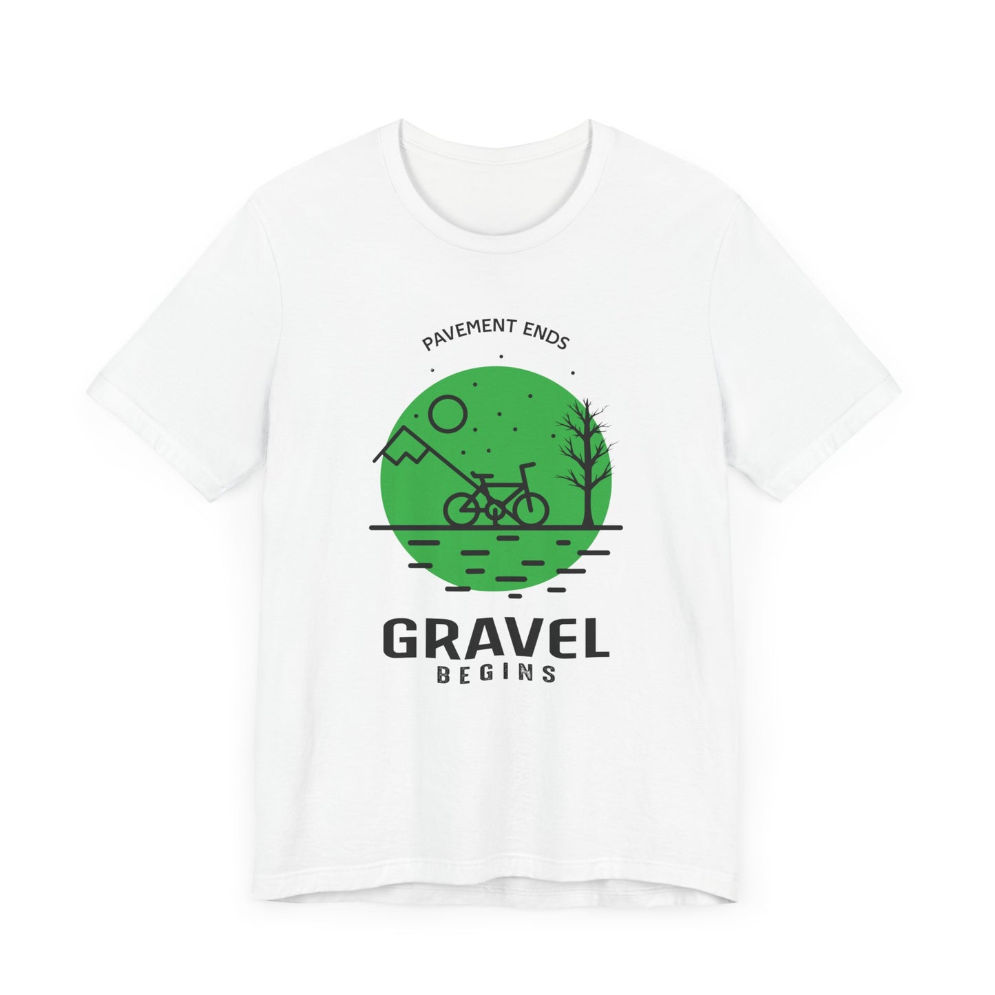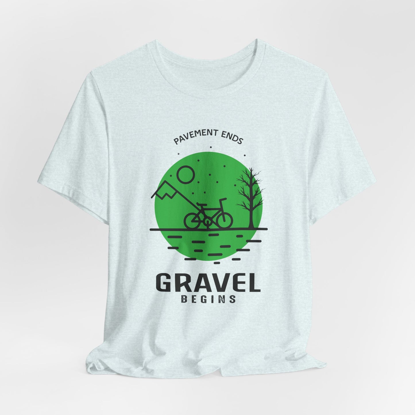 Celebrate the adventure of gravel biking with our "Pavement Ends, Gravel Begins" Unisex Jersey Short Sleeve Tee. Perfect for those who love to explore the unknown and embrace the freedom of the open trail. Available now – get yours and ride where the road ends and the adventure begins!
