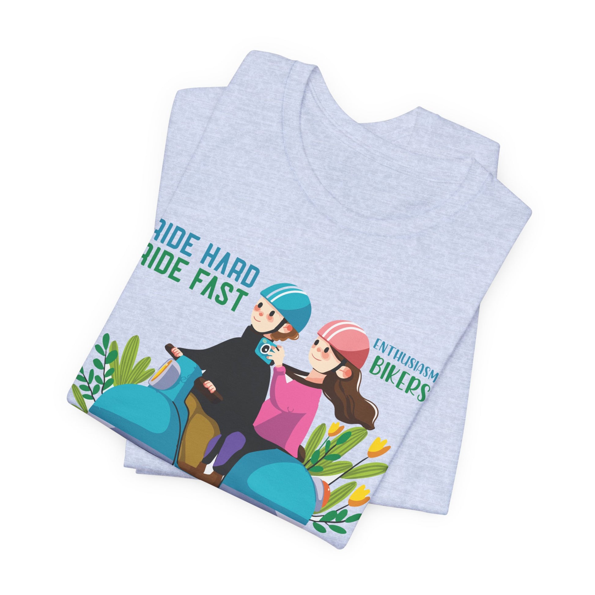 Crafted from premium ring-spun cotton, this tee offers a soft and comfortable fit for both men and women. The bold design features the dynamic phrase "Ride Hard, Ride Fast," accompanied by a striking motorcycle graphic that embodies the spirit of adventure and speed.
