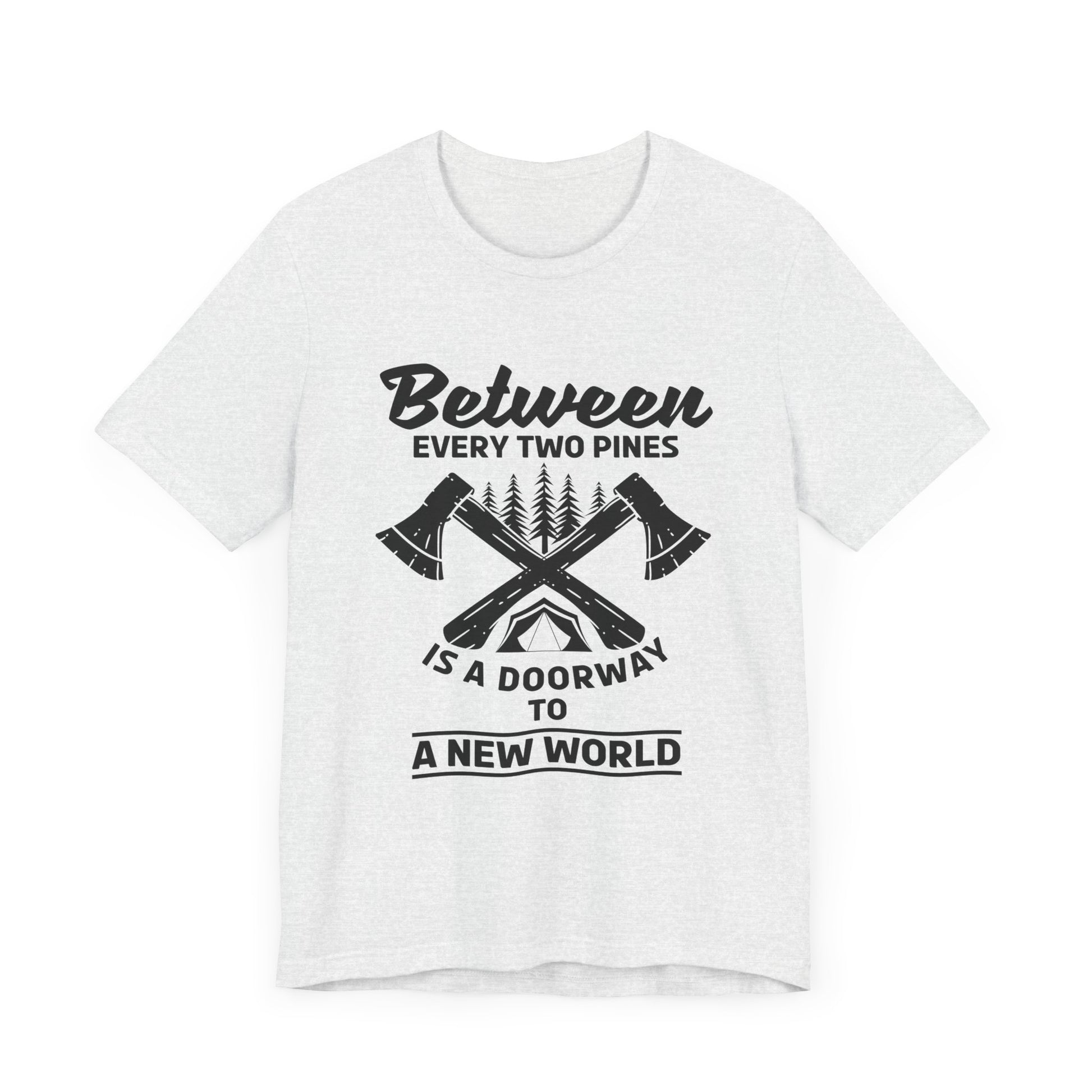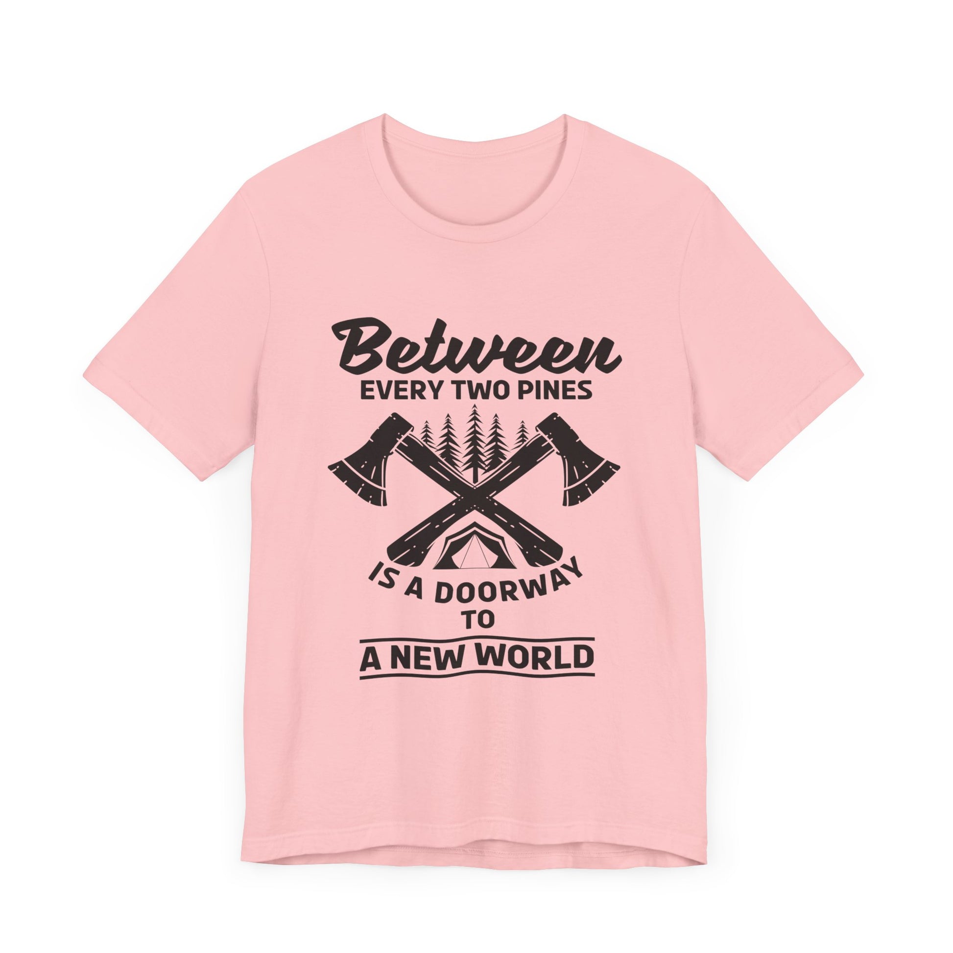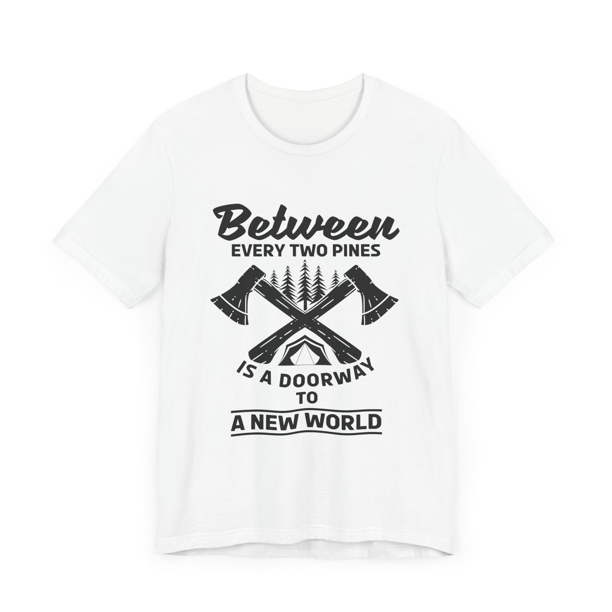 Camping: Between Two Pines Is A Doorway To A New World - Unisex Jersey Short Sleeve Tee - 12631