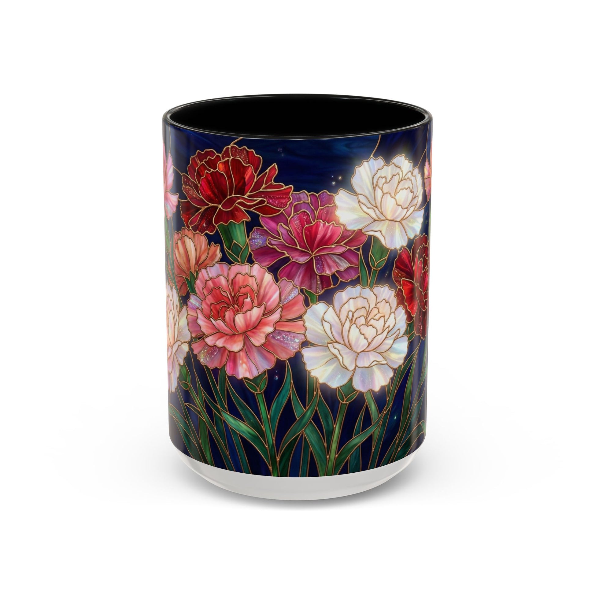 Celebrate the timeless charm of carnations with this beautifully crafted Stained Glass Carnation Coffee Mug. Featuring glowing layers of pink, red, and blush petals outlined in shimmering gold, the design captures the delicate ruffles and elegance of carnations in a stunning stained-glass style. Set against a deep midnight backdrop, each flower appears luminous, rich, and full of depth.
