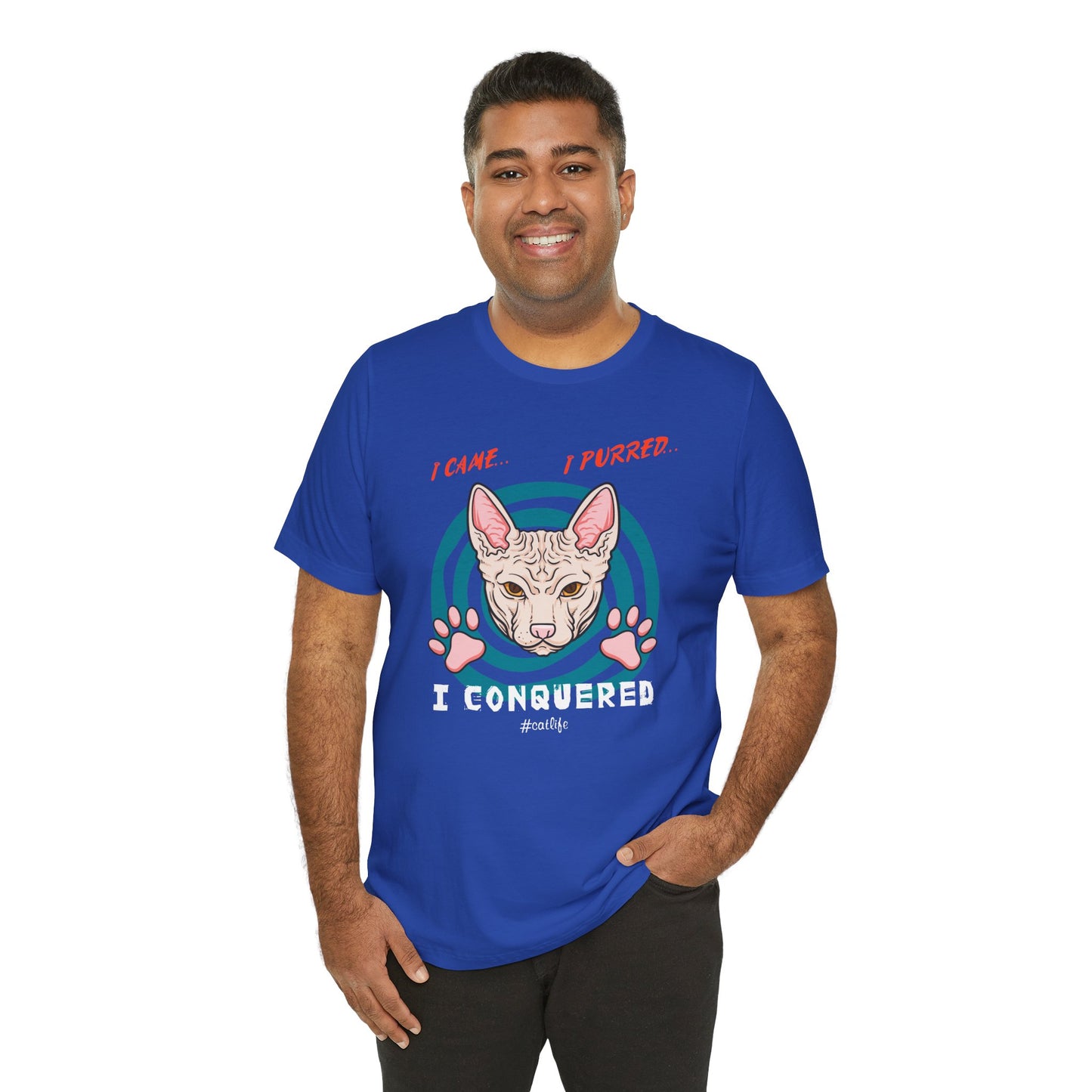 Embrace the bold and fearless spirit of cats with our "Cat: I Came, I Purred, I Conquered" Unisex Jersey Short Sleeve Tee. Order yours today and celebrate the adventurous side of your feline friends!