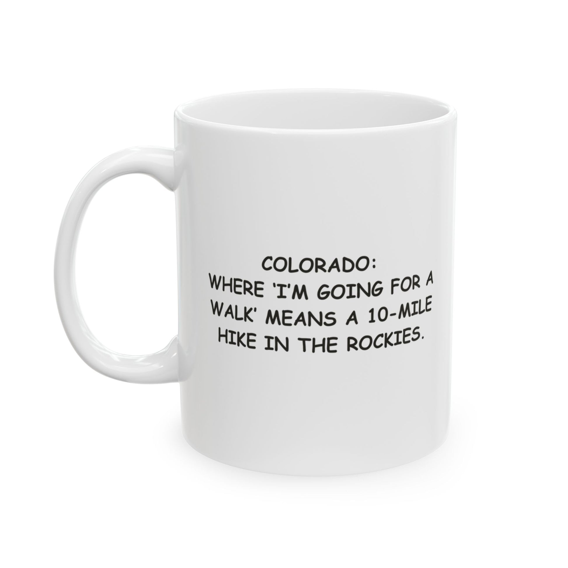 In Colorado, “just a walk” usually comes with elevation gain and breathtaking views. Our “Colorado: Where ‘I’m going for a walk’ means a 10-mile hike in the Rockies” ceramic mug is made for those who know a casual stroll often turns into a mountain mission.