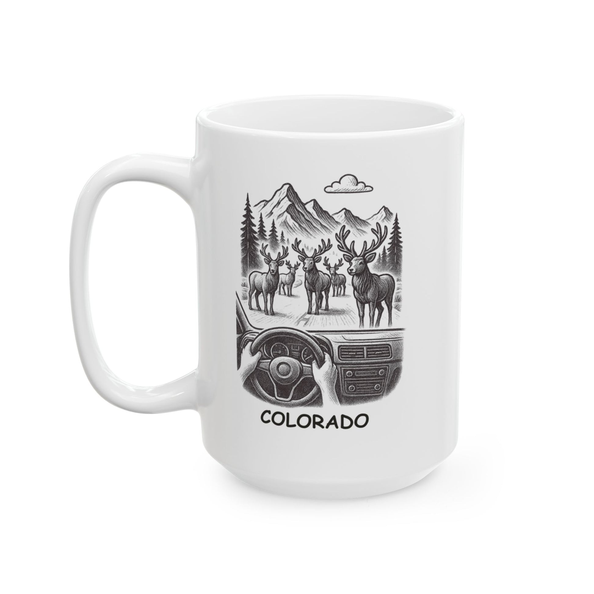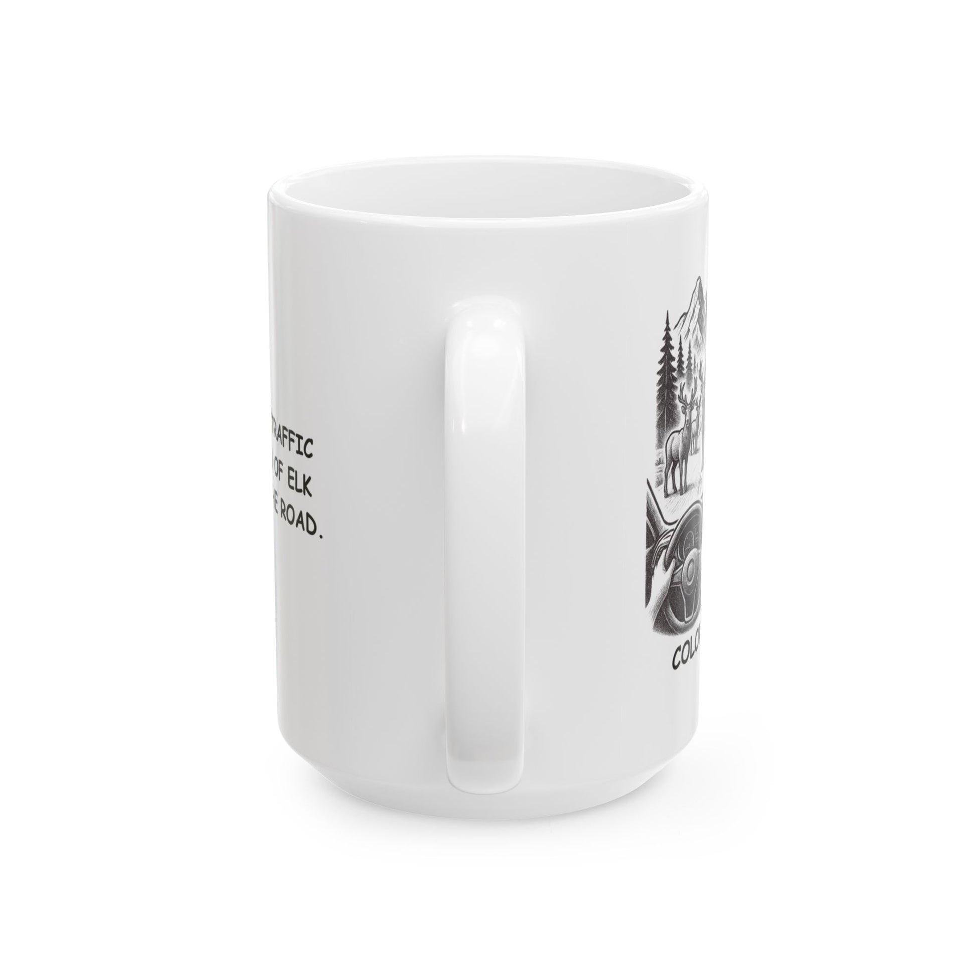 Forget honking horns—welcome to the kind of traffic only Colorado can offer. Our “Colorado: Where ‘traffic jam’ means a herd of elk in the middle of the road” ceramic mug is a charming reminder that nature runs the show here. It’s perfect for those who love wildlife, wide-open roads, and mountain-town living.