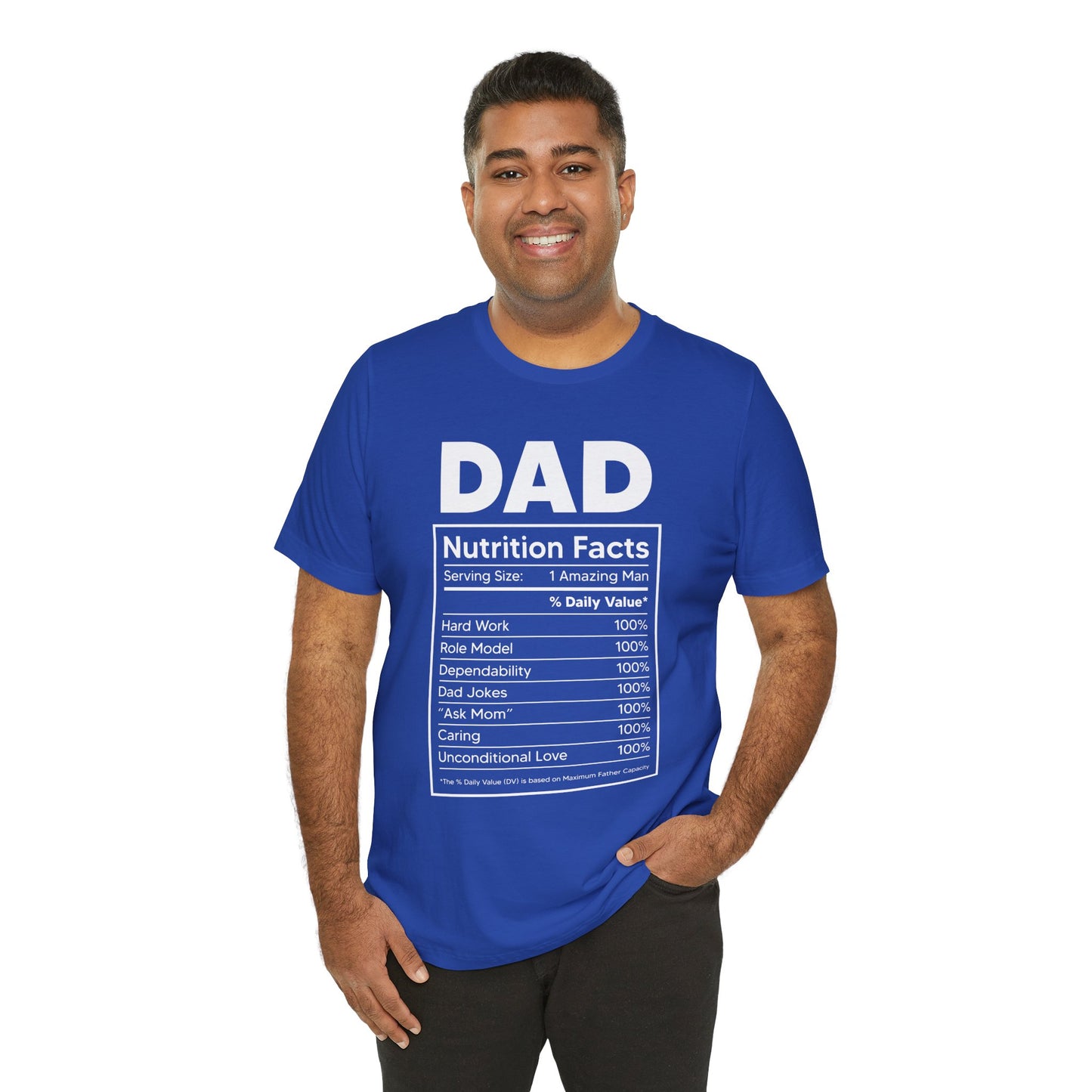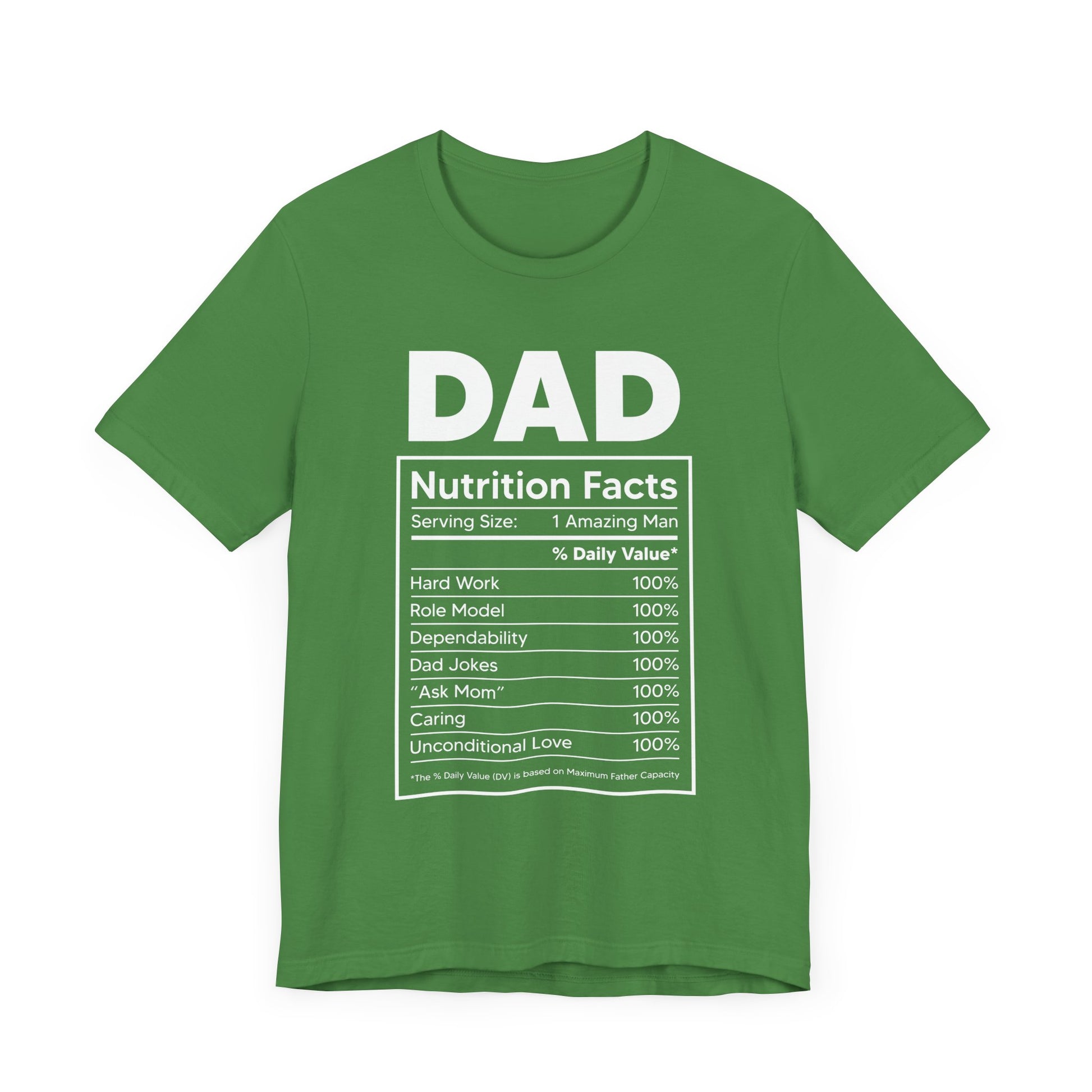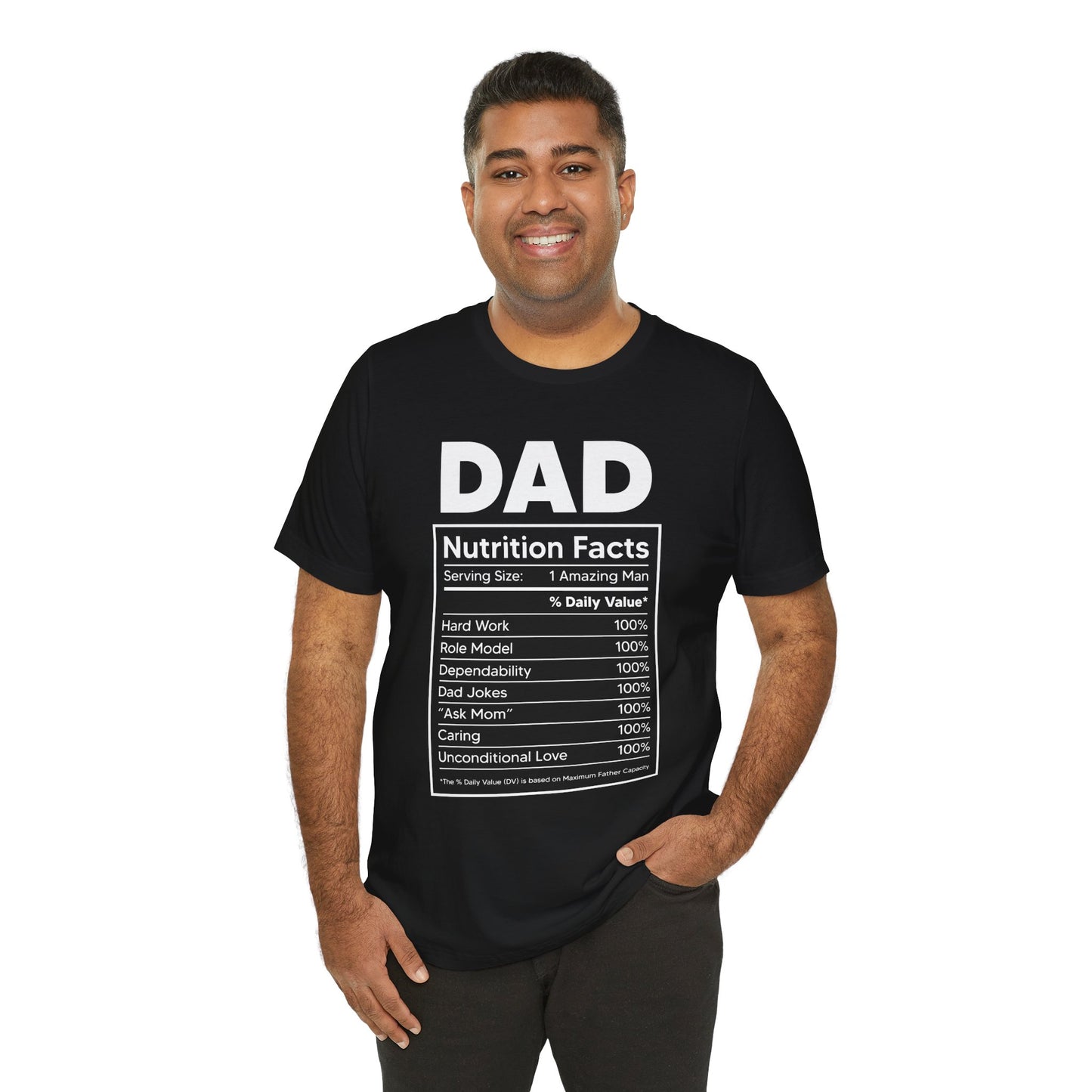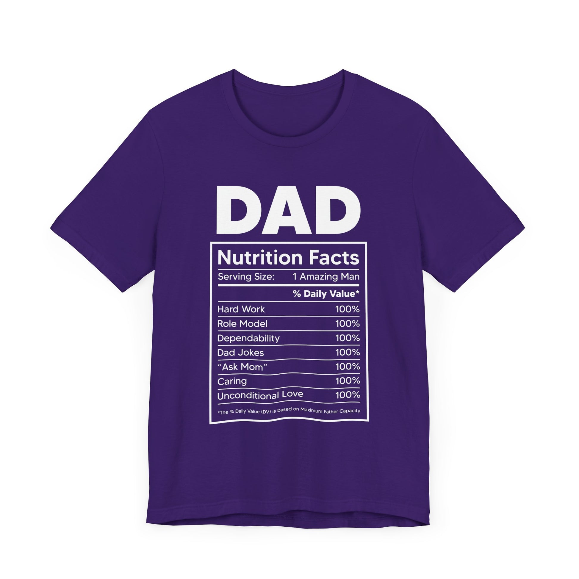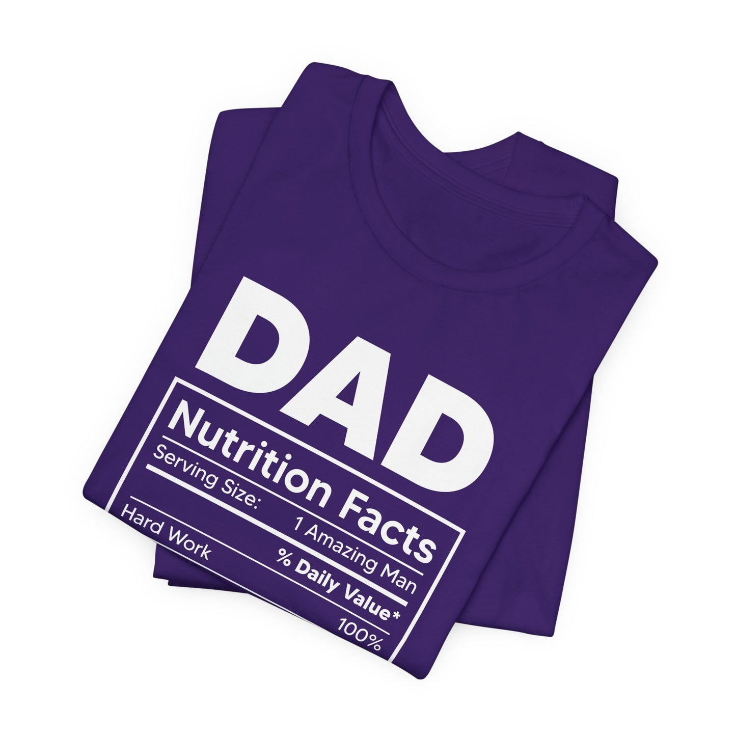 Showcase the essential qualities that make up the perfect dad with our Dad, Nutrition Facts Unisex Jersey Short Sleeve Tee. Featuring a playful and clever nutrition facts label, this tee is a fun way to celebrate all the love, strength, and humor that dads bring to the table.