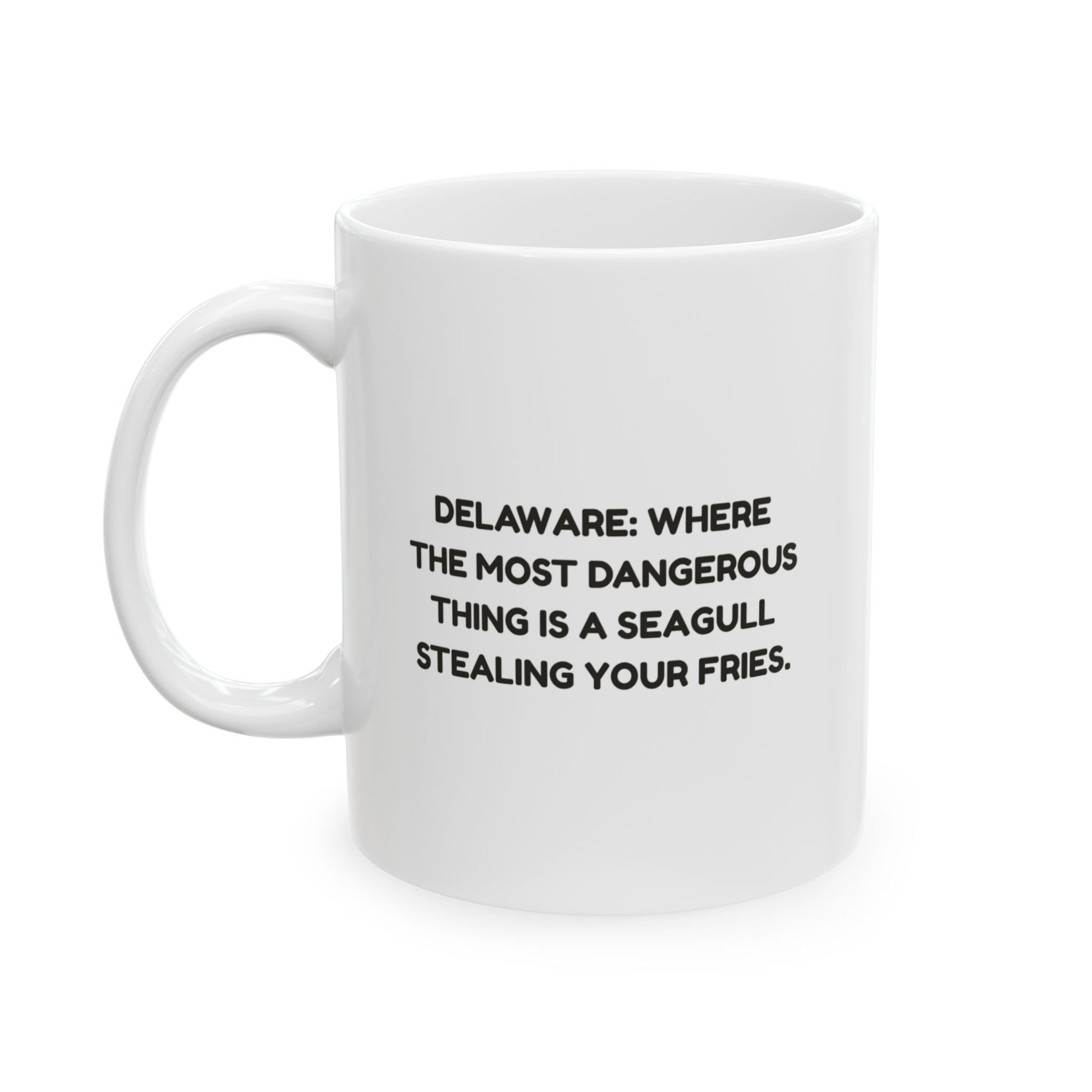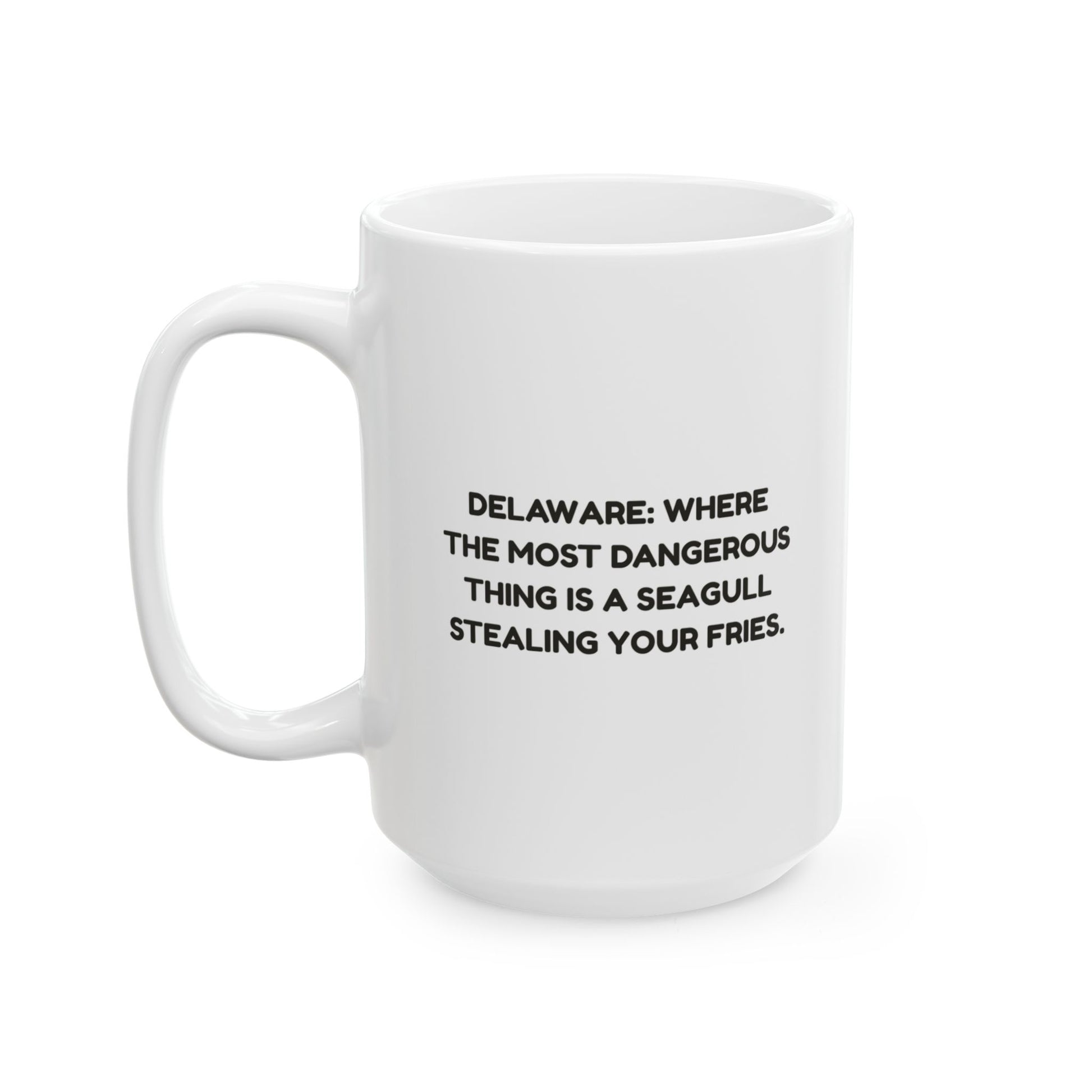 "Delaware: Where the most dangerous thing is a seagull stealing your fries." Ceramic Mug - 14125