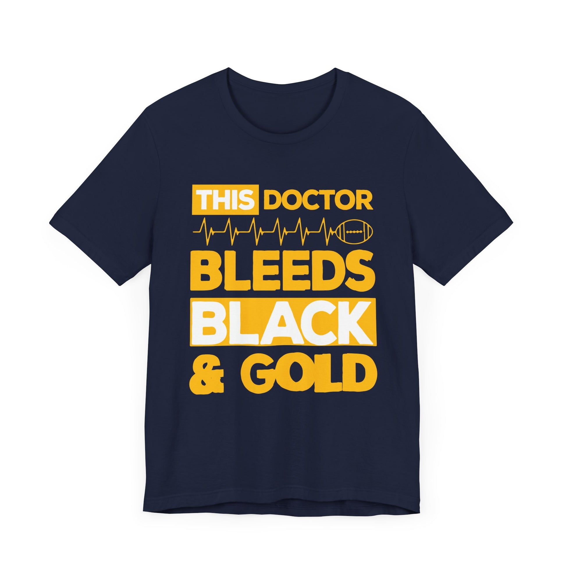 - Team Spirit Design: The bold statement "This Doctor Bleeds Black & Gold" proudly showcases your allegiance, making it a standout piece in any wardrobe.