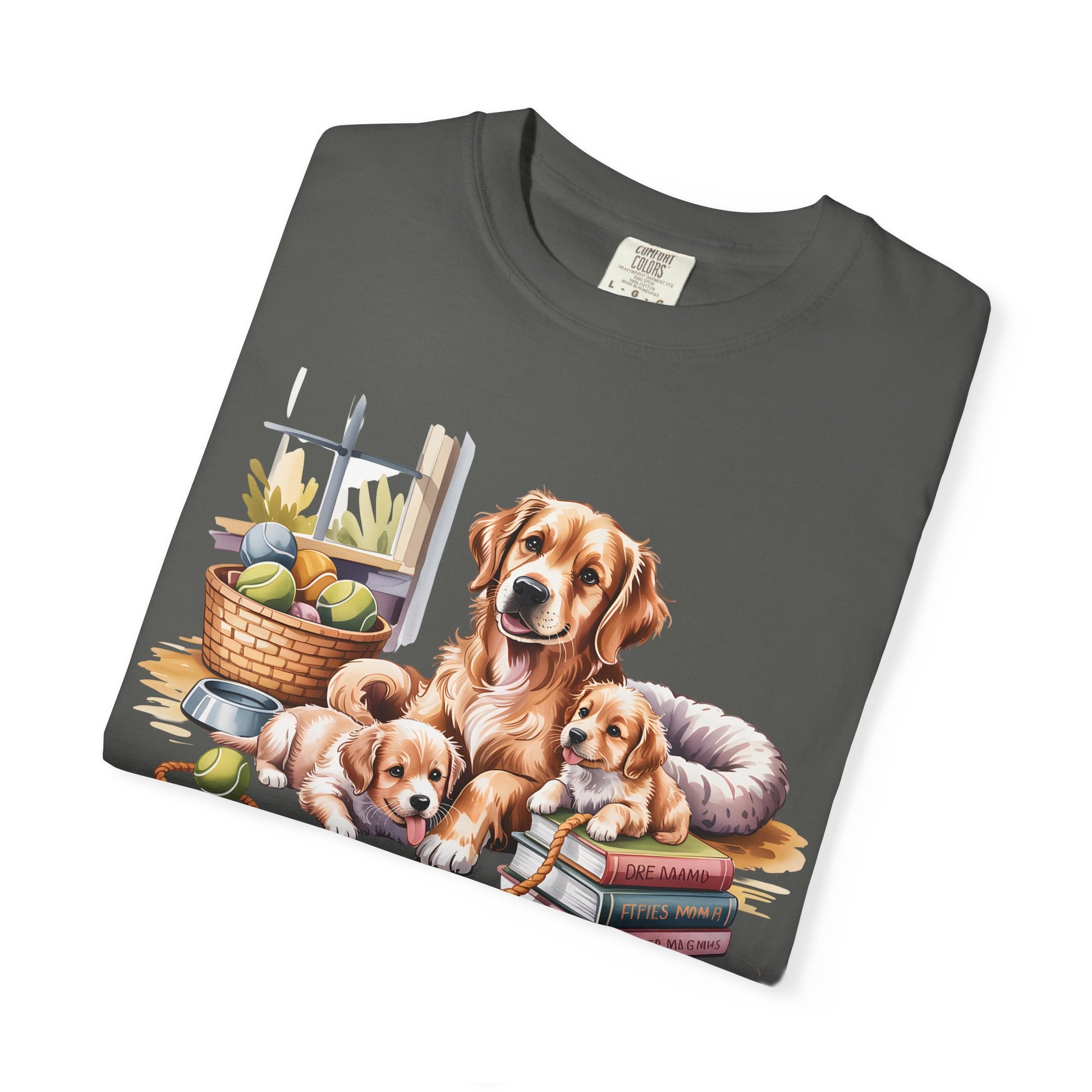 This adorable Golden Retriever puppy t-shirt celebrates the joy of being a proud dog mom. Featuring a heartwarming illustration of a loving mama dog and her playful pups, this shirt is perfect for casual days, dog park visits, coffee runs, or cozy nights at home with your furry family.