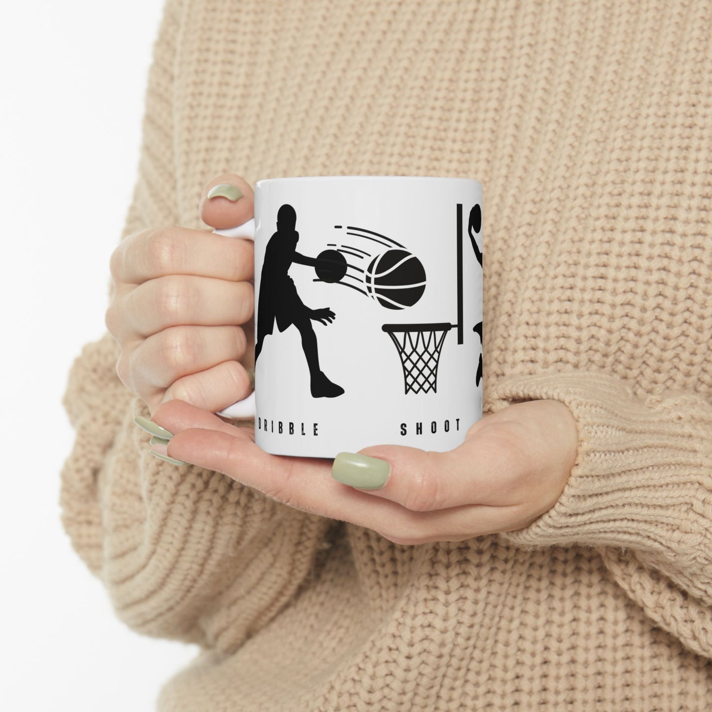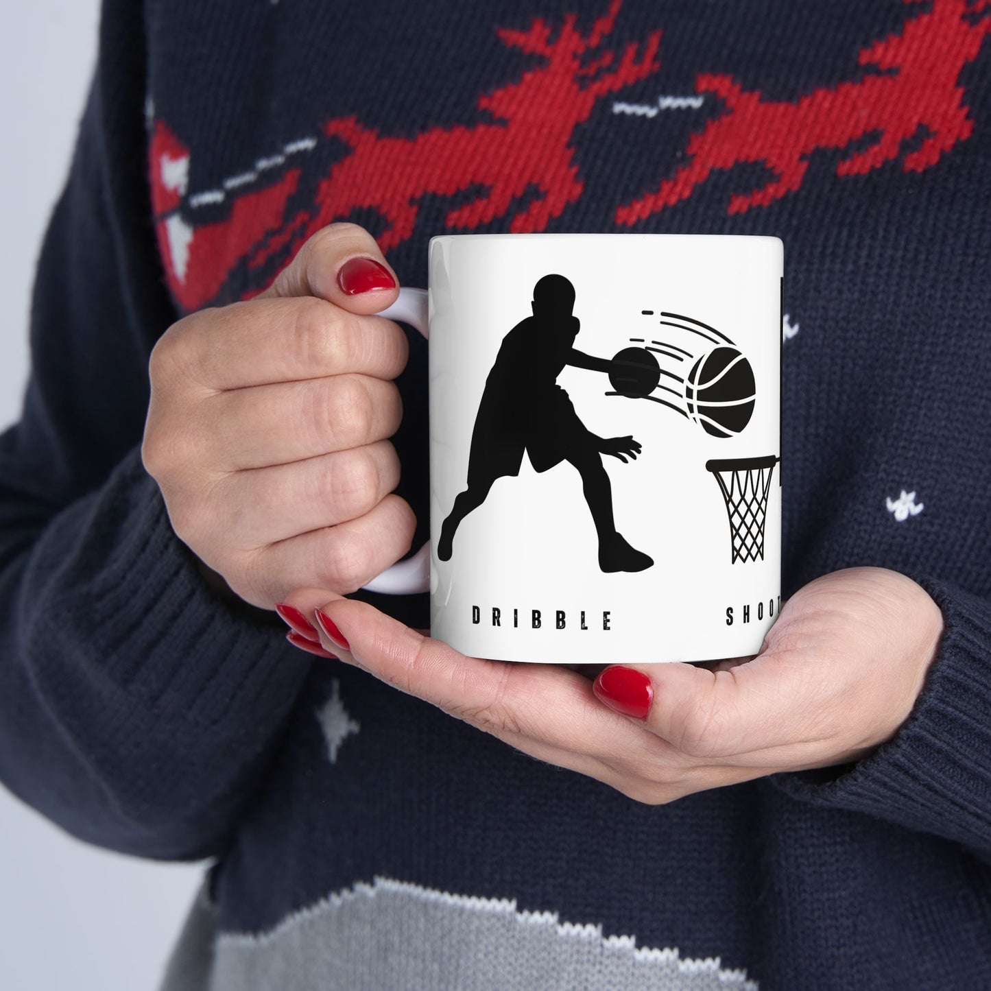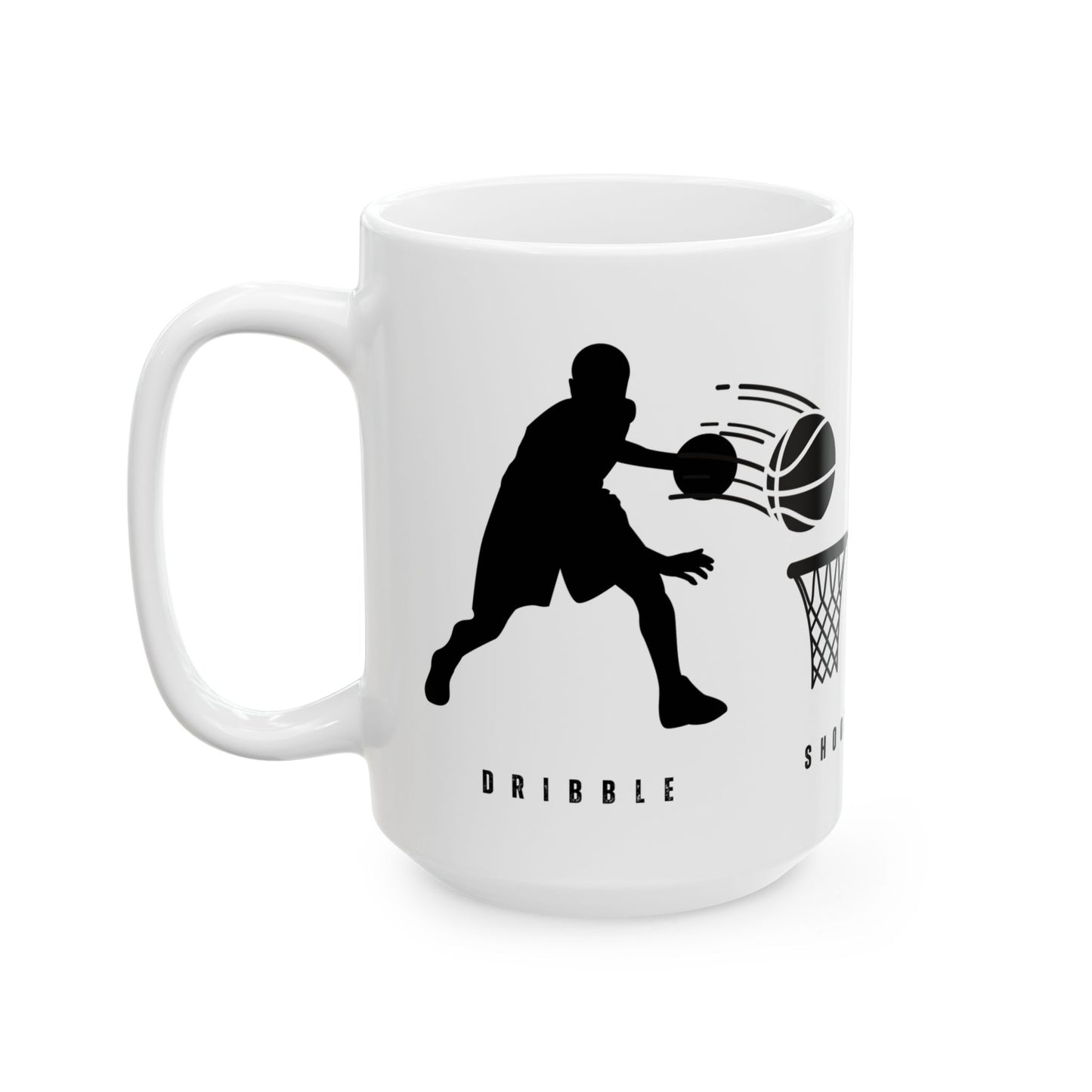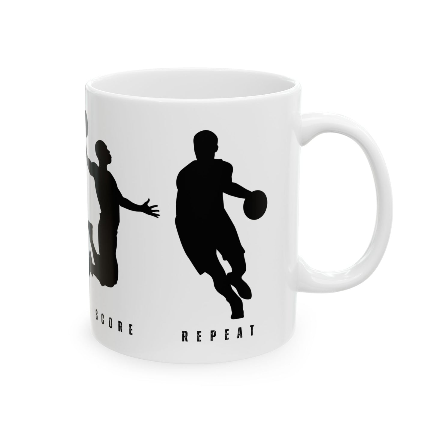 Fuel your passion for the game with the Dribble Shoot Score Repeat Ceramic Mug! Designed for basketball enthusiasts, this mug is perfect for sipping your favorite beverage while celebrating your love for the court.