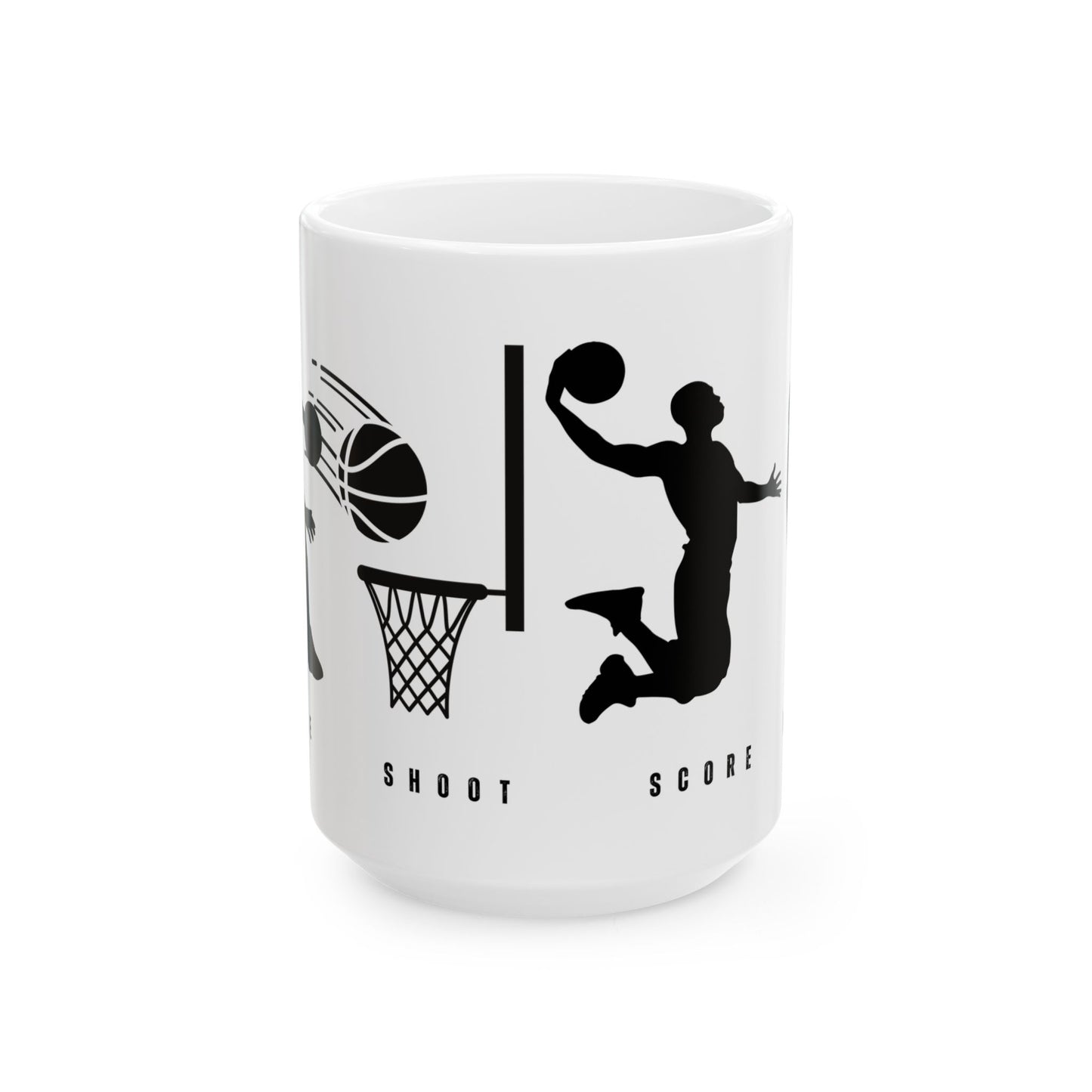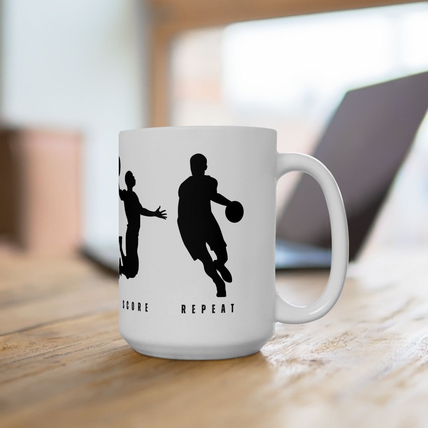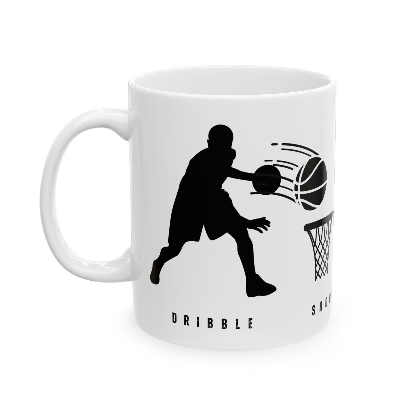 Fuel your passion for the game with the Dribble Shoot Score Repeat Ceramic Mug! Designed for basketball enthusiasts, this mug is perfect for sipping your favorite beverage while celebrating your love for the court.