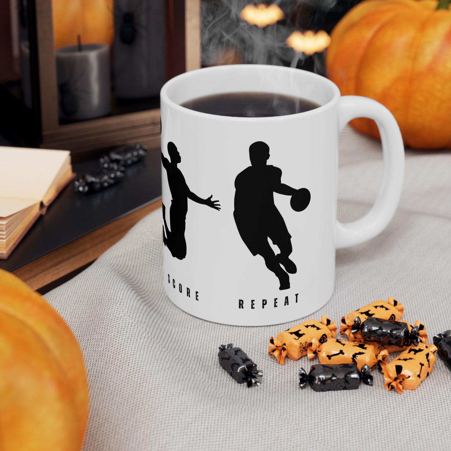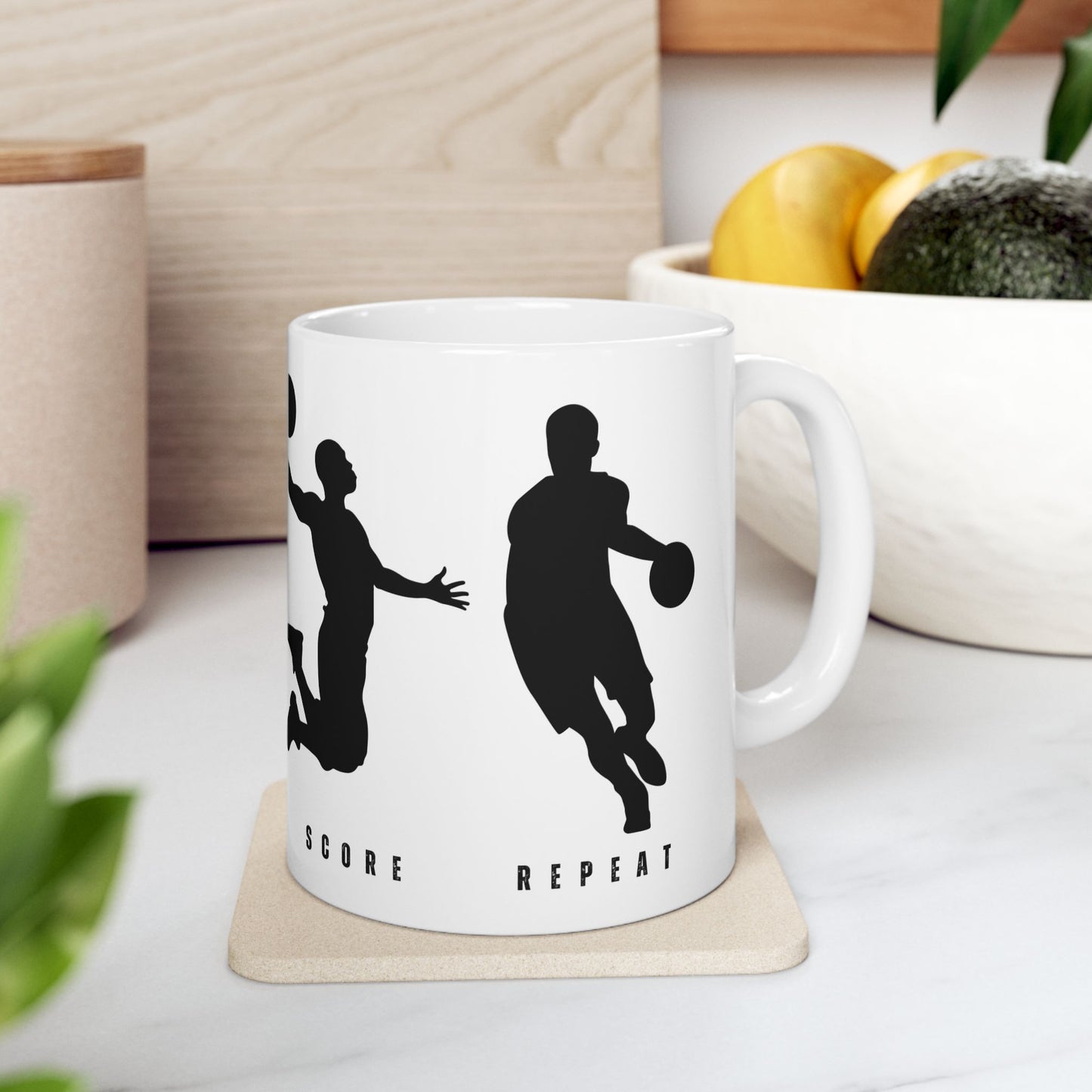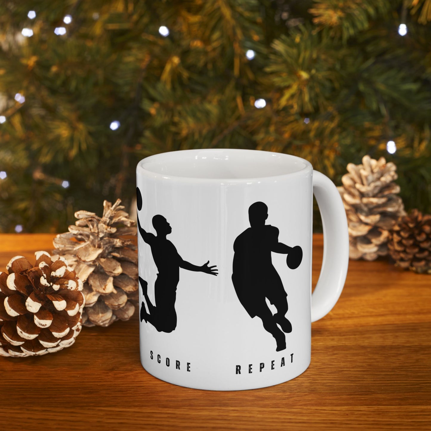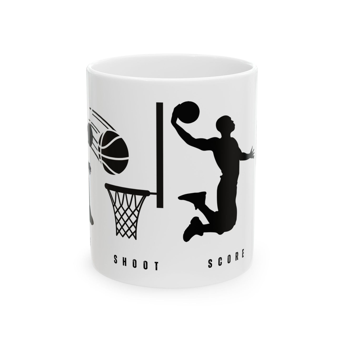 Fuel your passion for the game with the Dribble Shoot Score Repeat Ceramic Mug! Designed for basketball enthusiasts, this mug is perfect for sipping your favorite beverage while celebrating your love for the court.