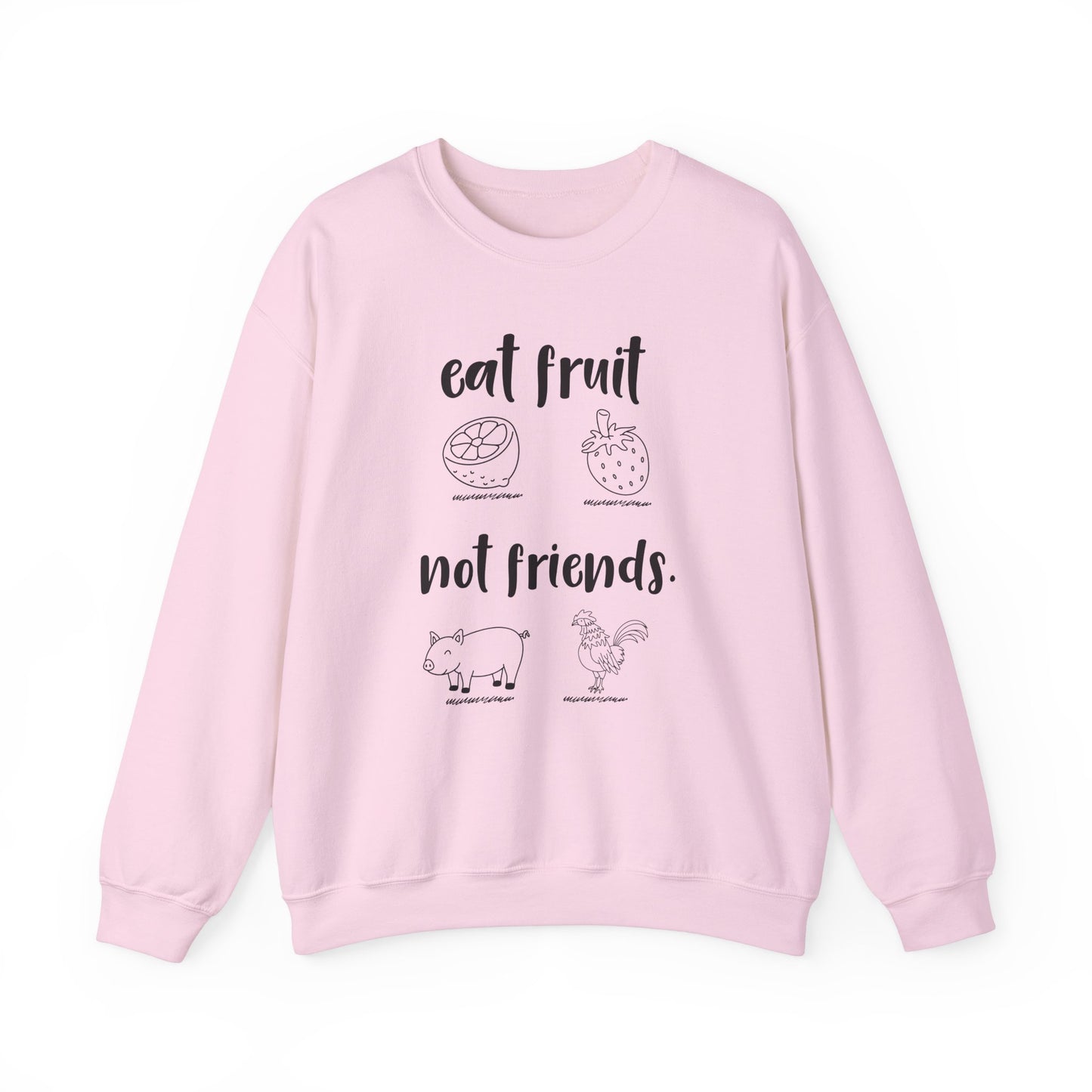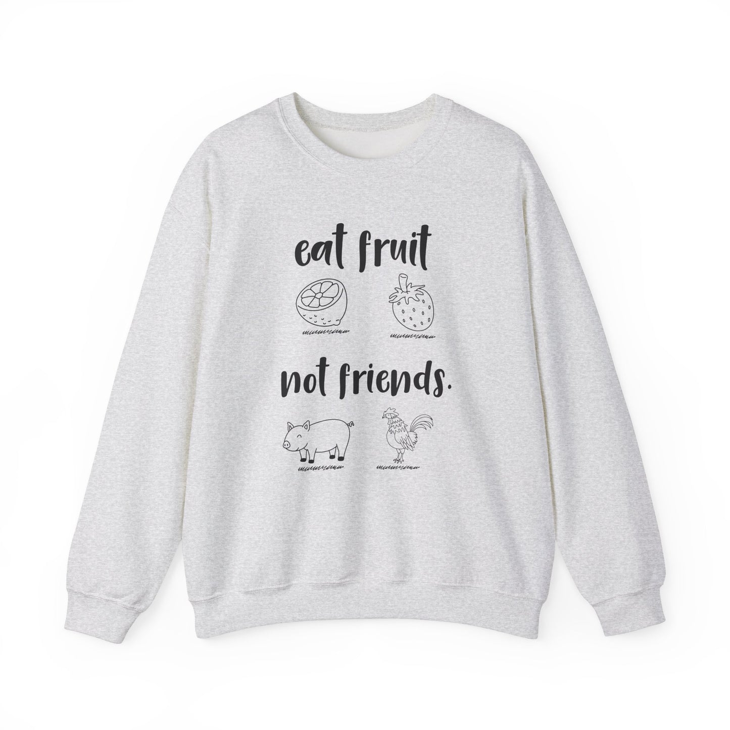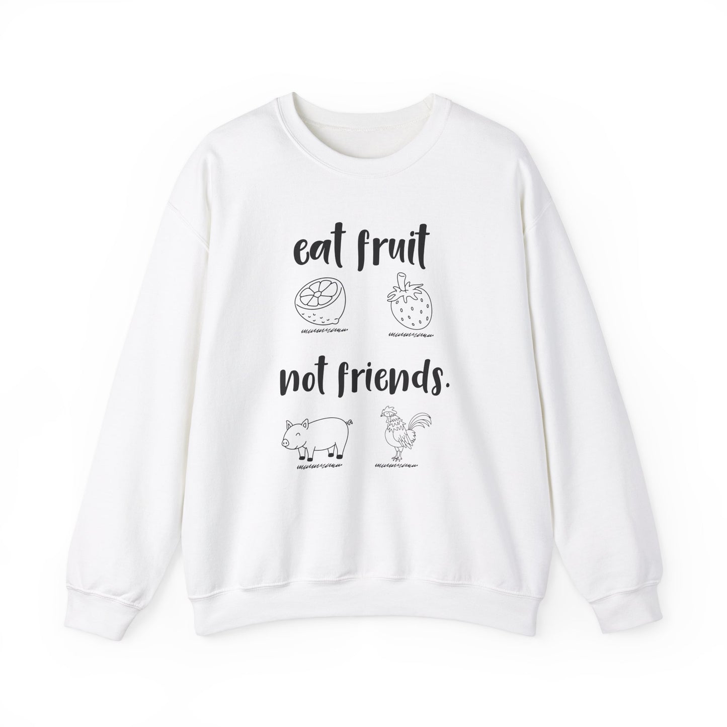 Celebrate your love for all living beings with this cozy and statement-making crewneck sweatshirt! Featuring the playful and powerful slogan, "Eat Fruits, Not Friends," this sweatshirt lets you wear your values proudly and inspire others along the way.