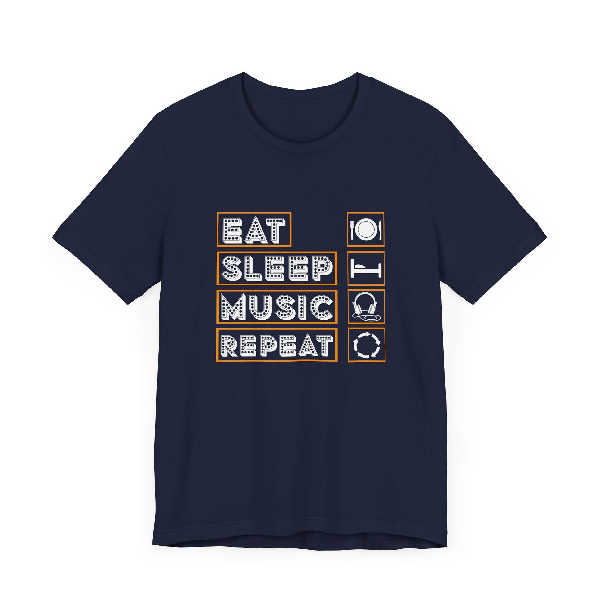 Keep the rhythm of life going strong with our "Eat Sleep Music Repeat" Unisex Jersey Short Sleeve Tee. Whether you’re jamming at a concert, relaxing at home, or enjoying a day out, this tee is the perfect way to showcase your love for music. Get yours today and let your passion for music shine through!