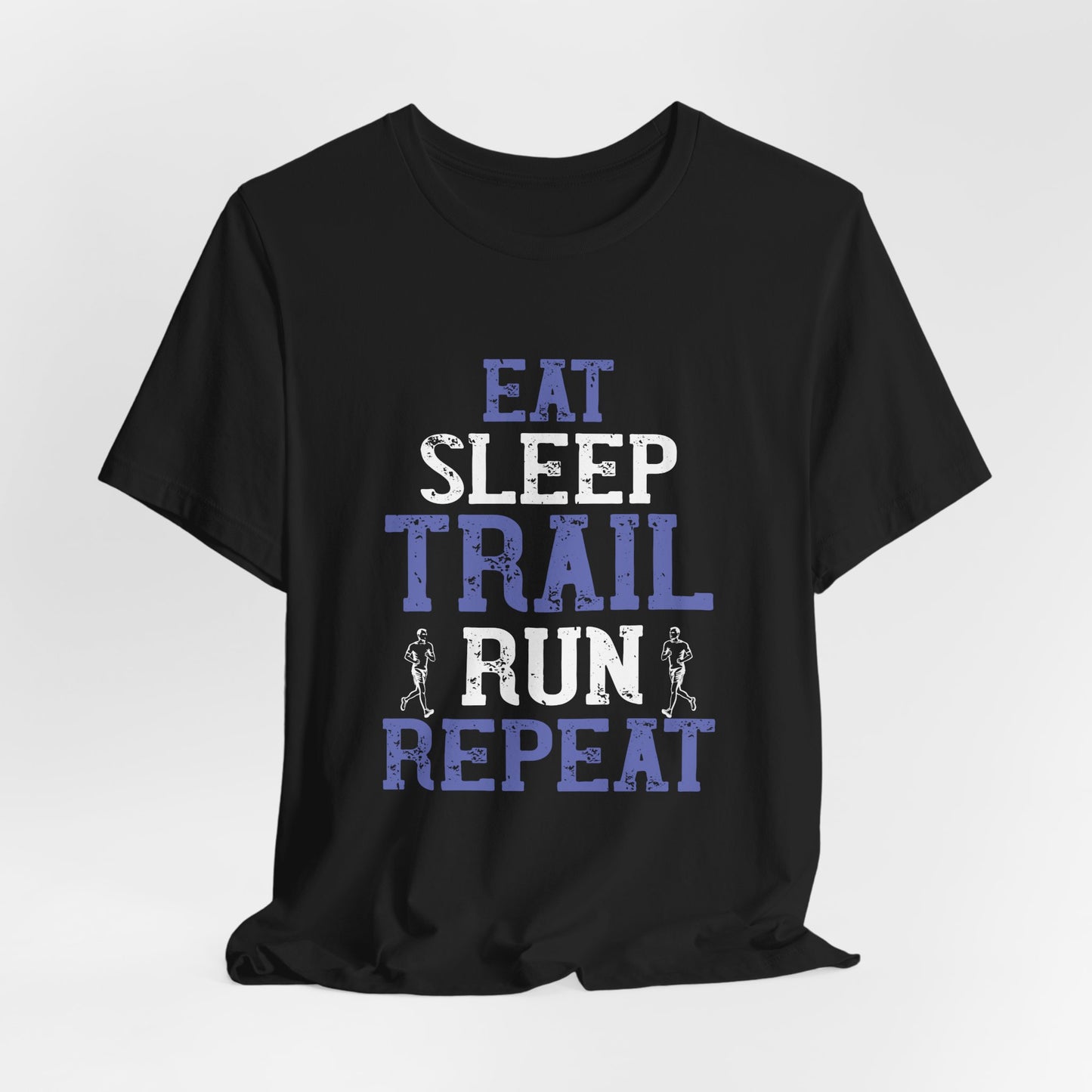 Bold Graphic: Featuring a striking "Eat, Sleep, Trail Run, Repeat" graphic, this tee is a statement piece that showcases your passion for trail running. The design is printed using high-quality, eco-friendly inks that ensure long-lasting vibrancy.