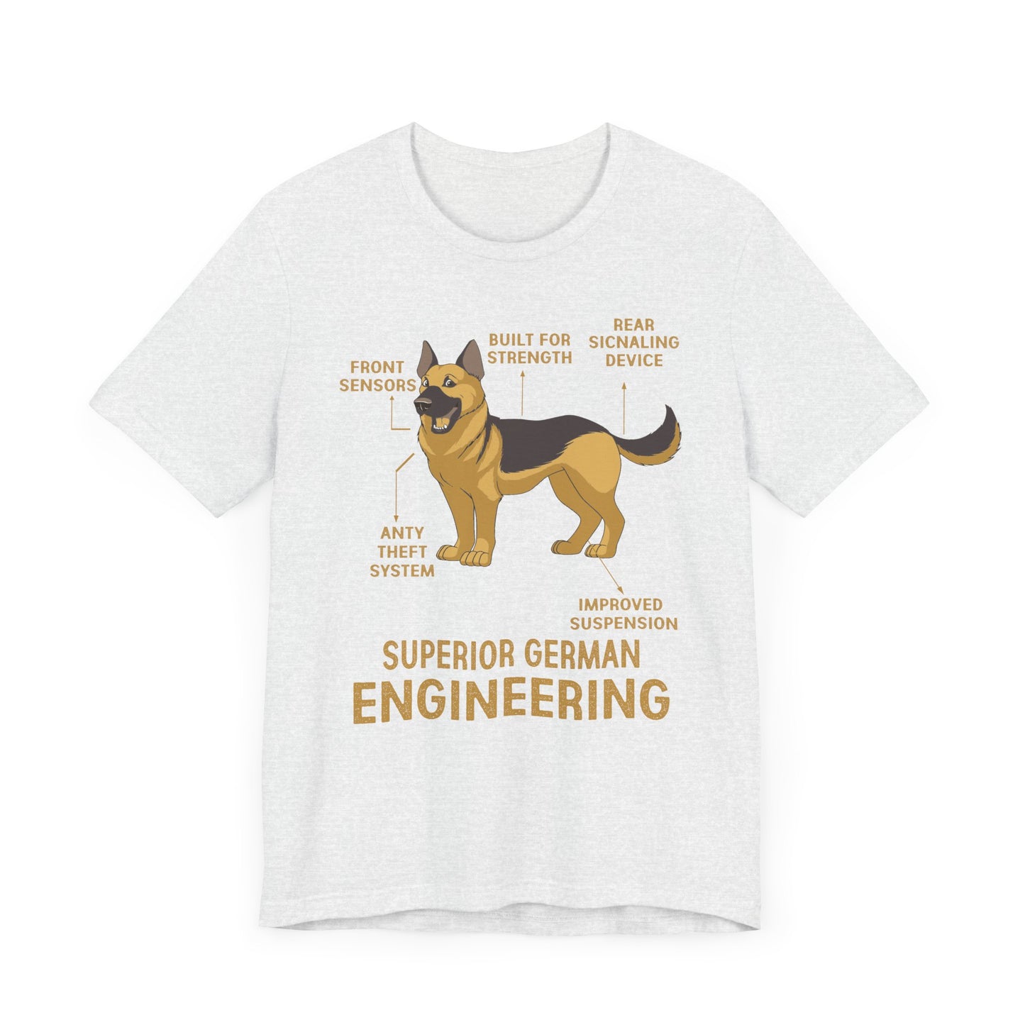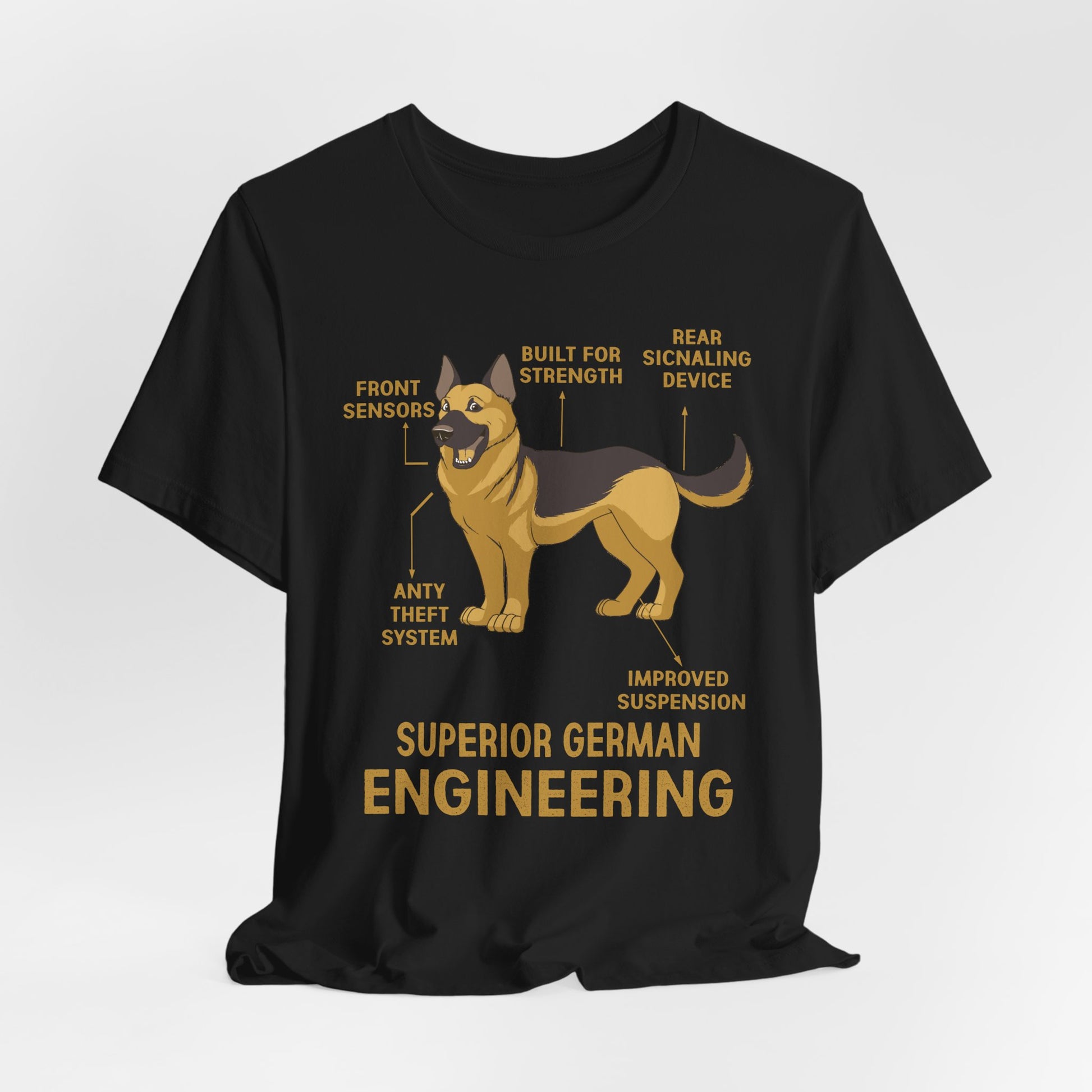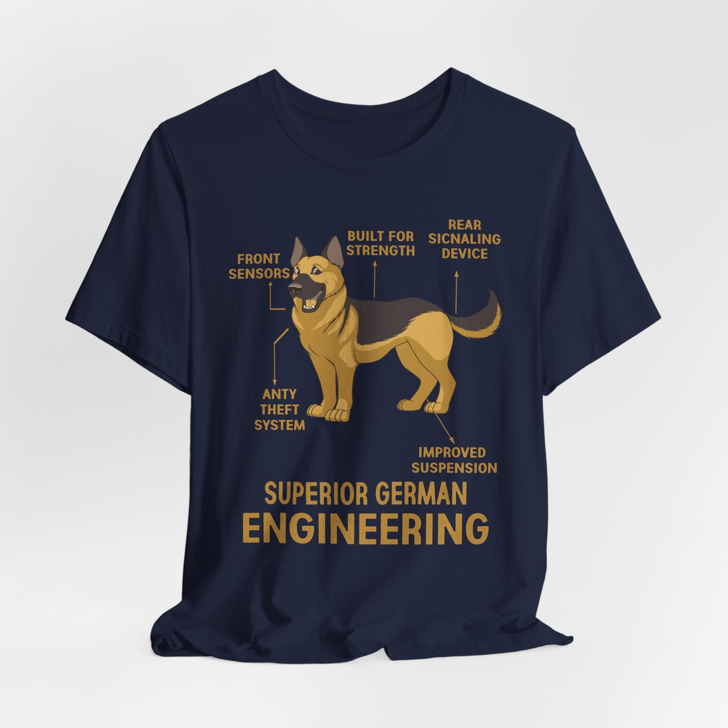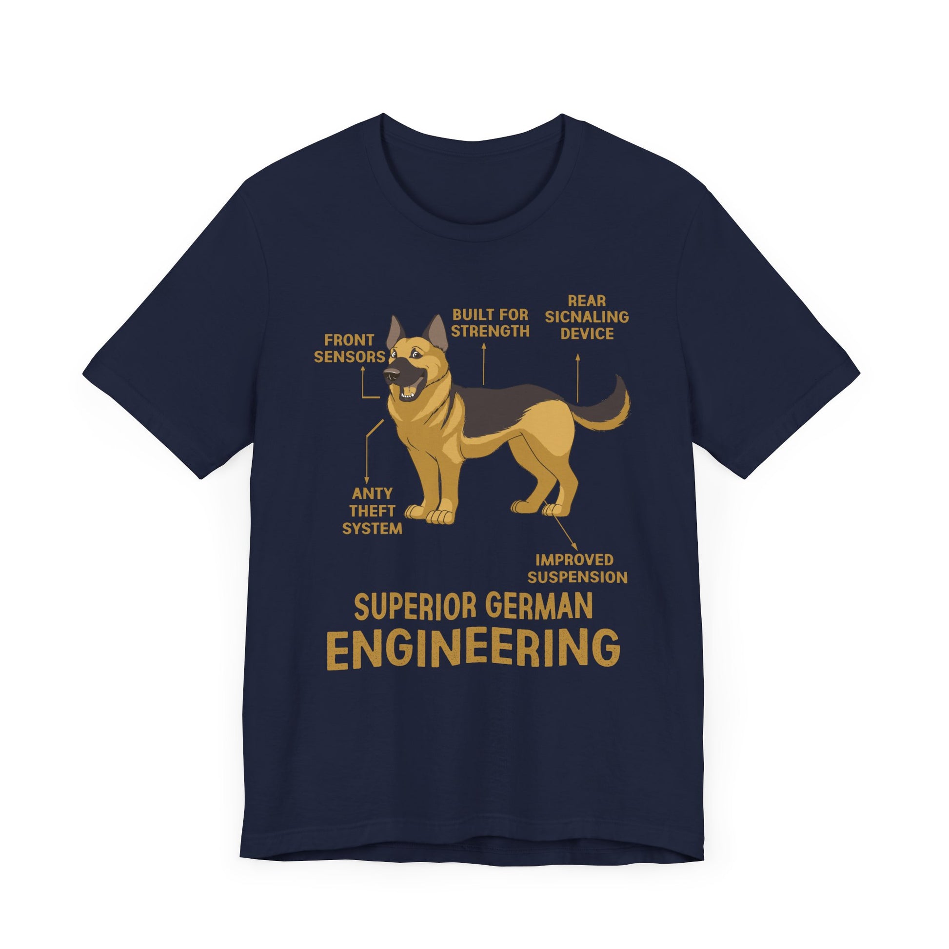 Celebrate the excellence of German engineering with a humorous twist by honoring the beloved German Shepherd. This unisex jersey short sleeve tee is perfect for dog lovers and engineering enthusiasts alike.