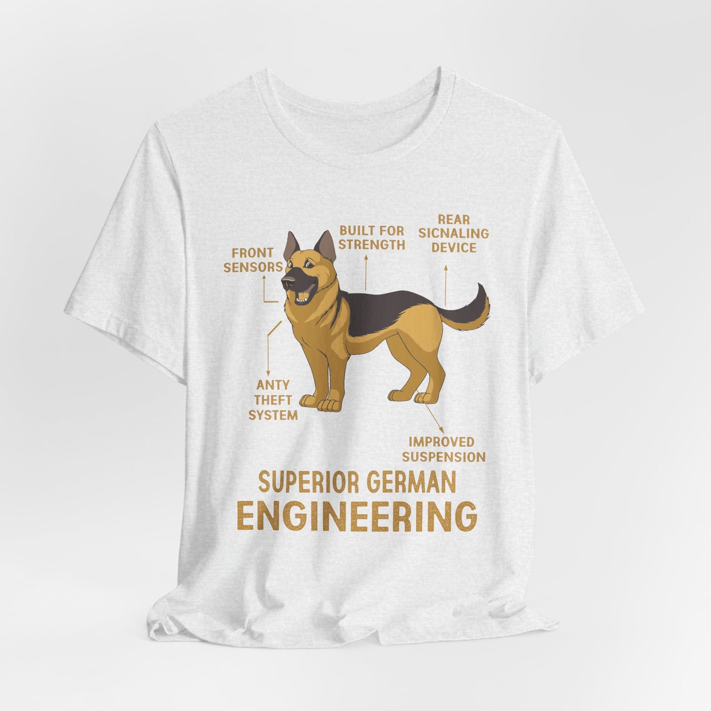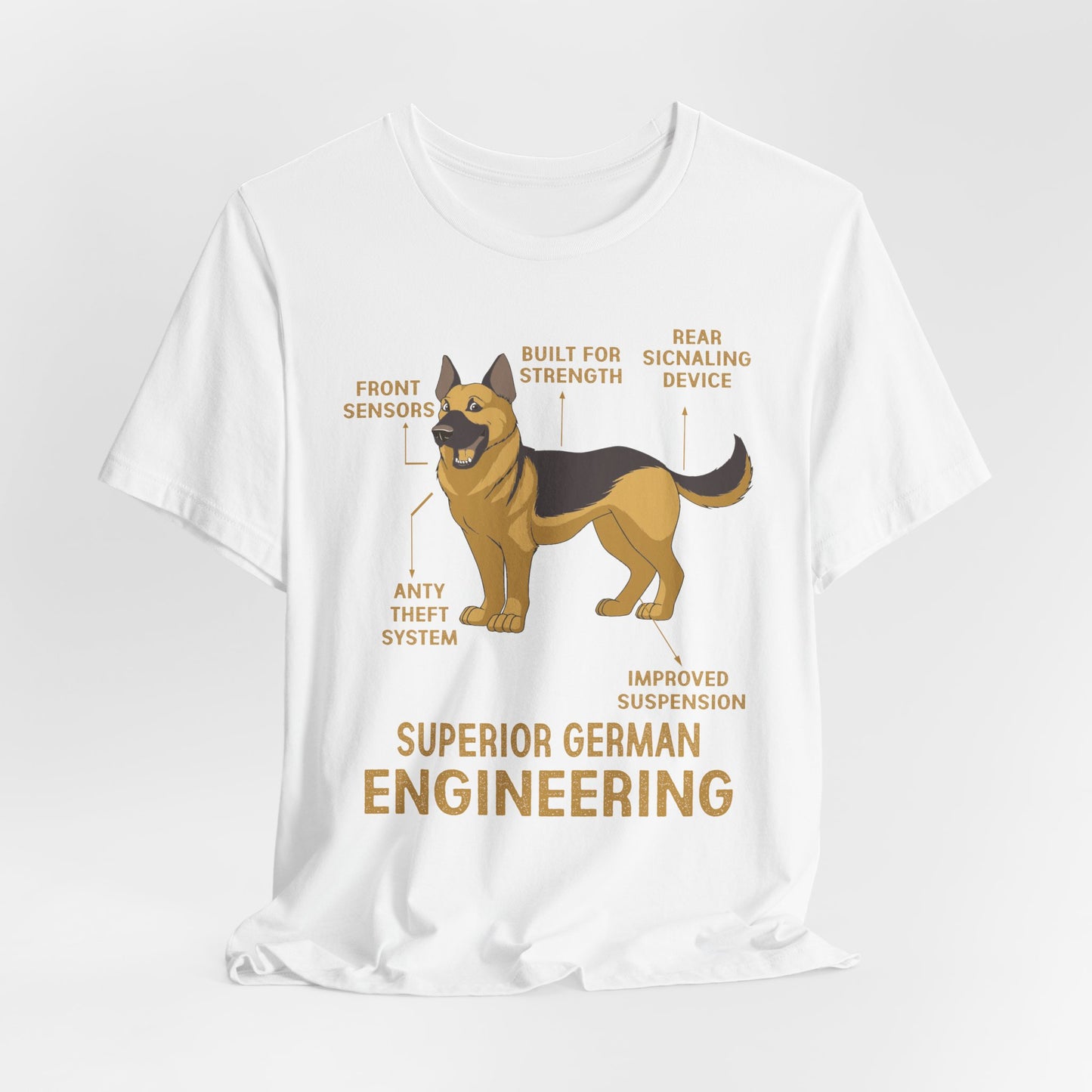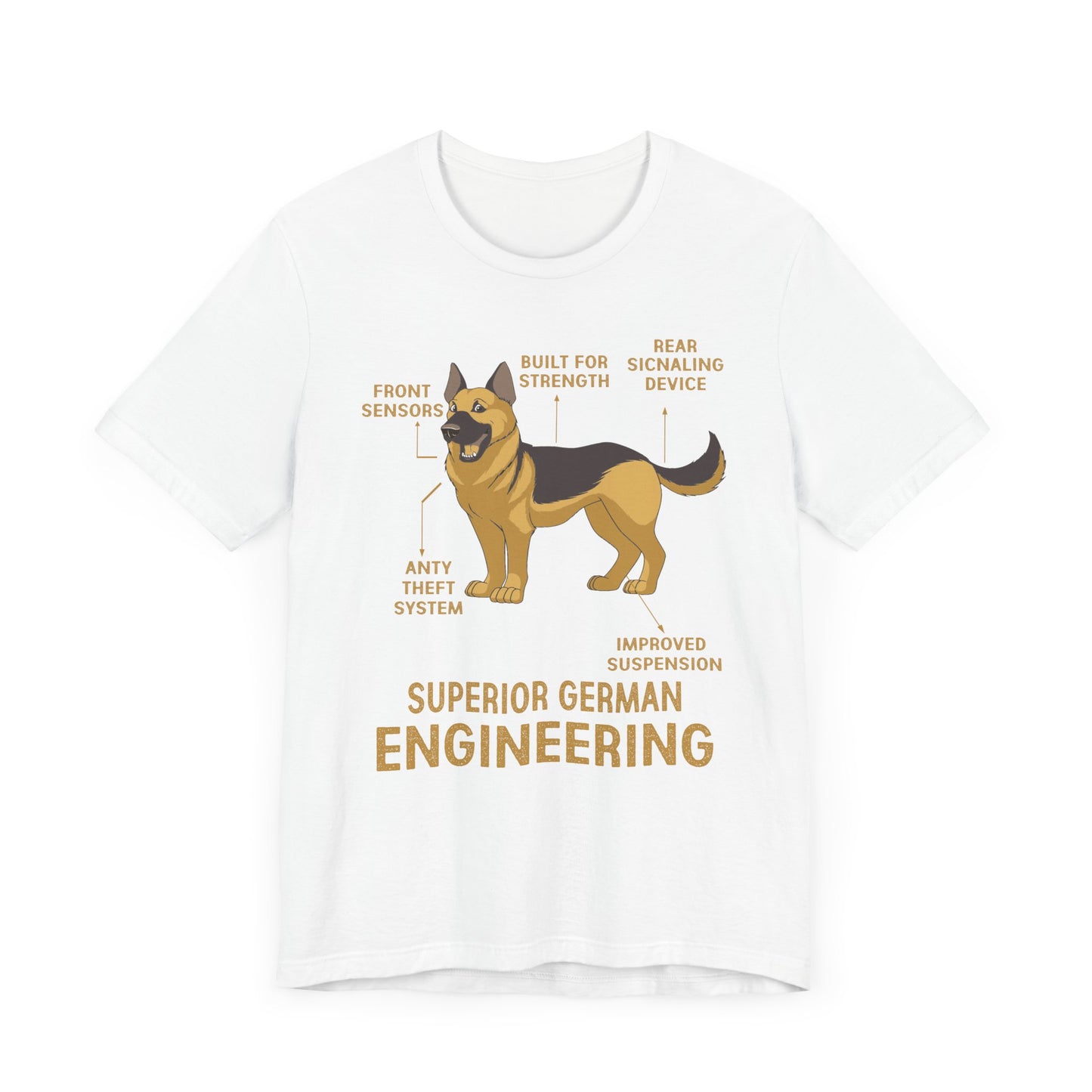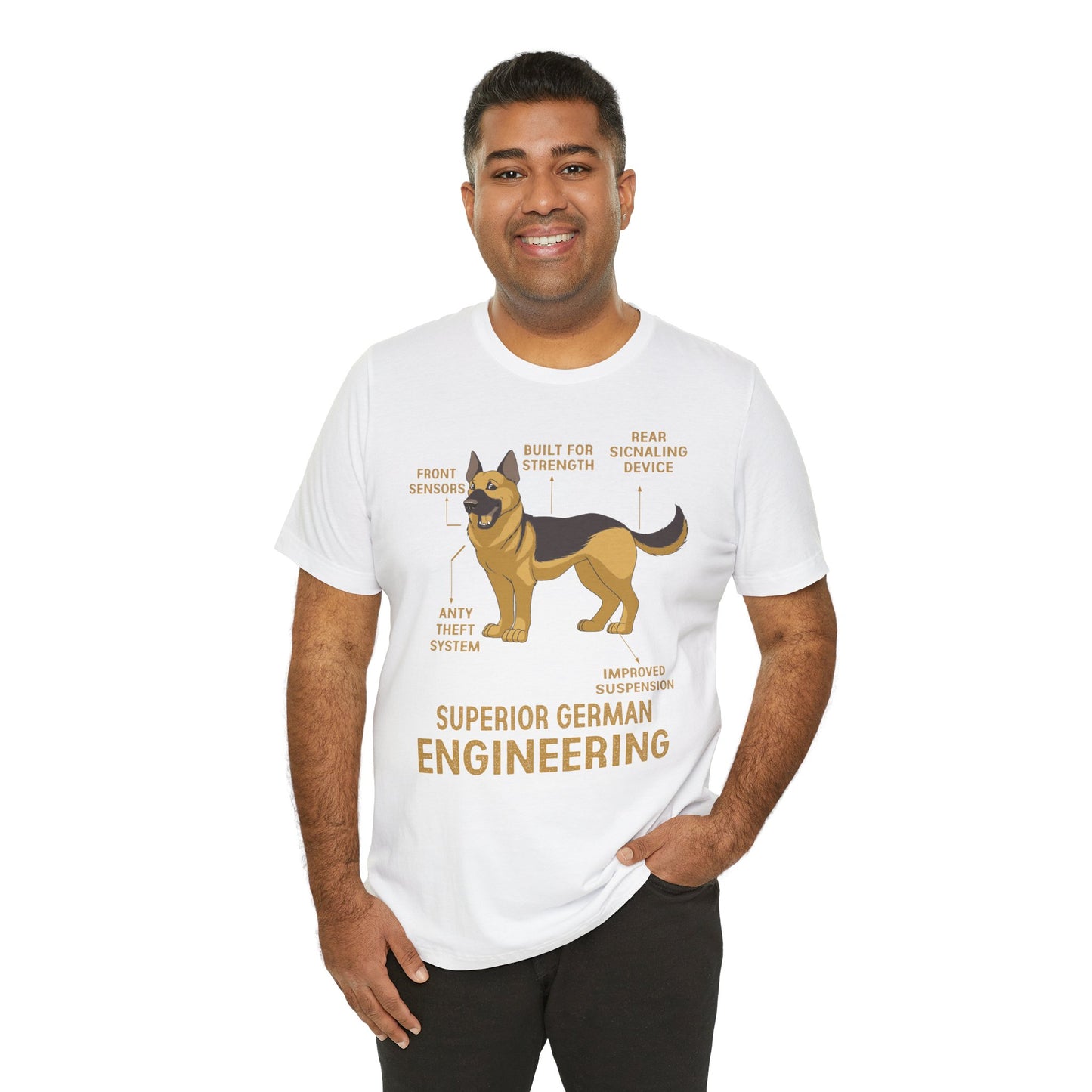 Celebrate the excellence of German engineering with a humorous twist by honoring the beloved German Shepherd. This unisex jersey short sleeve tee is perfect for dog lovers and engineering enthusiasts alike.