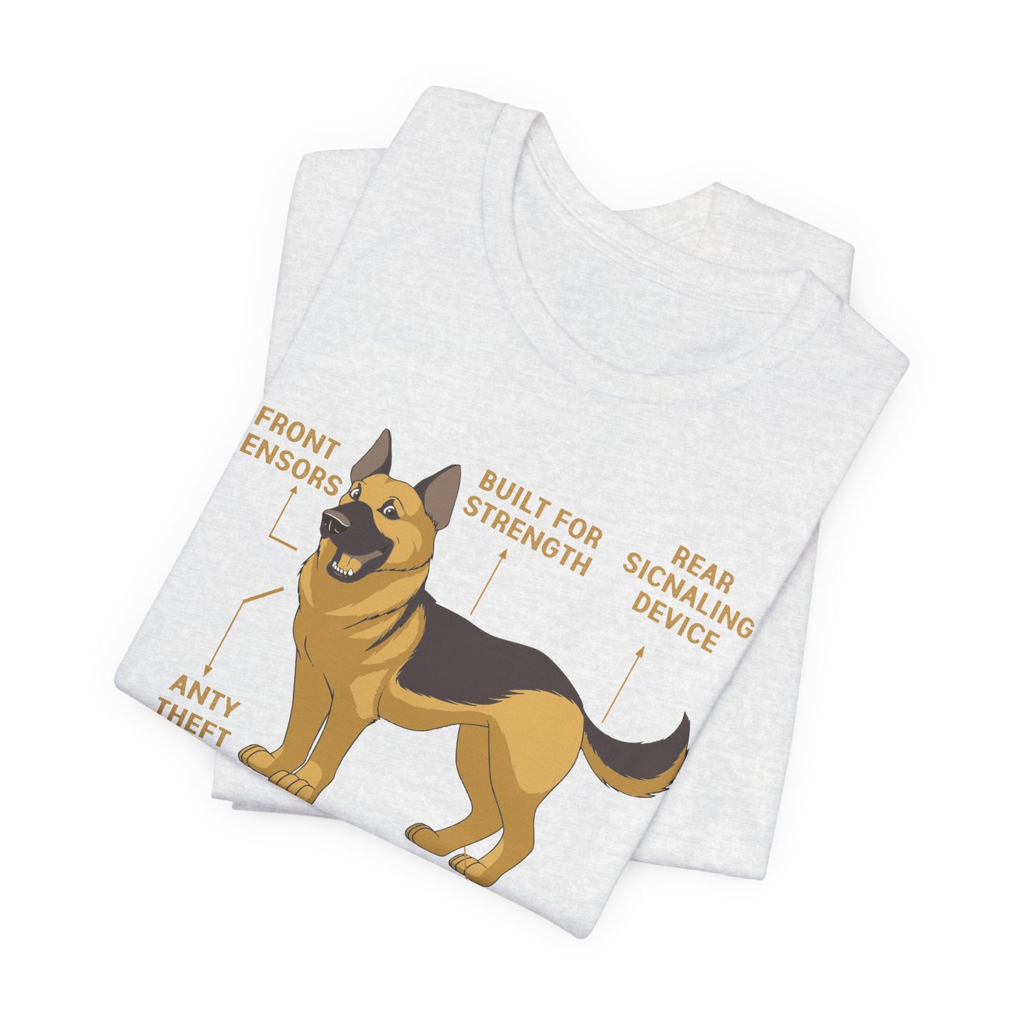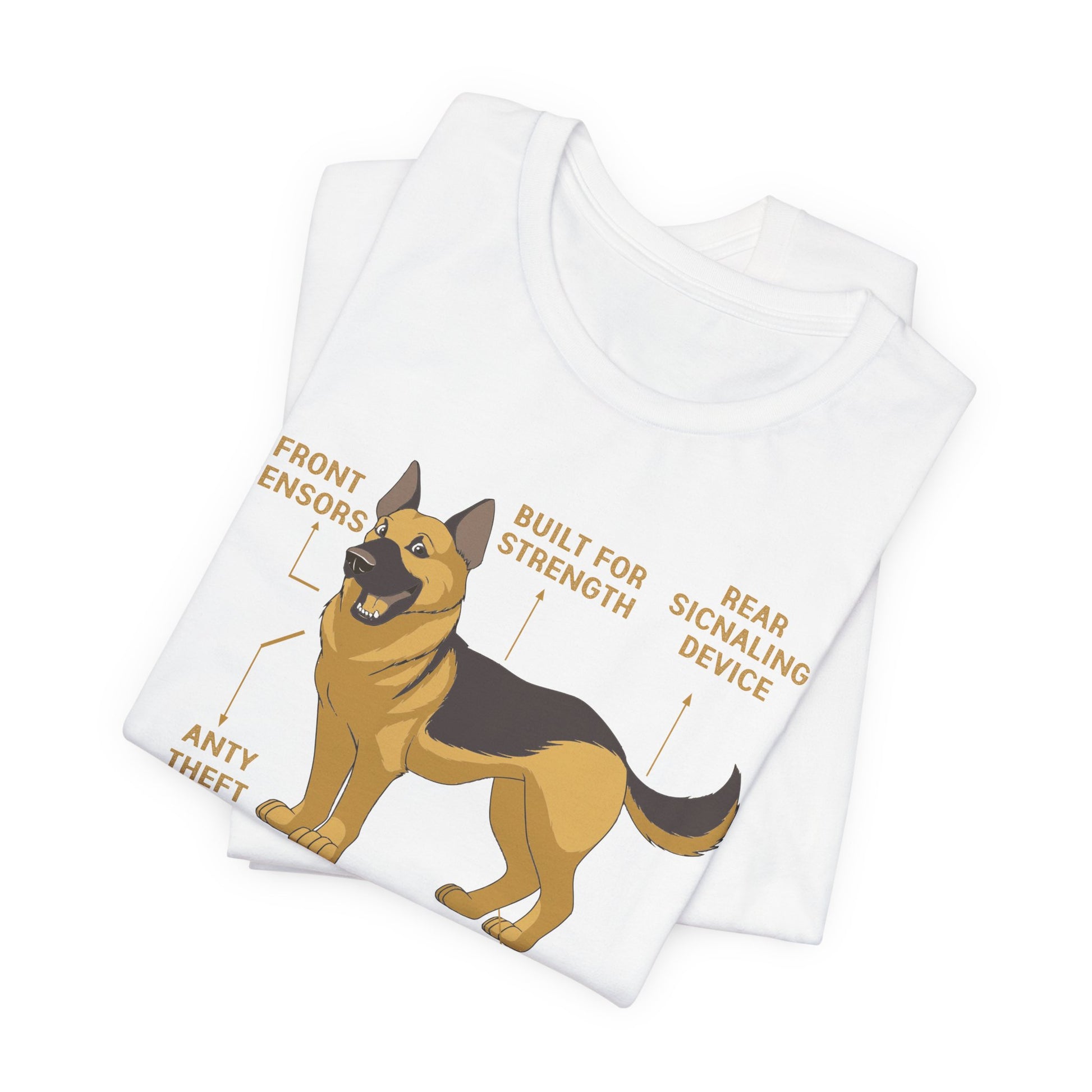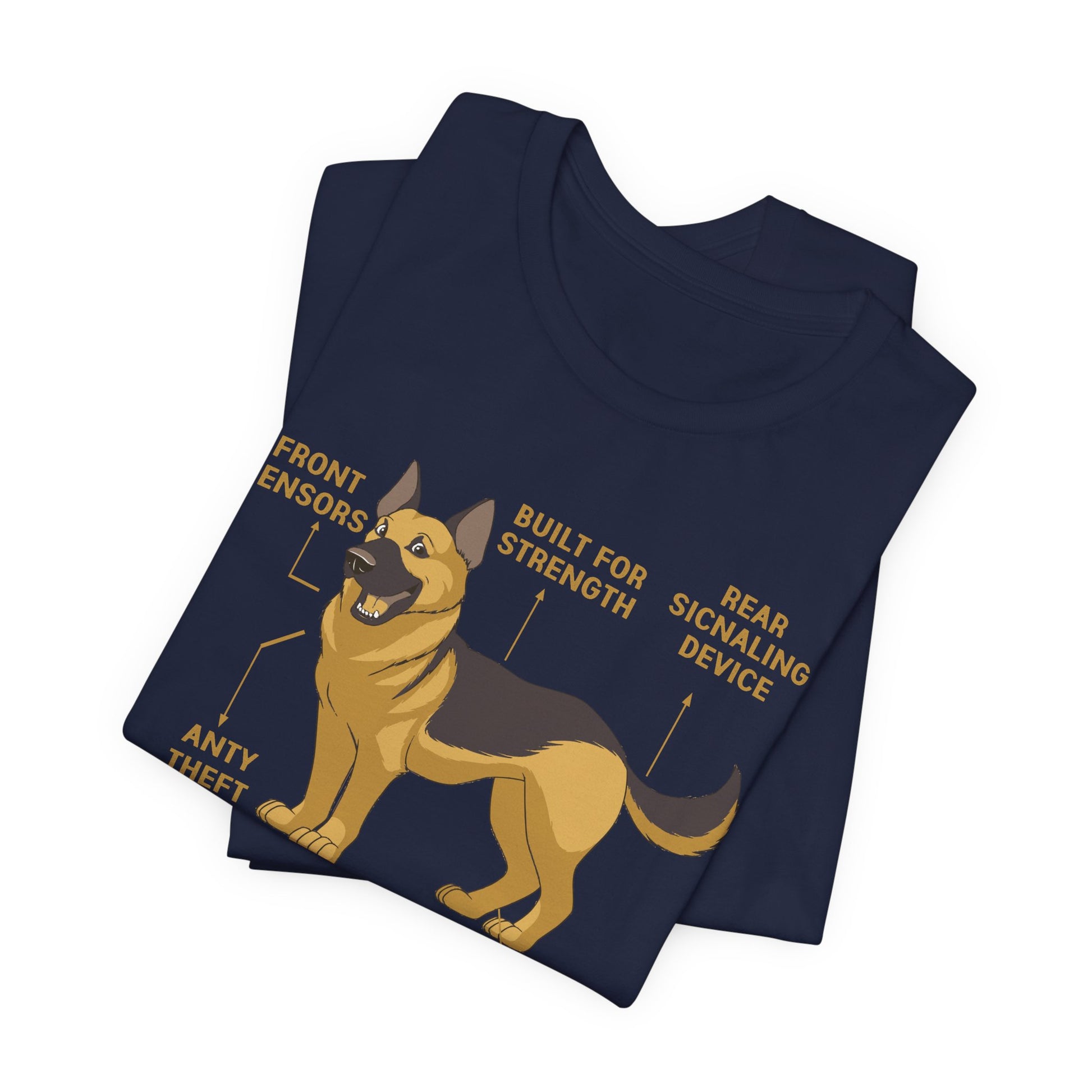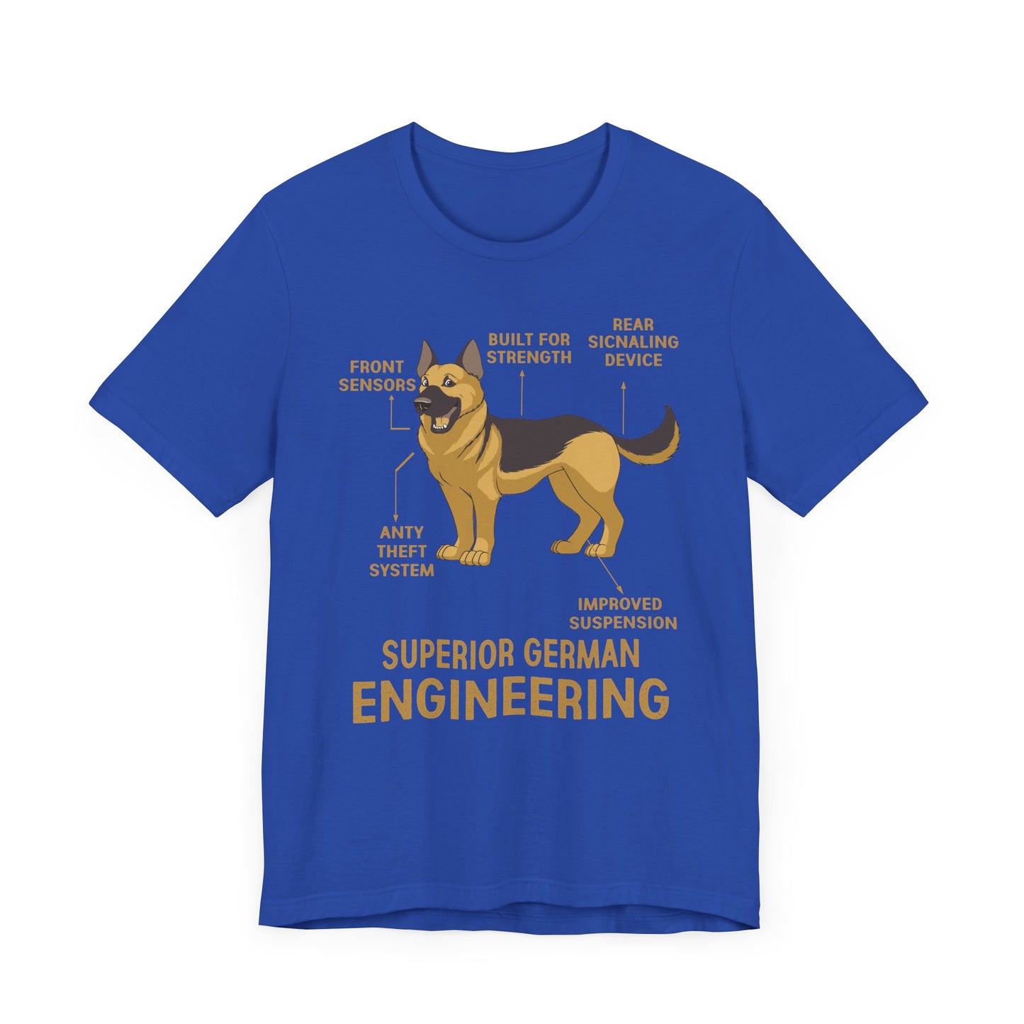 Celebrate the excellence of German engineering with a humorous twist by honoring the beloved German Shepherd. This unisex jersey short sleeve tee is perfect for dog lovers and engineering enthusiasts alike.