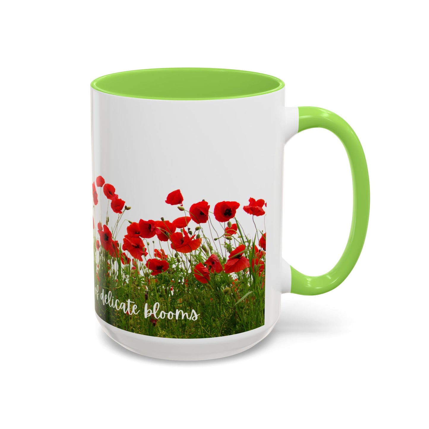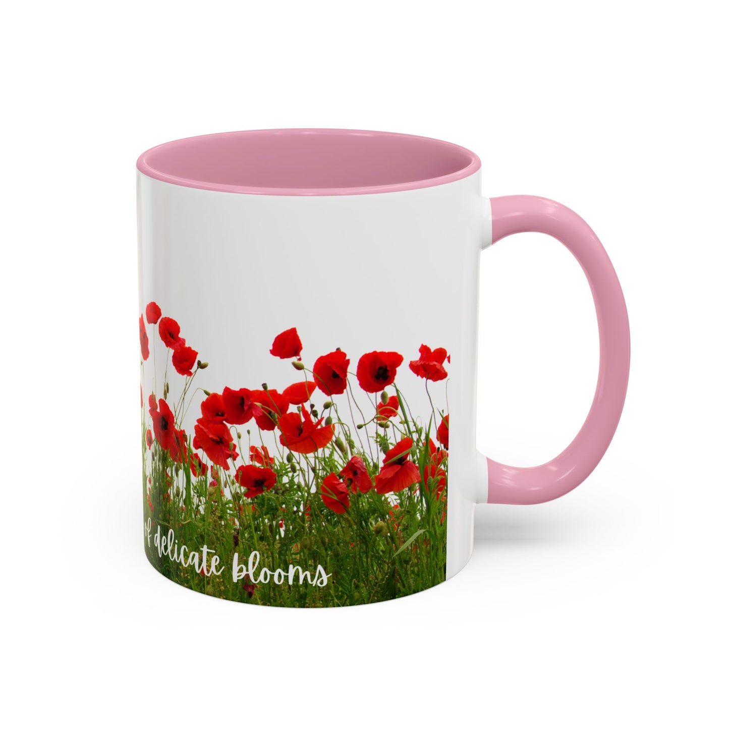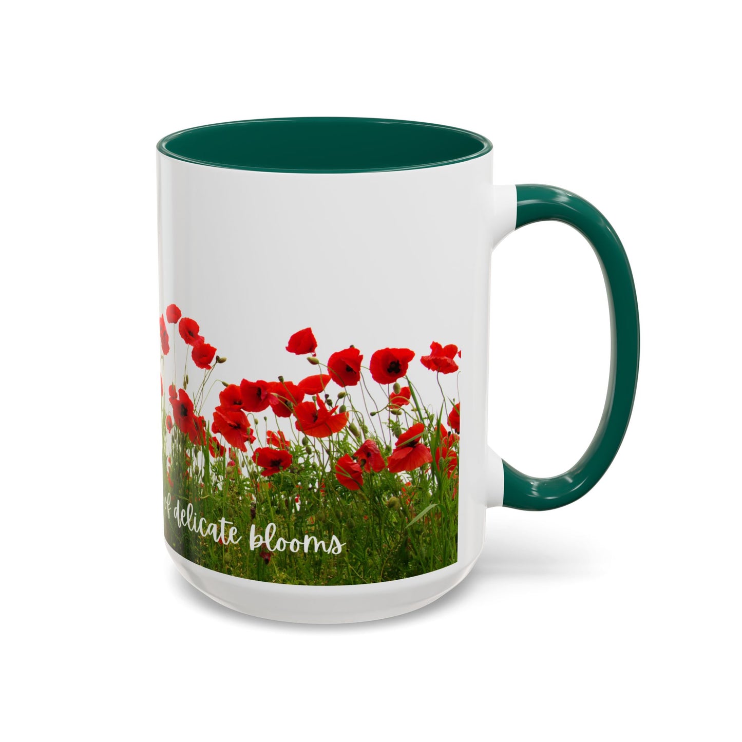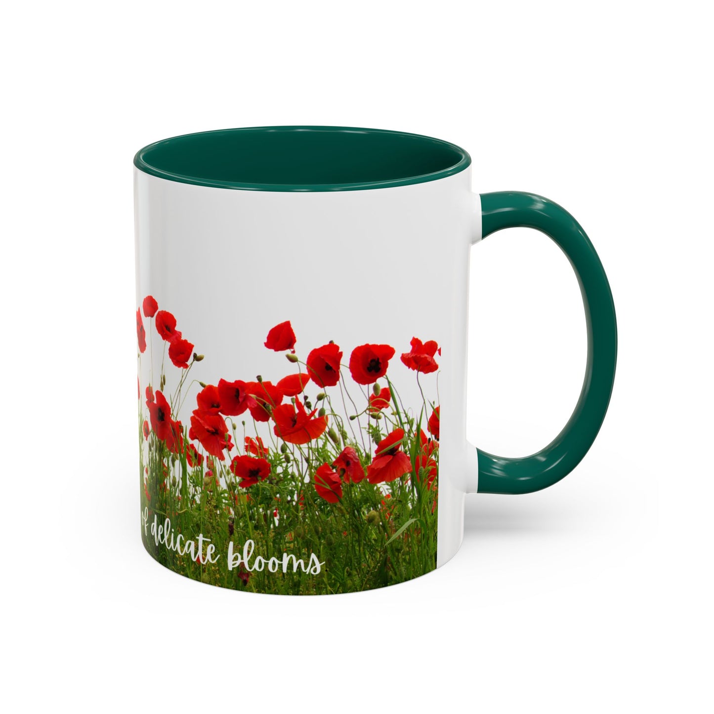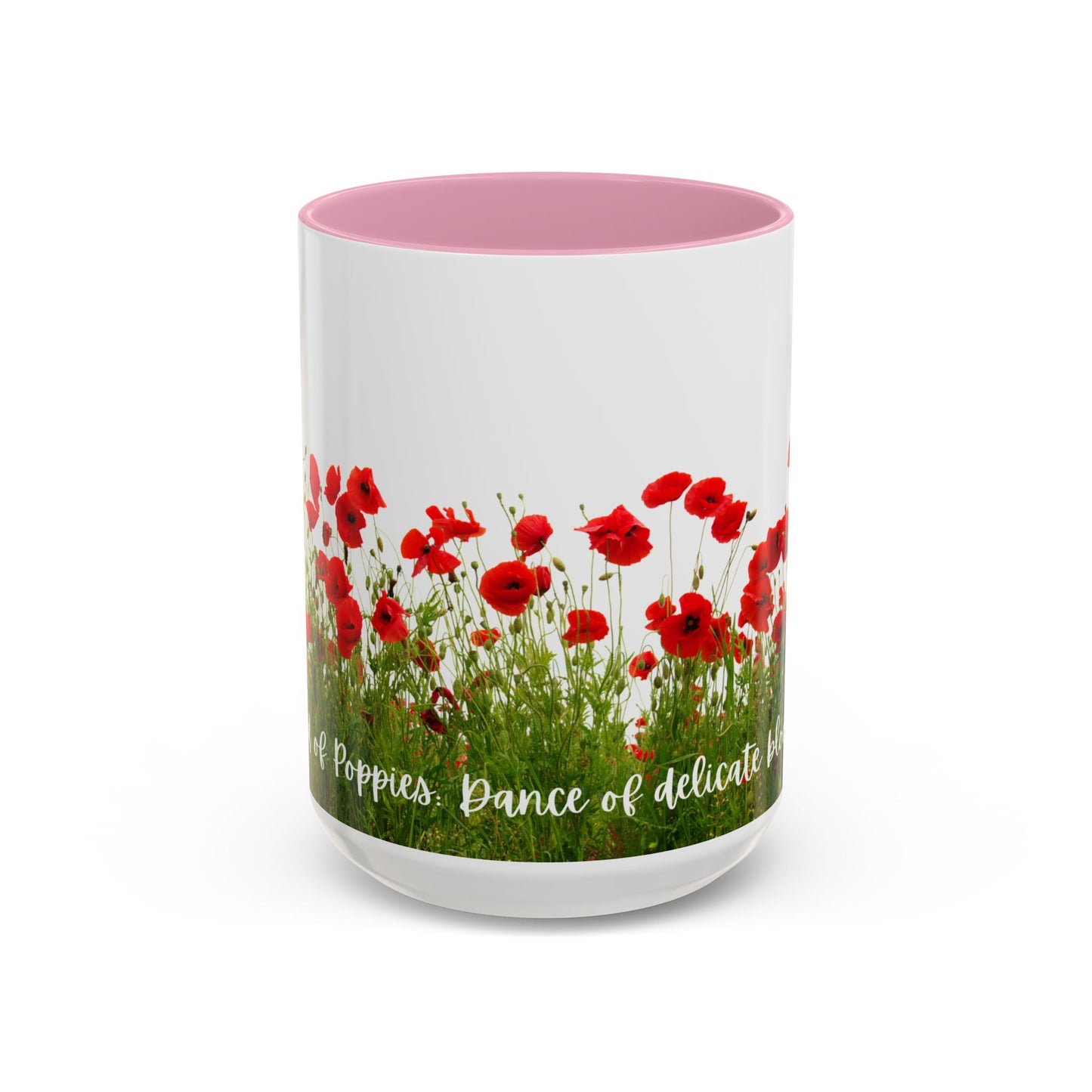 Stunning Floral Design: Each mug is adorned with a mesmerizing field of poppies, capturing the essence of a picturesque meadow in full bloom. The vibrant red petals against lush green stems create a captivating visual feast.