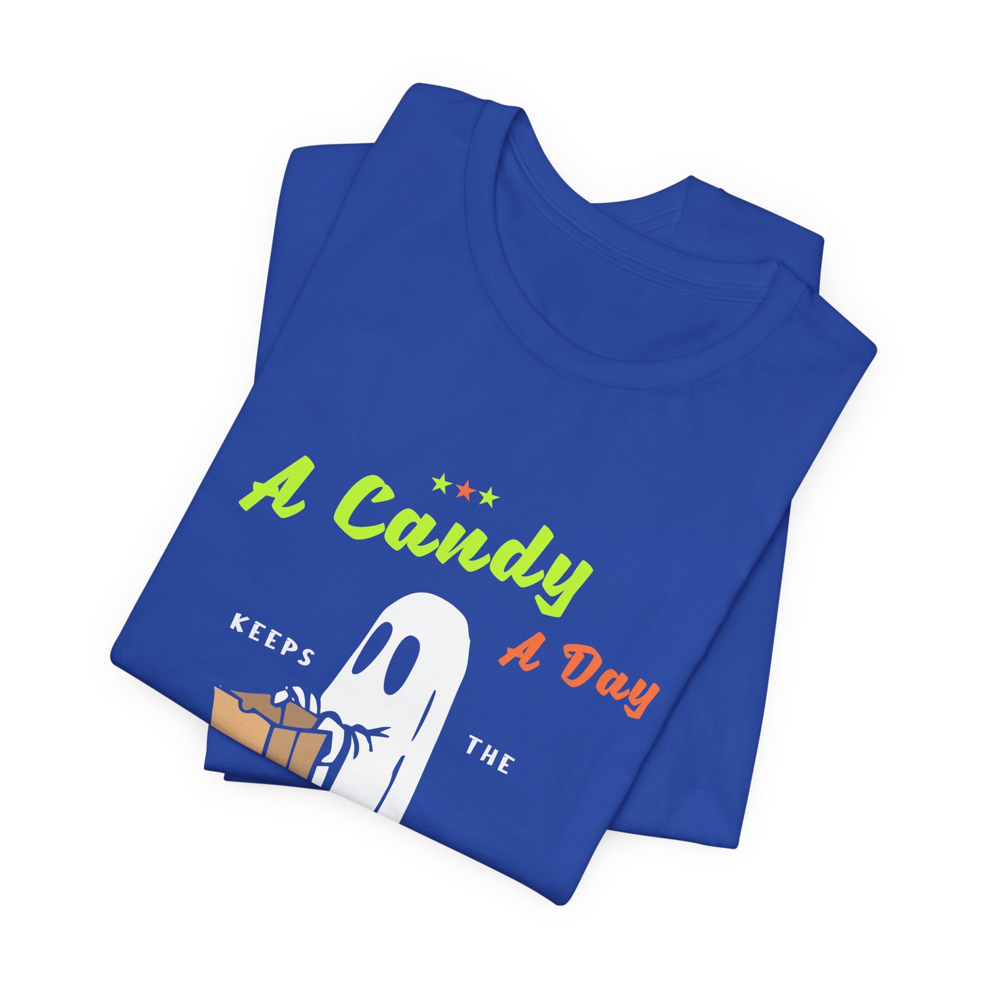 Celebrate Halloween with a sweet twist in our "A Candy Day Keeps The Monsters Away" Unisex Jersey Short Sleeve Tee! This playful and comfortable shirt combines the fun of candy with a dash of Halloween spirit.