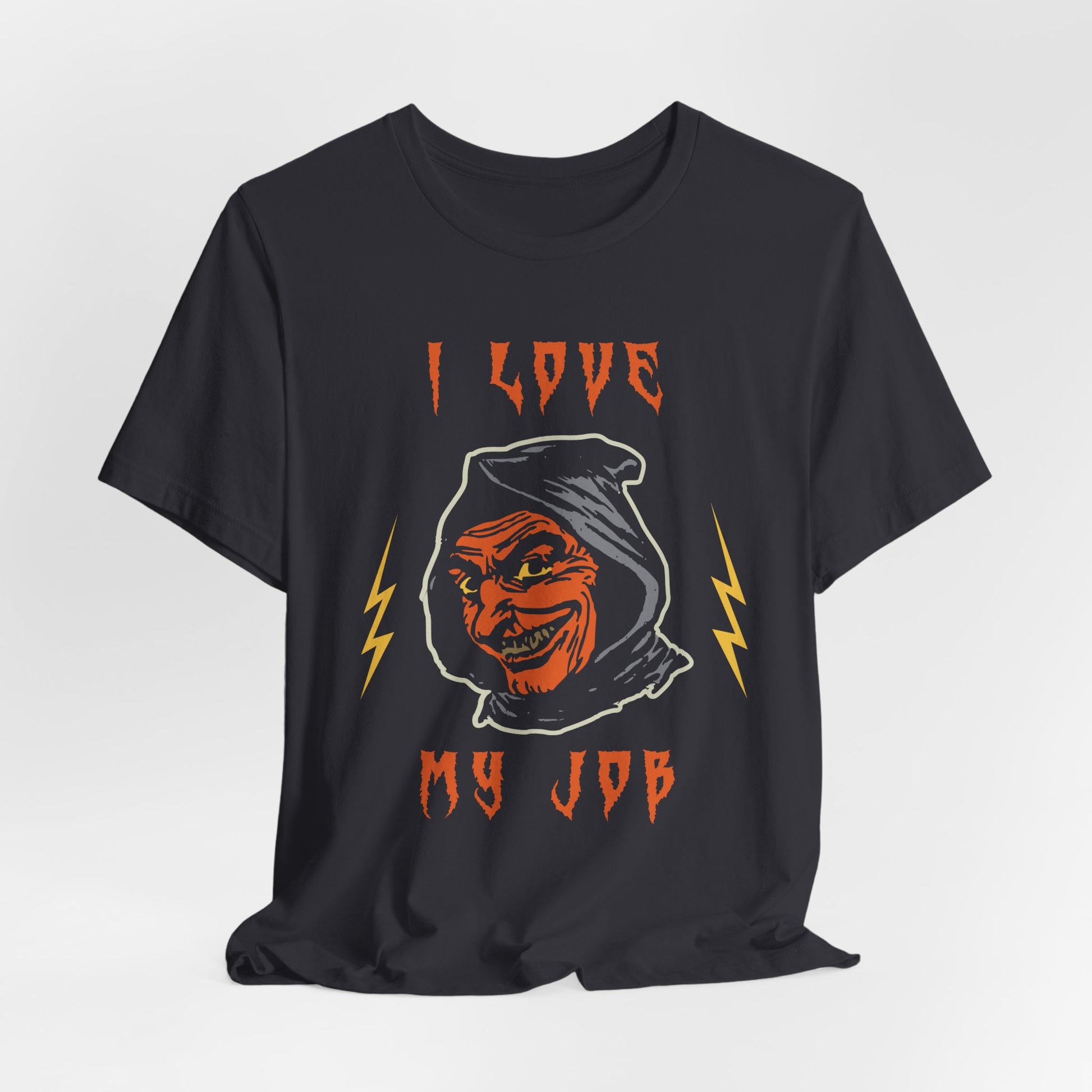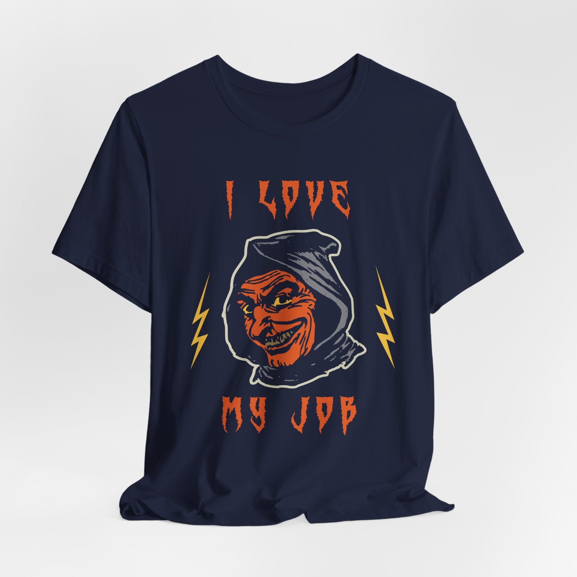 Celebrate the spookiest season with our "I Love My Job" Unisex Jersey Short Sleeve Tee, featuring a chilling image of a scary man that adds a touch of frightful fun to your Halloween wardrobe.