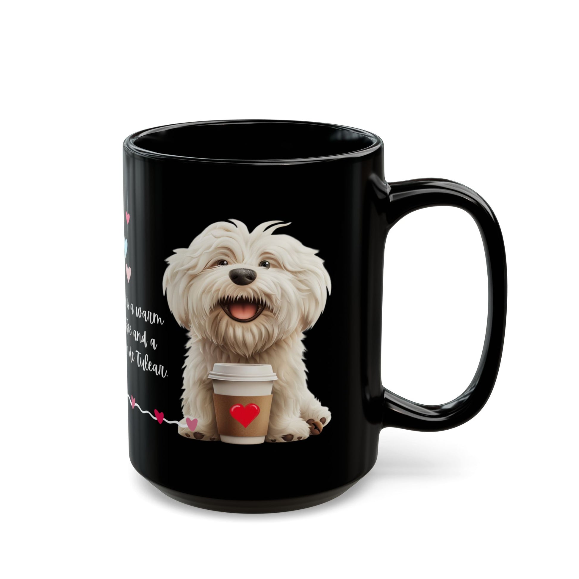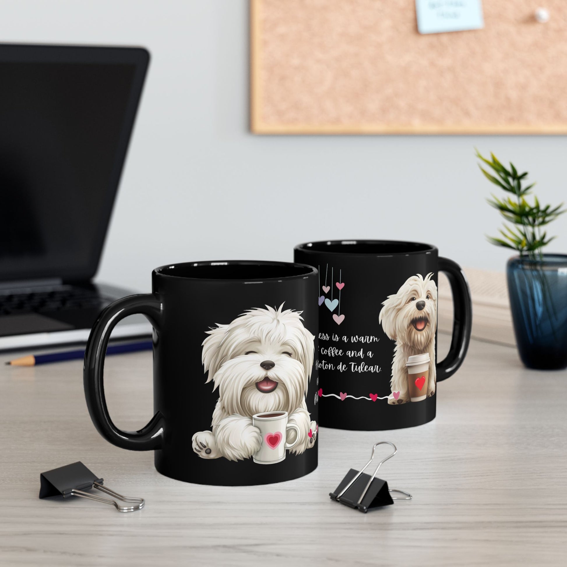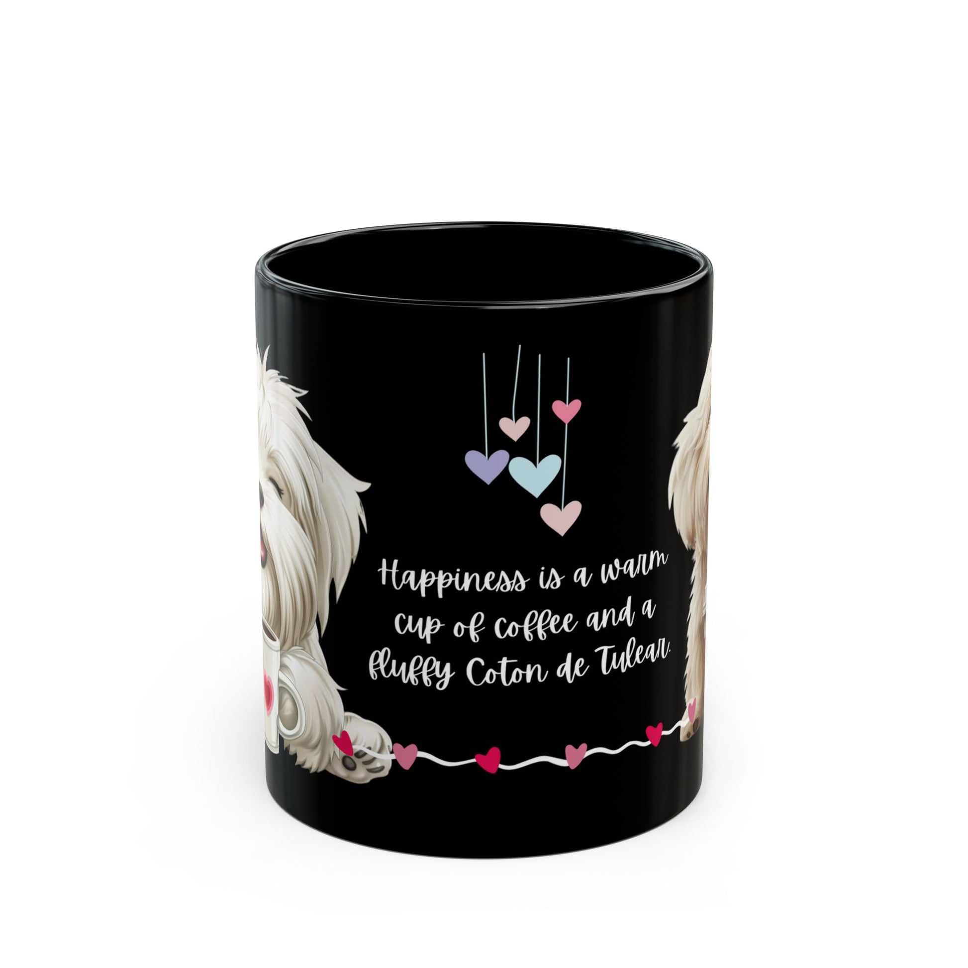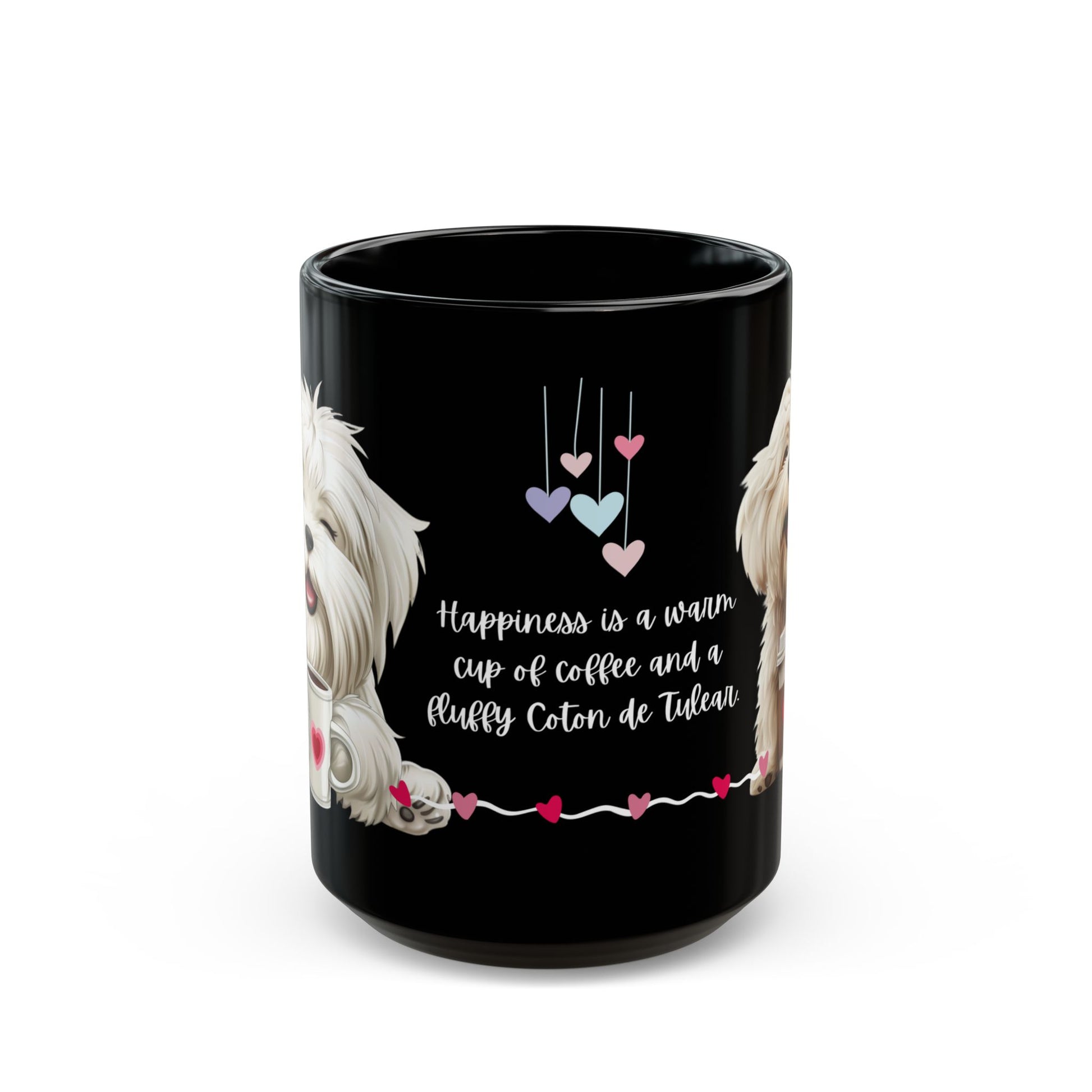 Embrace the simple pleasures in life with our "Happiness is a Warm Cup of Coffee and a Fluffy Coton de Tulear" black mug. Order yours today and start each day with a smile!