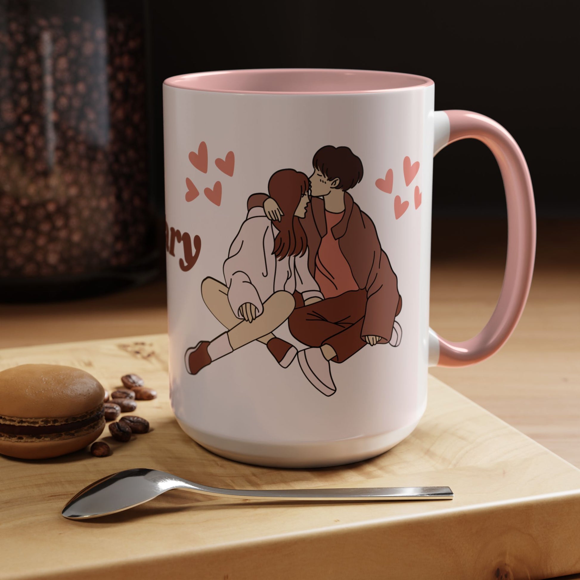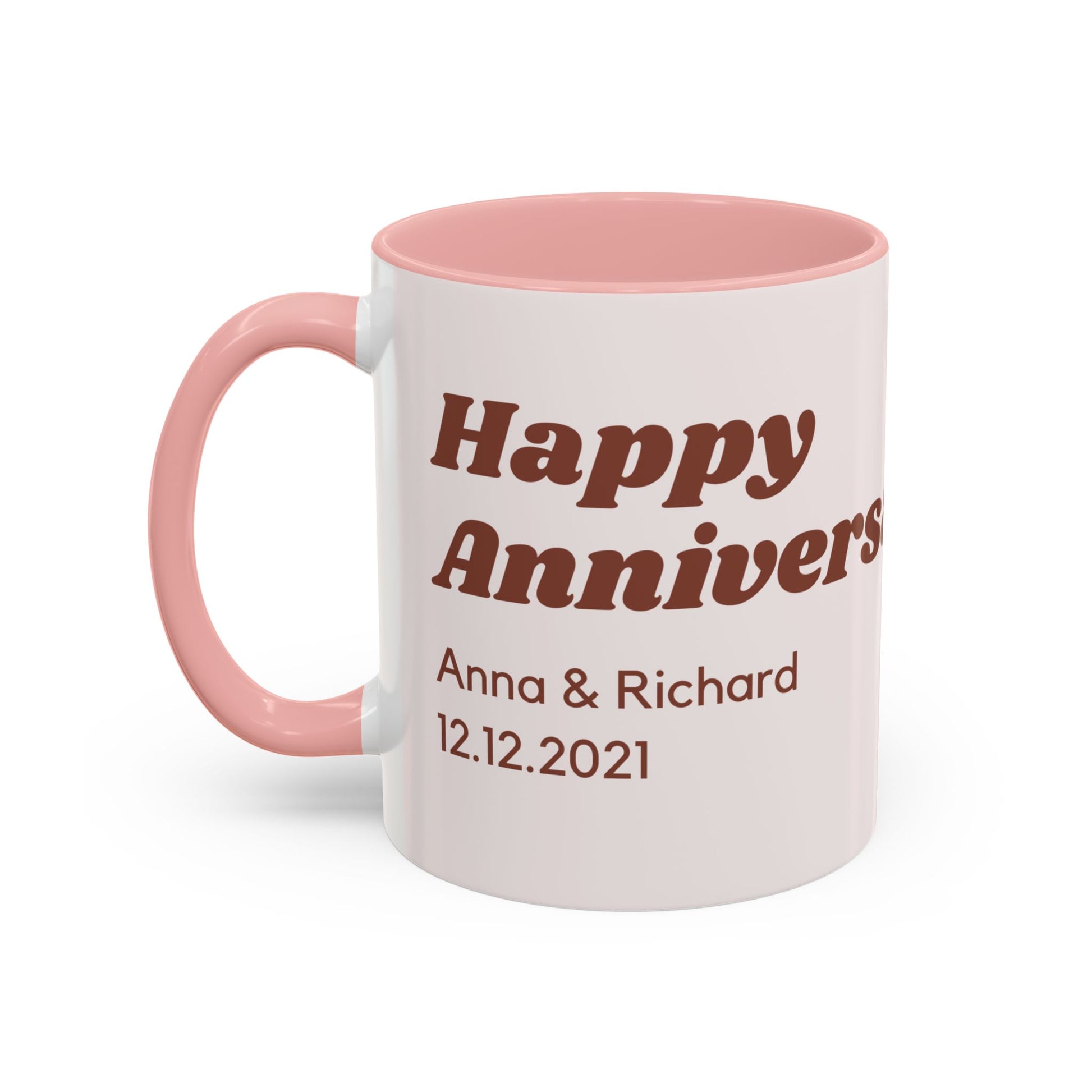 Celebrate a love that grows stronger with each passing year with this customizable "Happy Anniversary" accent coffee mug. This special mug allows you to personalize the details, making it a truly unique gift for your partner or a couple. Available in both 11oz and 15oz sizes, it’s perfect for enjoying a cozy cup of coffee, tea, or any warm drink while cherishing the memories of your special day. The contrasting color handle and interior add a stylish touch, while the customizable features make it a one-of-a-kind keepsake. Crafted from high-quality ceramic, this mug will be a lasting reminder of your love and celebration.