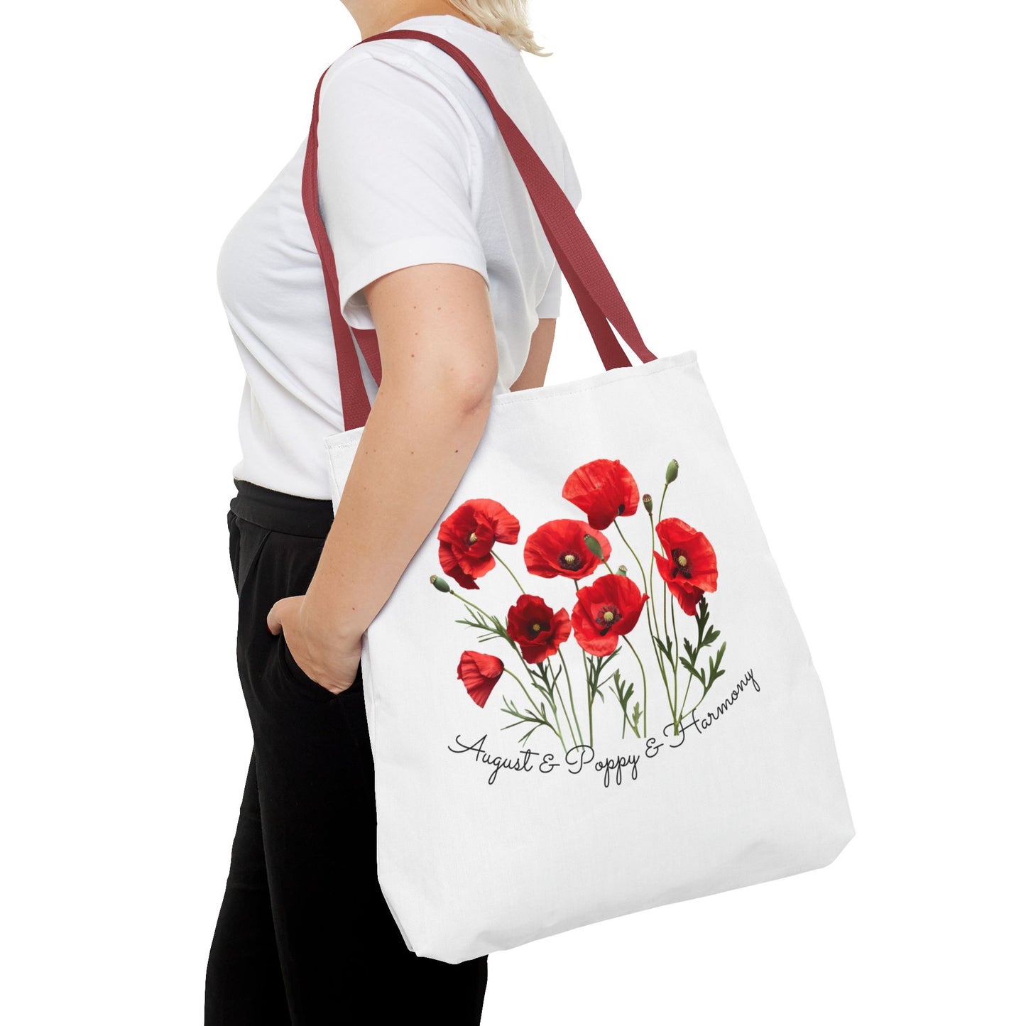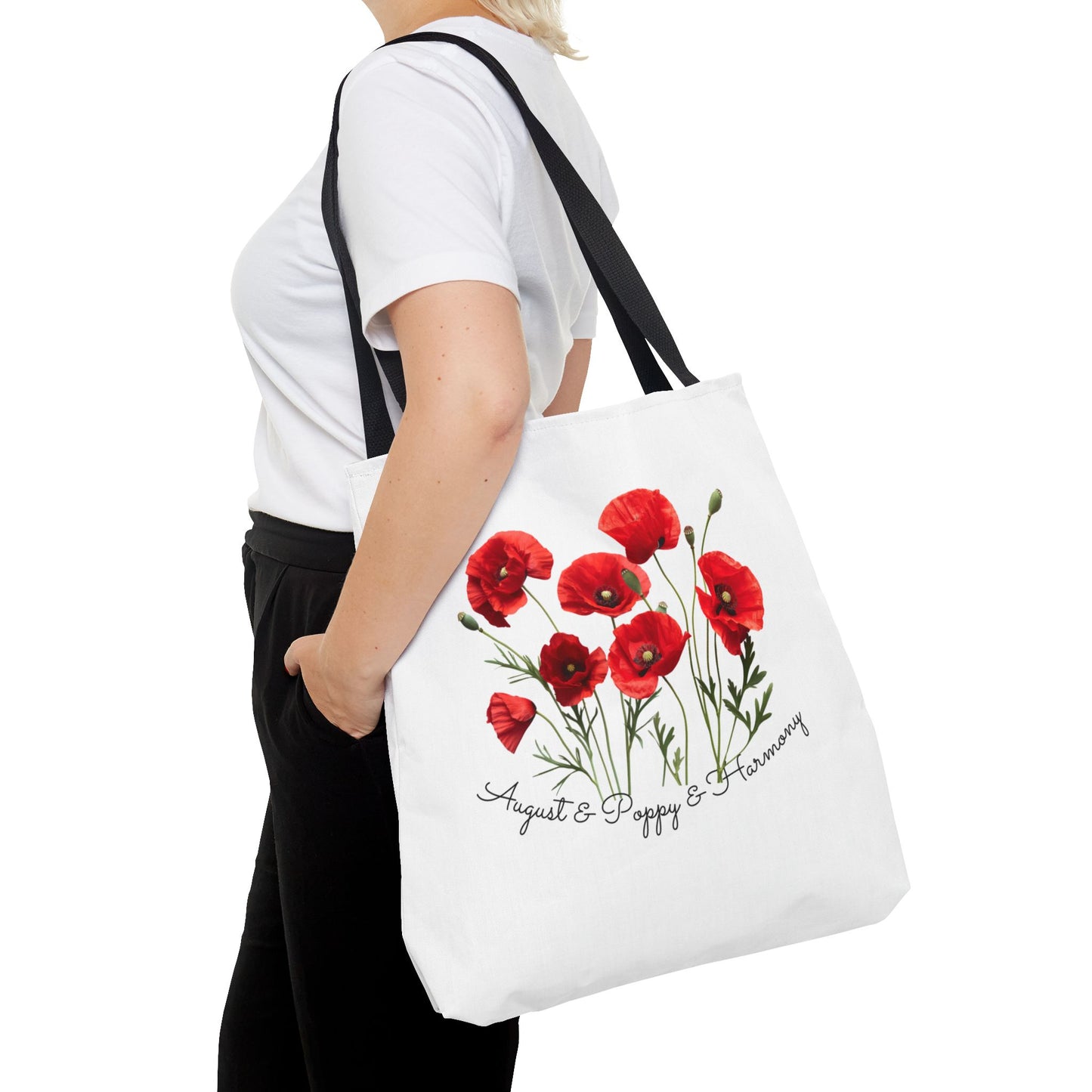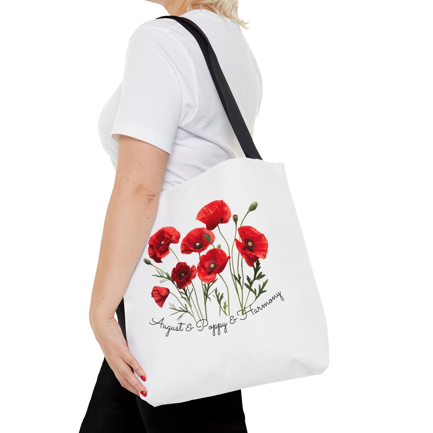 - Beautiful Poppy Design: Featuring a stunning poppy flower graphic, this tote bag captures the essence of August, symbolizing joy, beauty, and resilience.