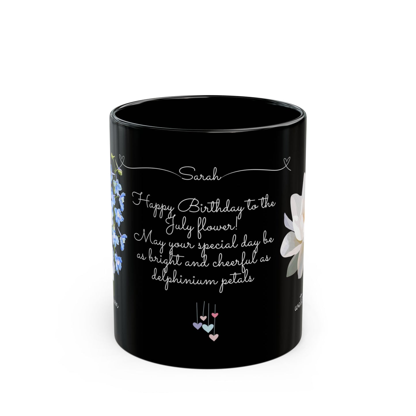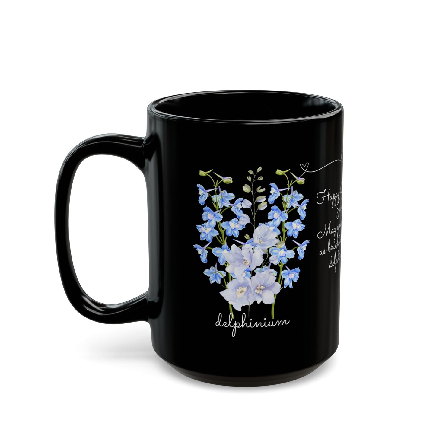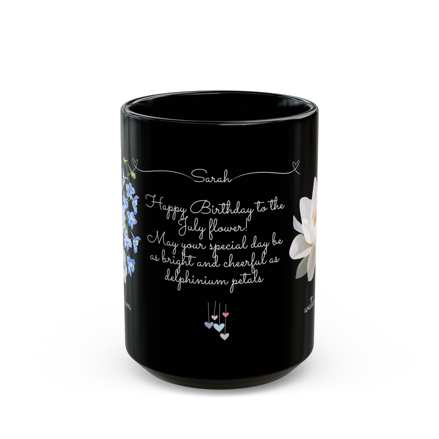 Celebrate a July birthday in style with the Happy Birthday Gift Customizable Black Mug, adorned with the beautiful and meaningful birth flowers of July—larkspur and water lily. This personalized mug is a perfect way to make their special day even more memorable.