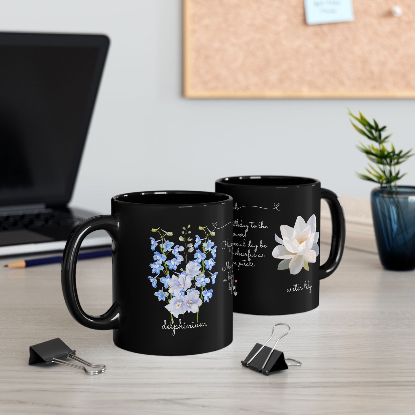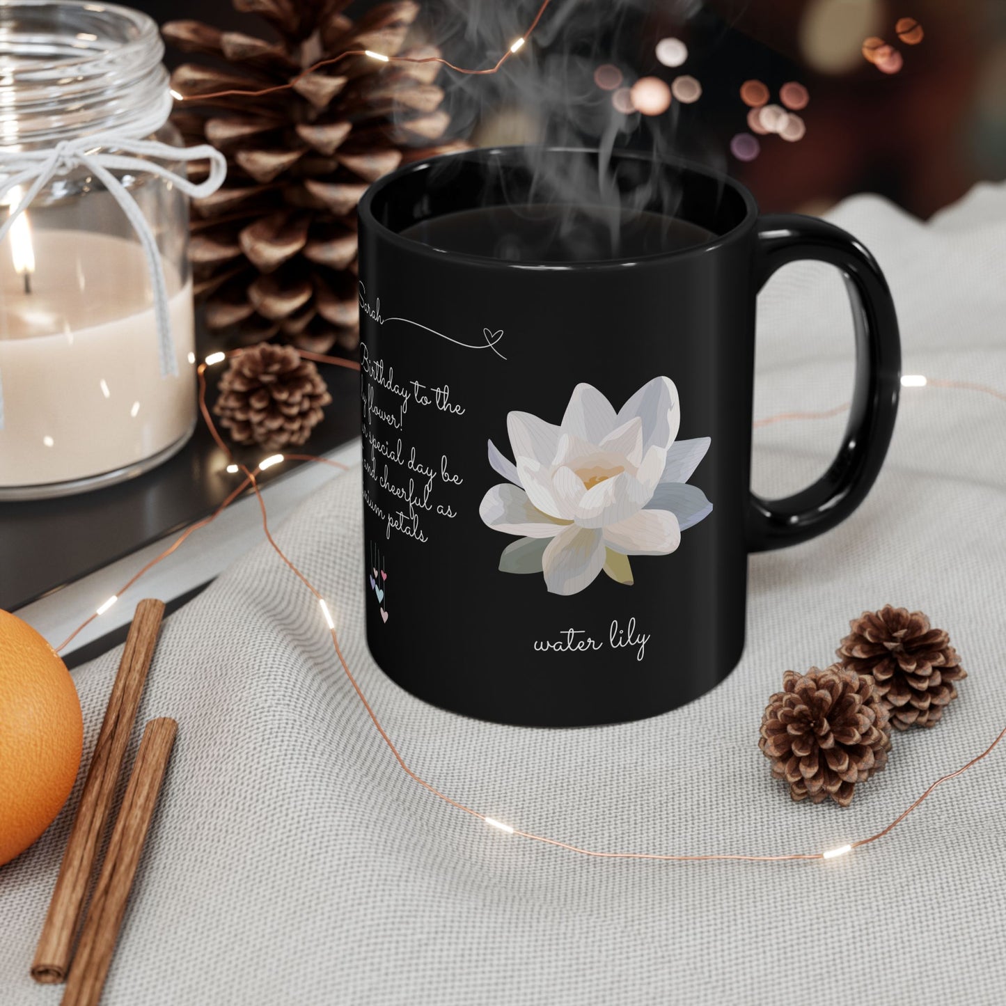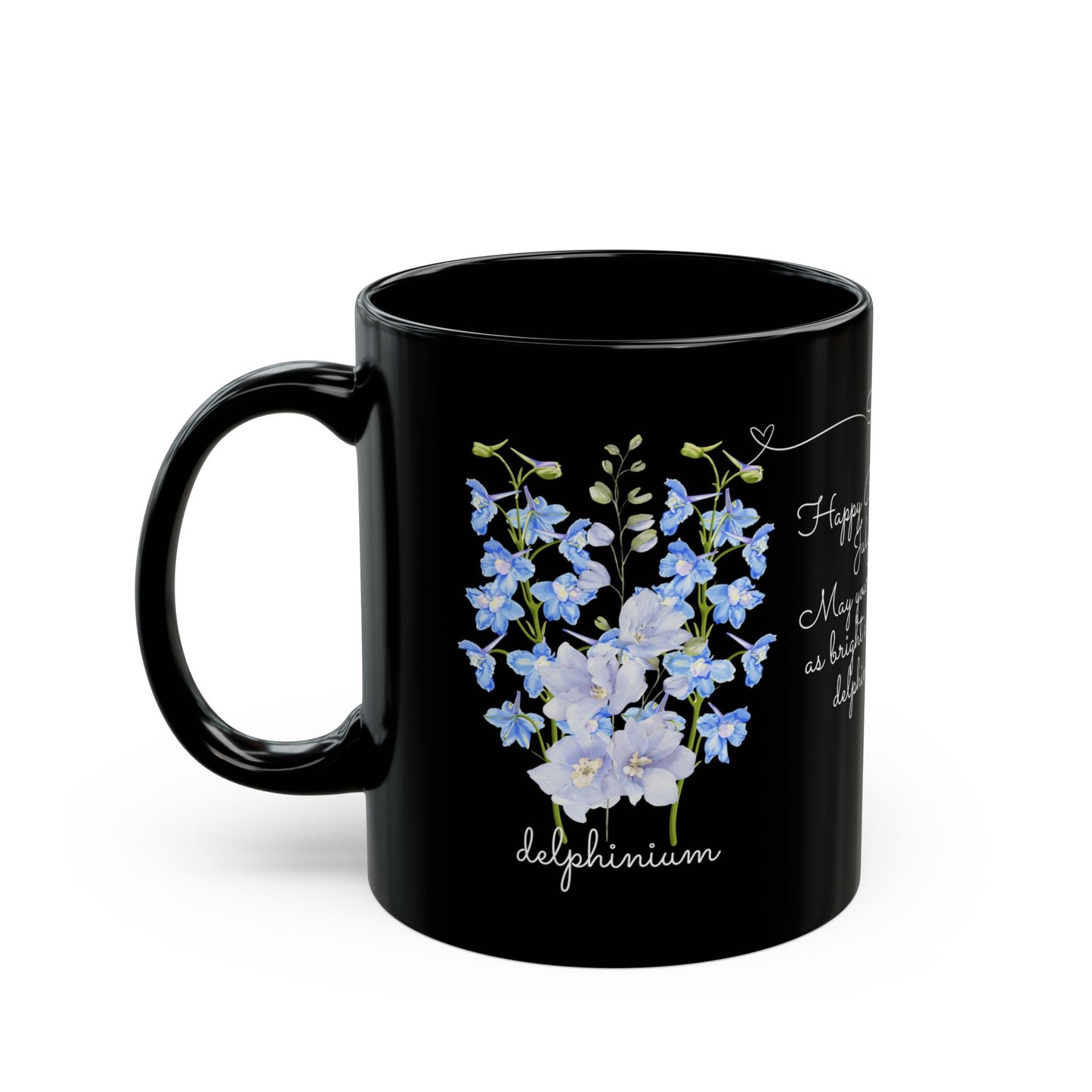 Celebrate a July birthday in style with the Happy Birthday Gift Customizable Black Mug, adorned with the beautiful and meaningful birth flowers of July—larkspur and water lily. This personalized mug is a perfect way to make their special day even more memorable.
