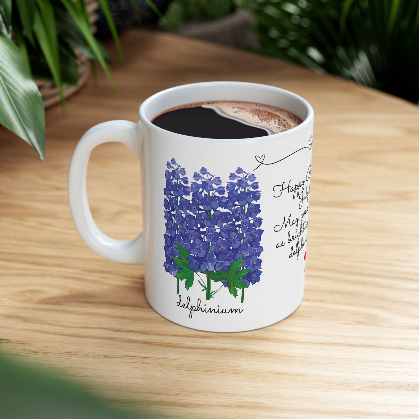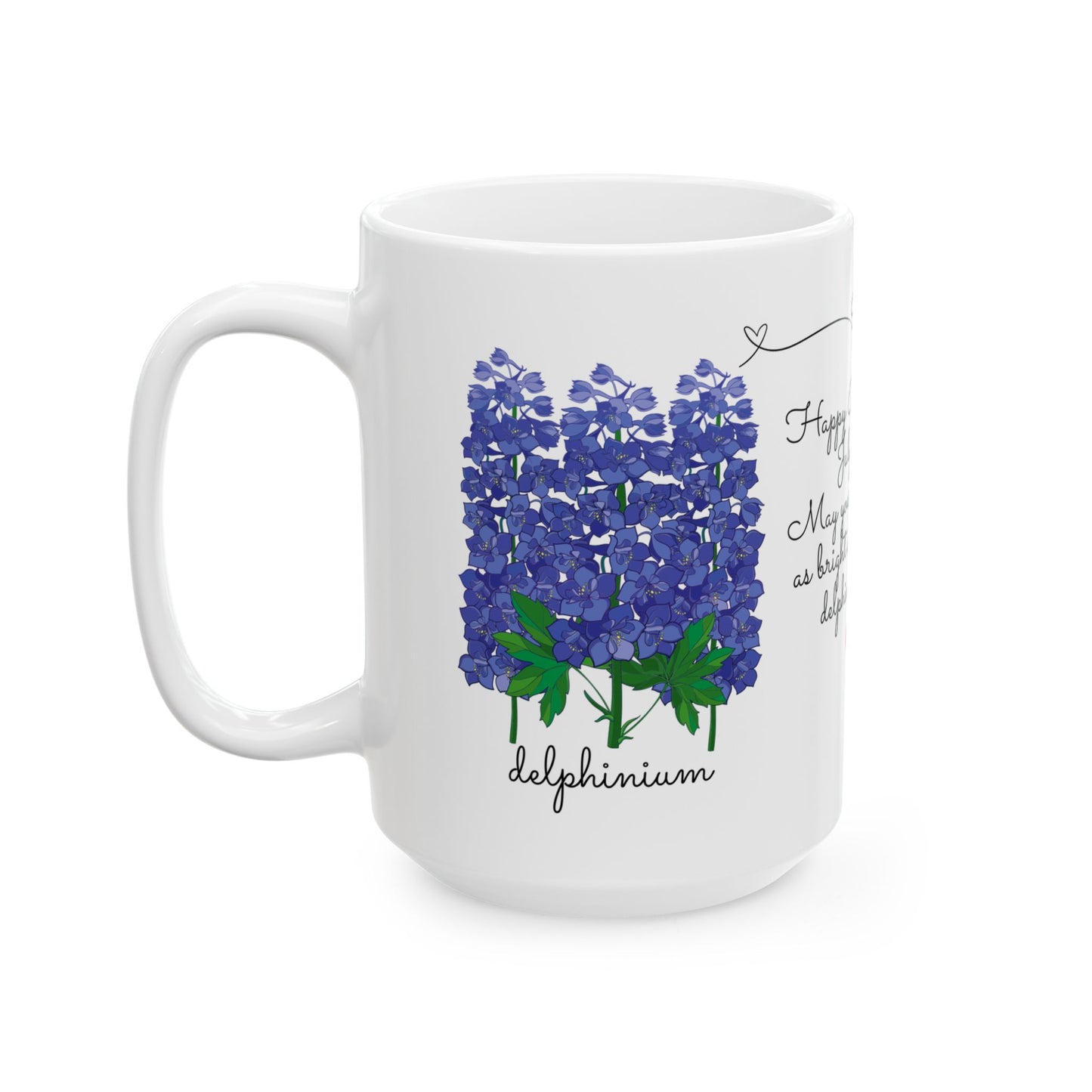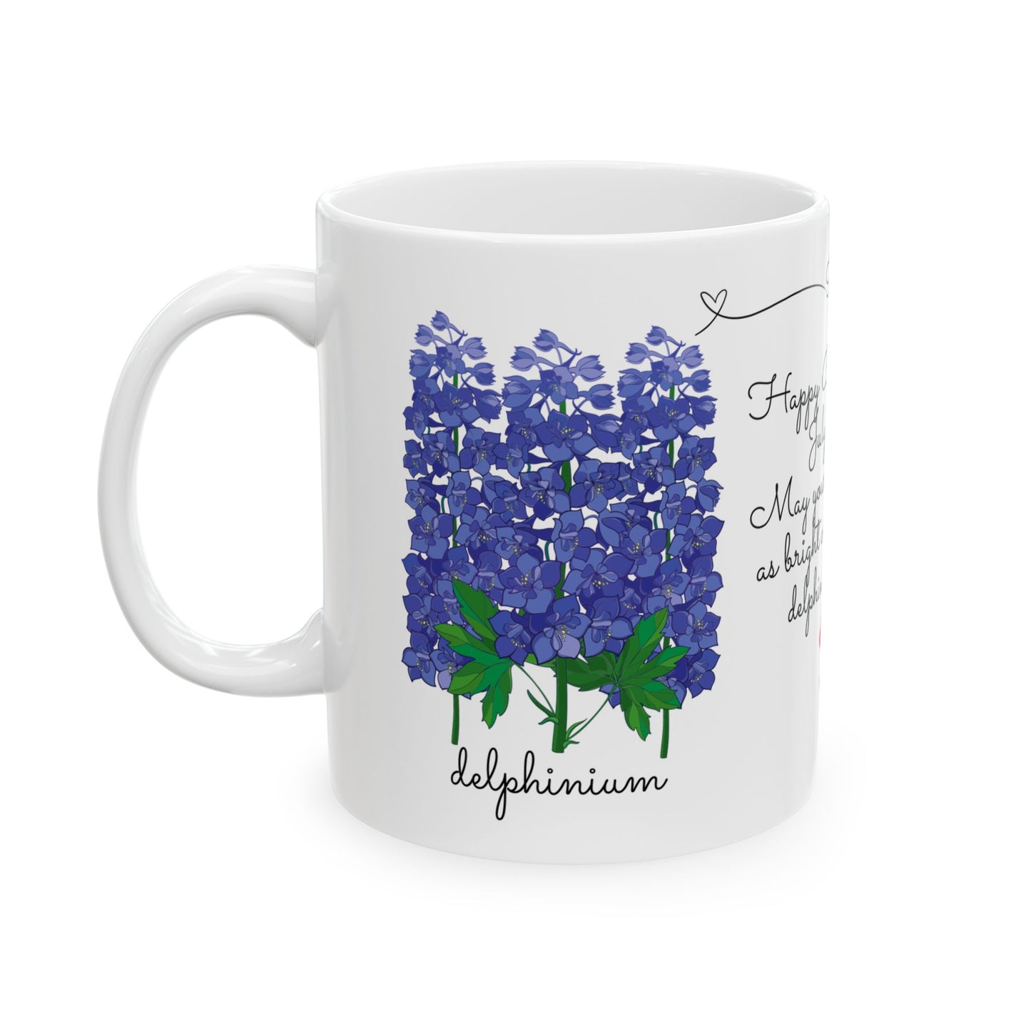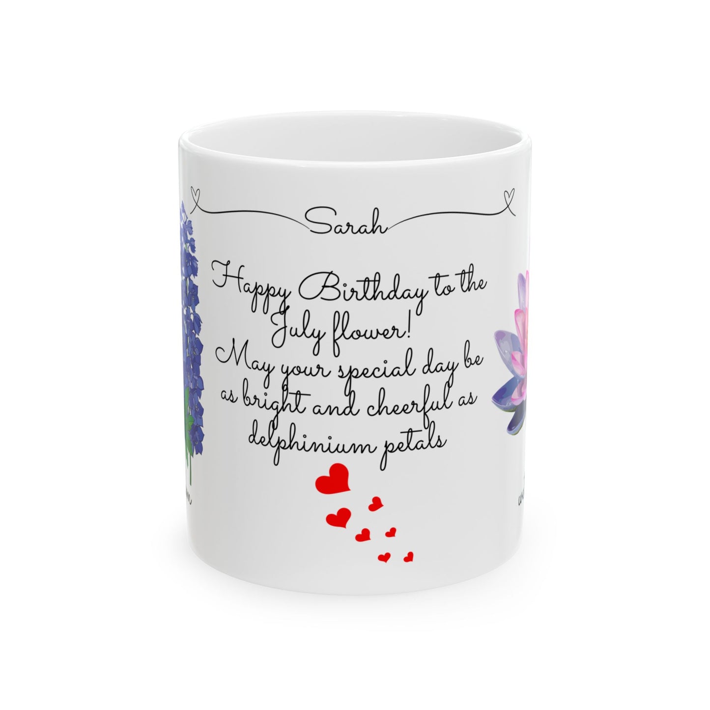 Celebrate a July birthday with the Happy Birthday, July Birth Flowers Customizable Ceramic Mug! Featuring the beautiful larkspur and water lily—symbols of positivity, love, and purity—this personalized mug is a thoughtful and meaningful gift for someone born in July.