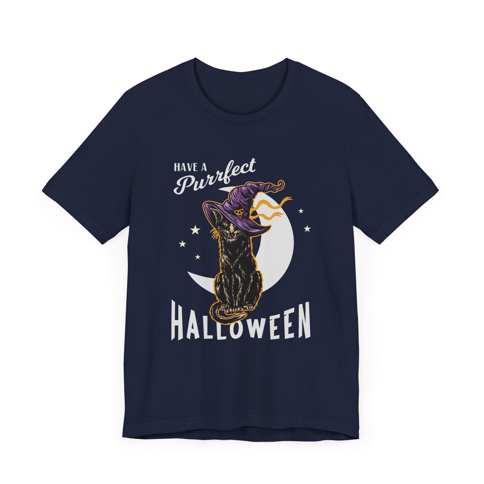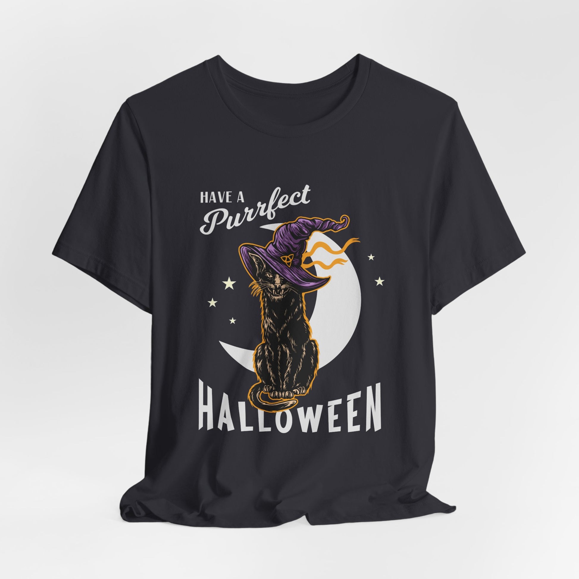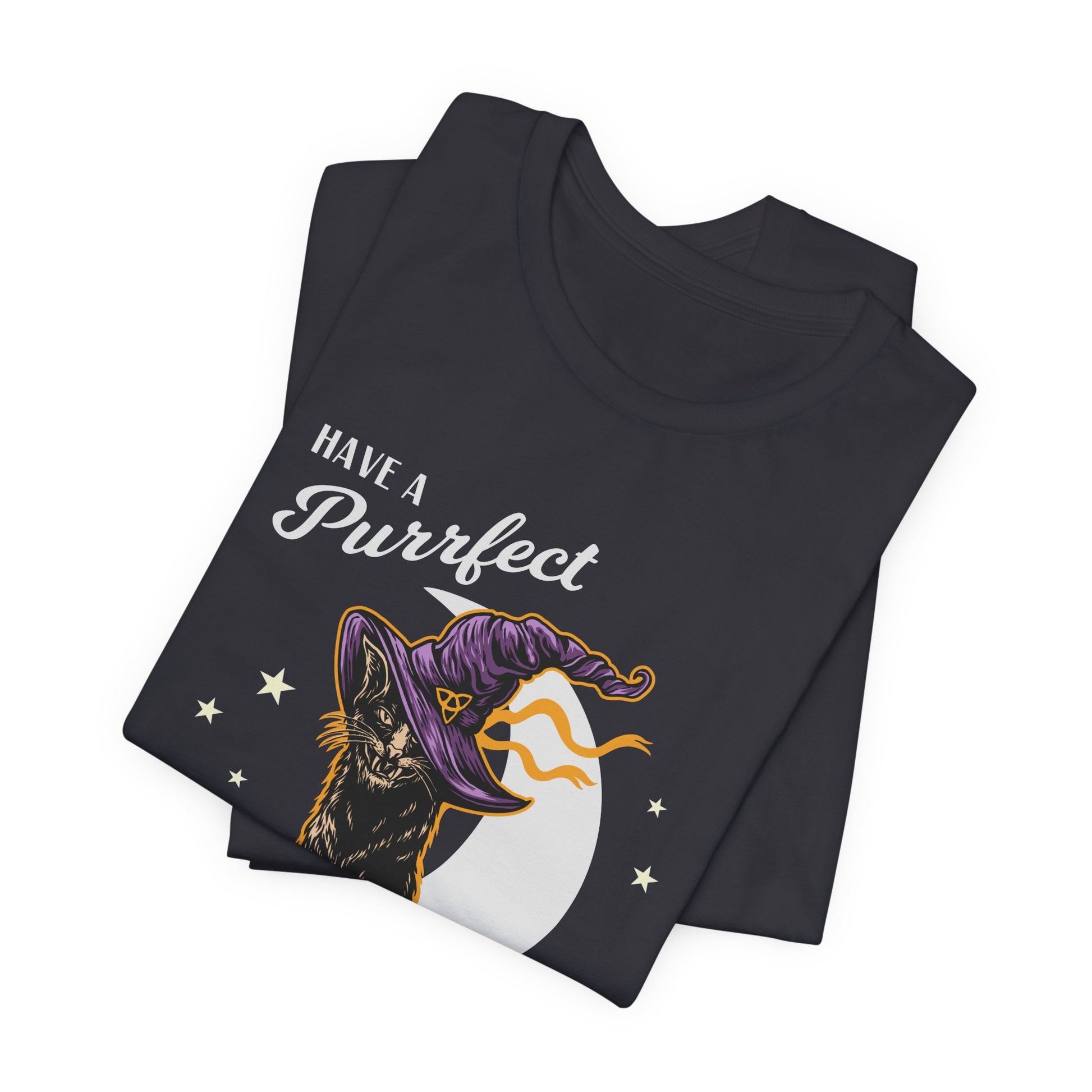 Celebrate Halloween with a purr and a smile in our "Have A Purfect Halloween" Unisex Jersey Short Sleeve Tee! Featuring an adorable cat illustration, this tee blends festive fun with feline charm, making it the perfect choice for cat lovers and Halloween enthusiasts alike.