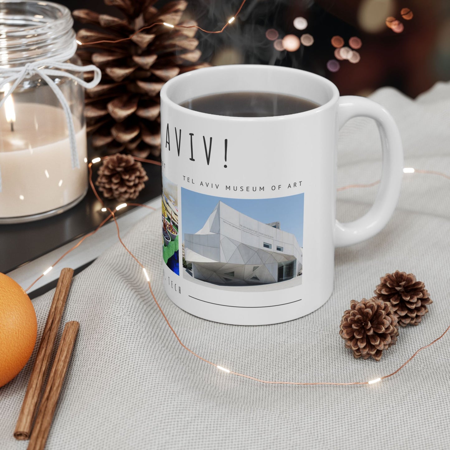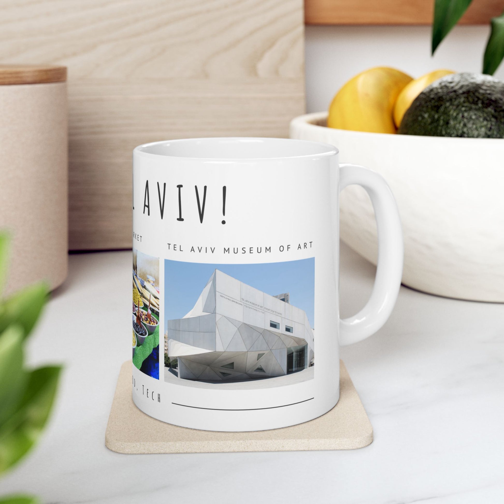 Bring the vibrant energy of Tel Aviv to your morning routine! The Hello, Tel Aviv! Ceramic Mug celebrates the city’s stunning beaches, bustling markets, and world-famous culinary scene. Whether you're sipping coffee by the Mediterranean or reminiscing about your adventures, this mug is the perfect companion.