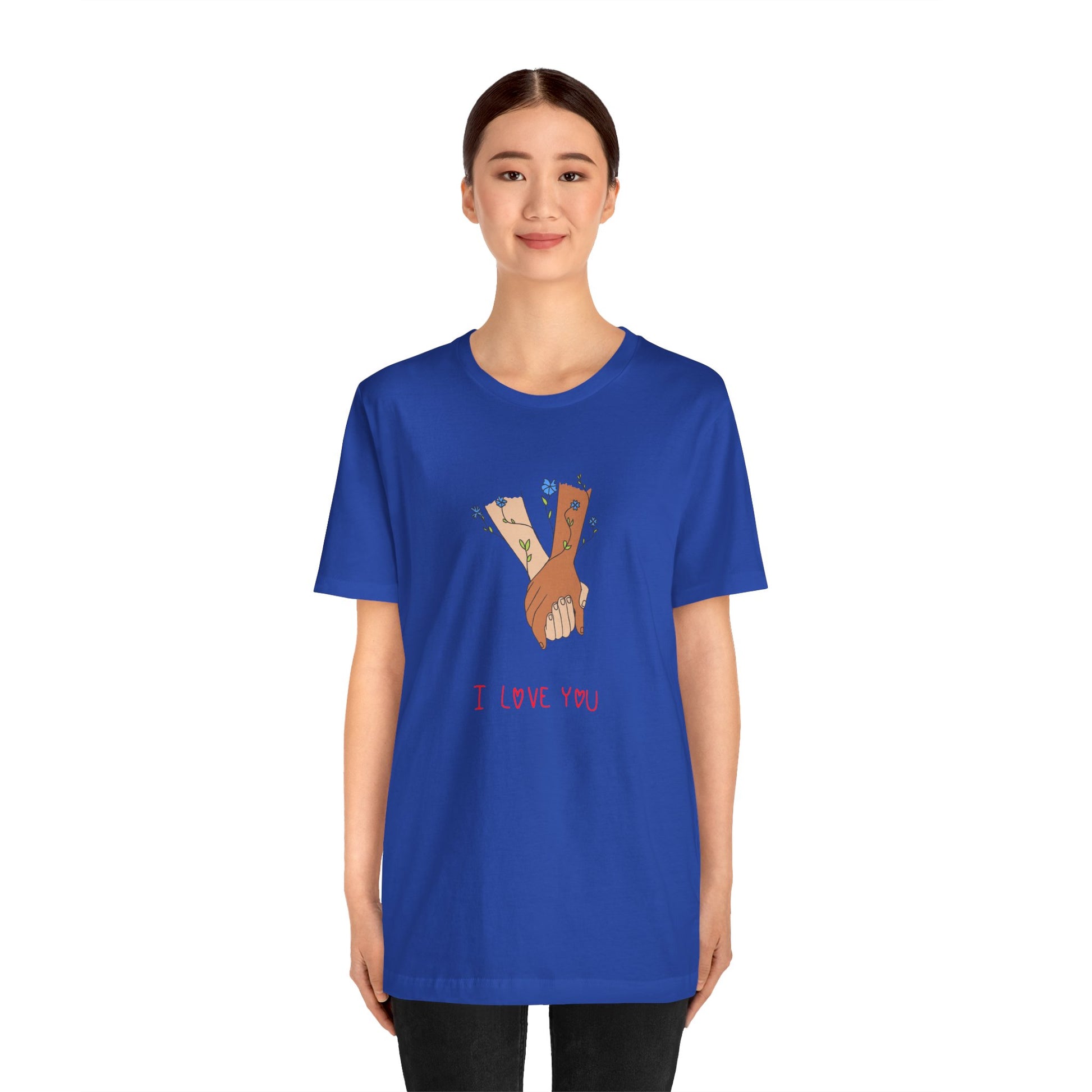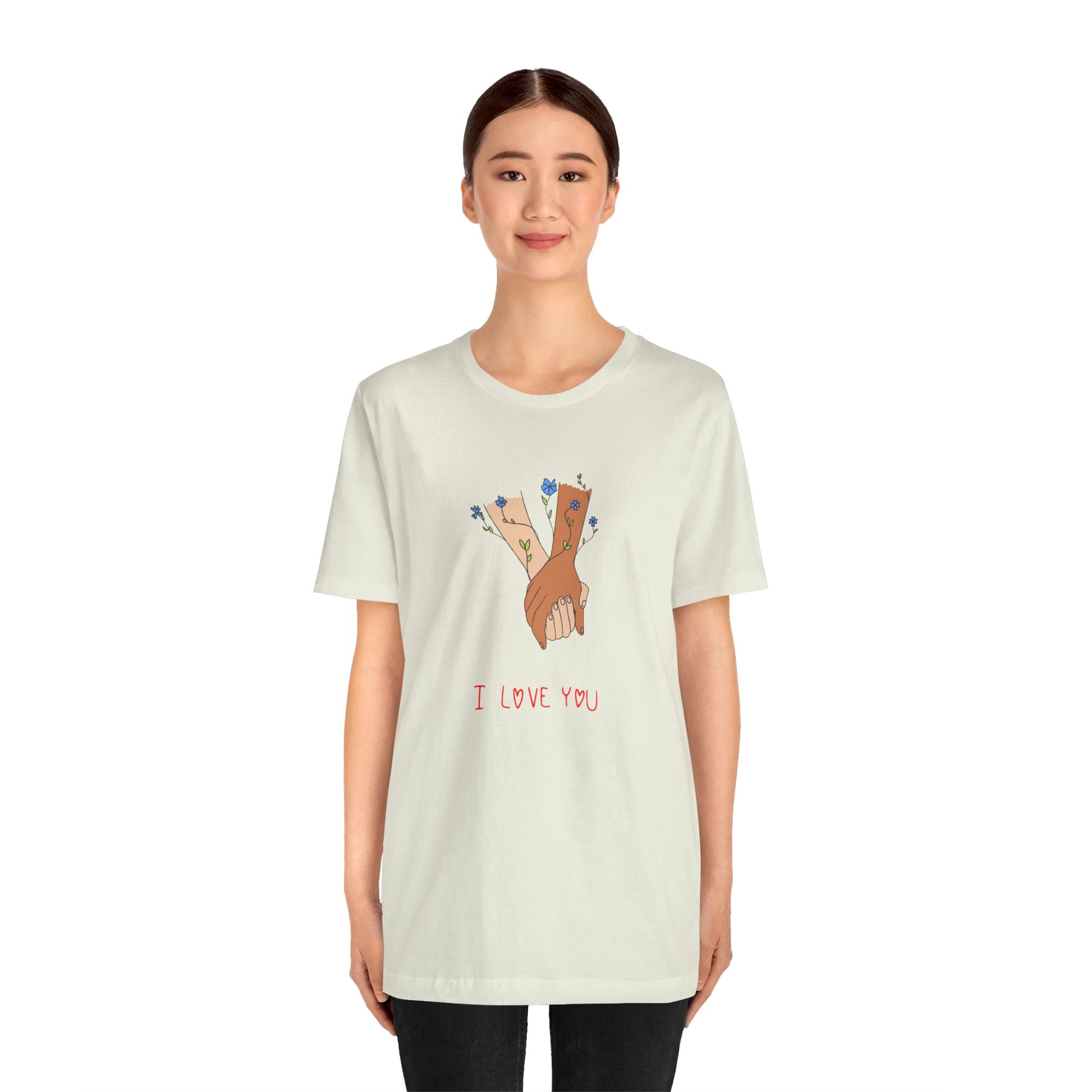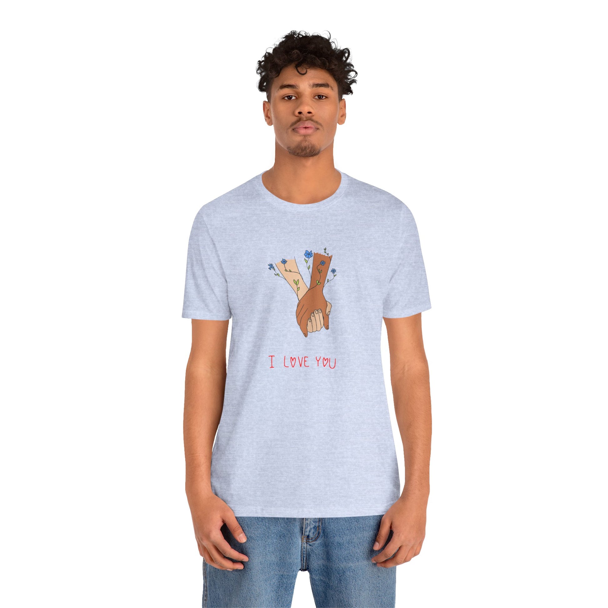 Celebrate love, connection, and the beauty of simple gestures with our Holding Hands, I Love You Unisex Jersey Short Sleeve Tee. This heartwarming design captures the essence of affection, making it the perfect addition to your wardrobe or a thoughtful gift for someone special.