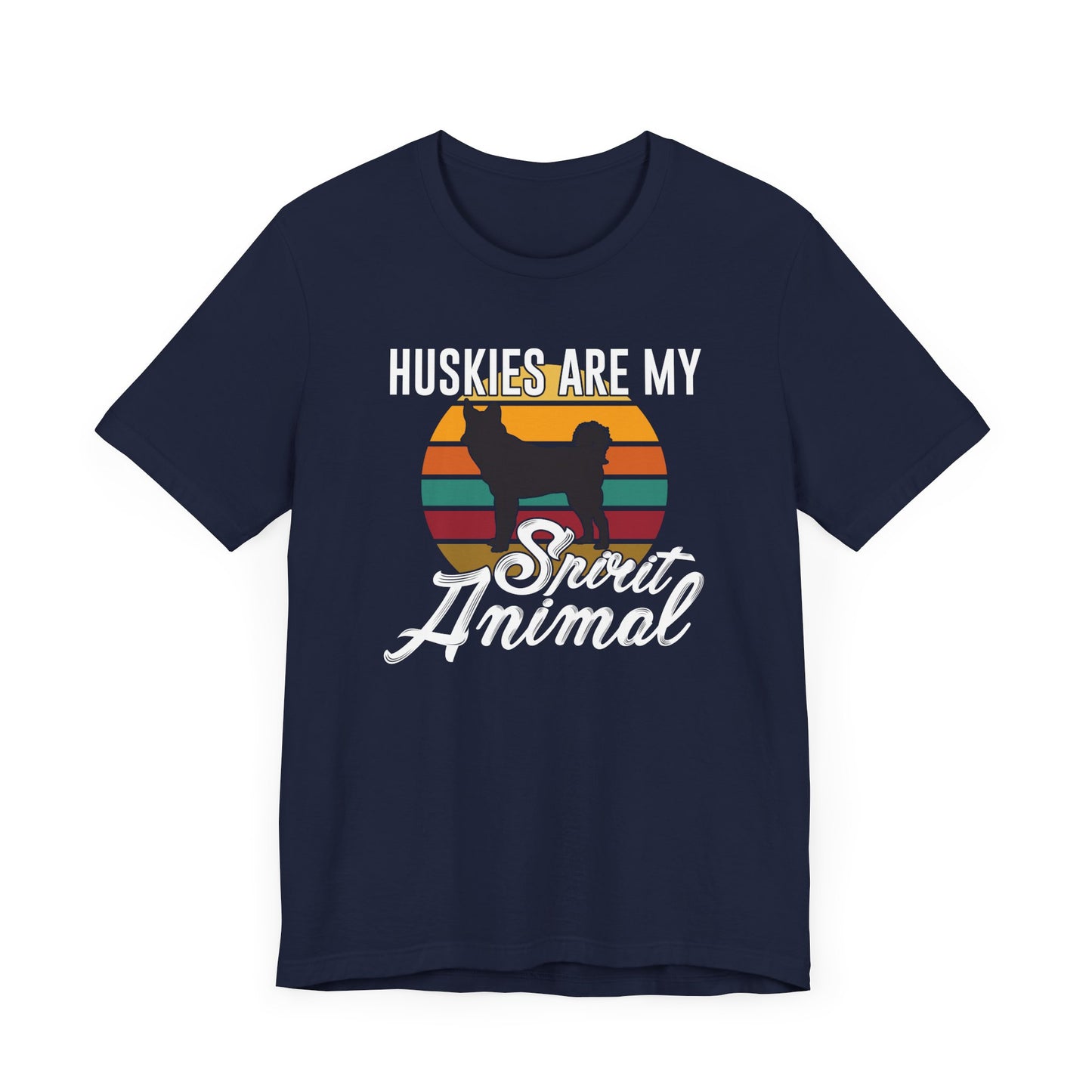Celebrate your love for Huskies with our "Huskies Are My Spirit Animal" unisex jersey short sleeve tee. Perfect for those who admire the spirited and adventurous nature of these magnificent dogs, this tee is a must-have for any Husky enthusiast.