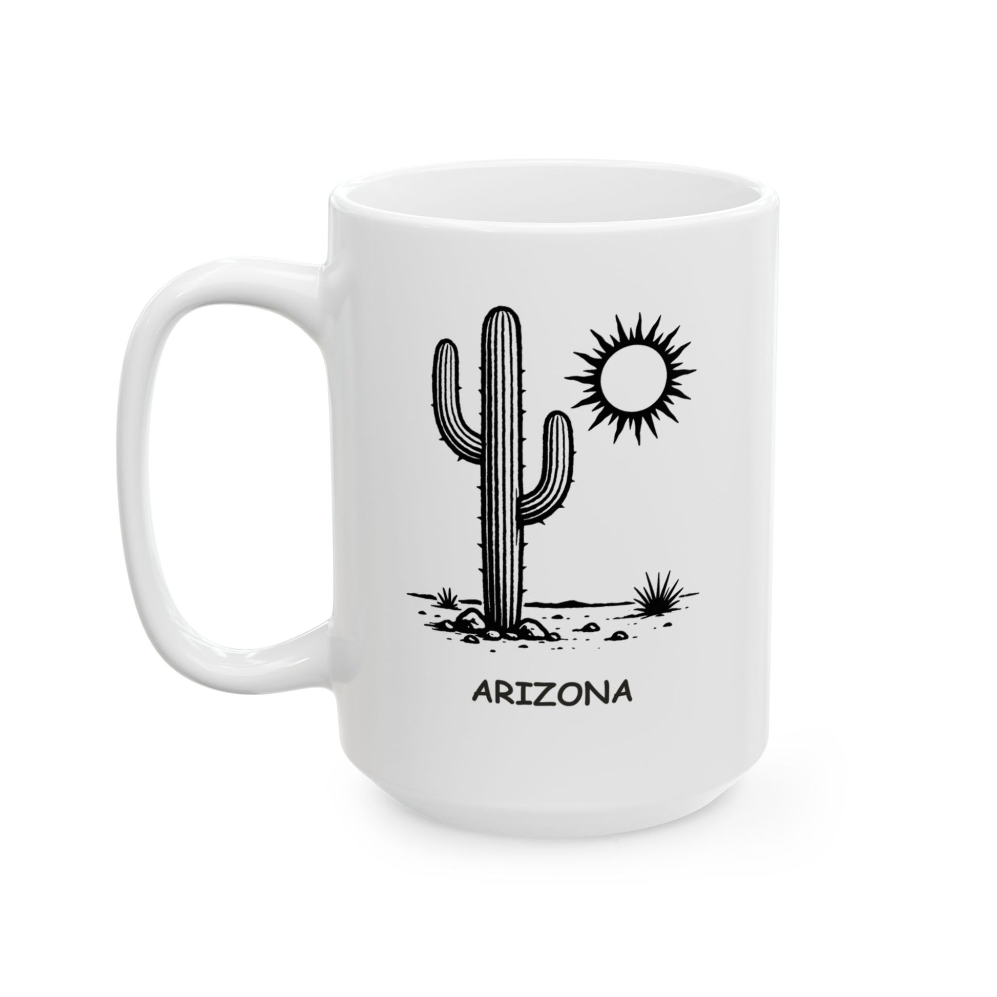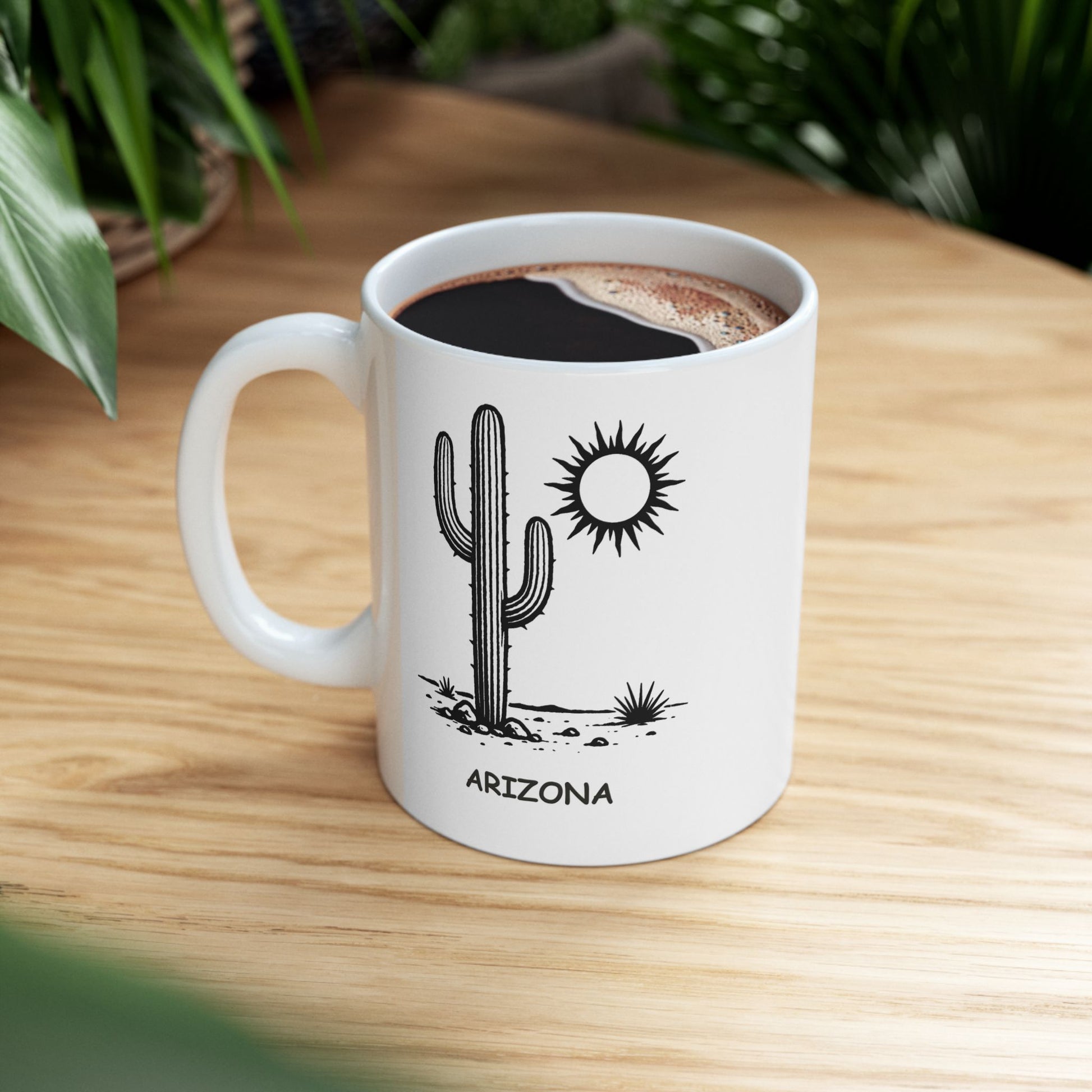 Desert charm meets blazing sunshine in this fun and fiery mug. Whether you were drawn in by the spiky beauty of the cactus or fell in love with the dry heat, this ceramic mug celebrates everything that makes Arizona unforgettable. Available in 11oz and 15oz sizes, it’s the perfect way to sip your coffee with a side of desert pride.