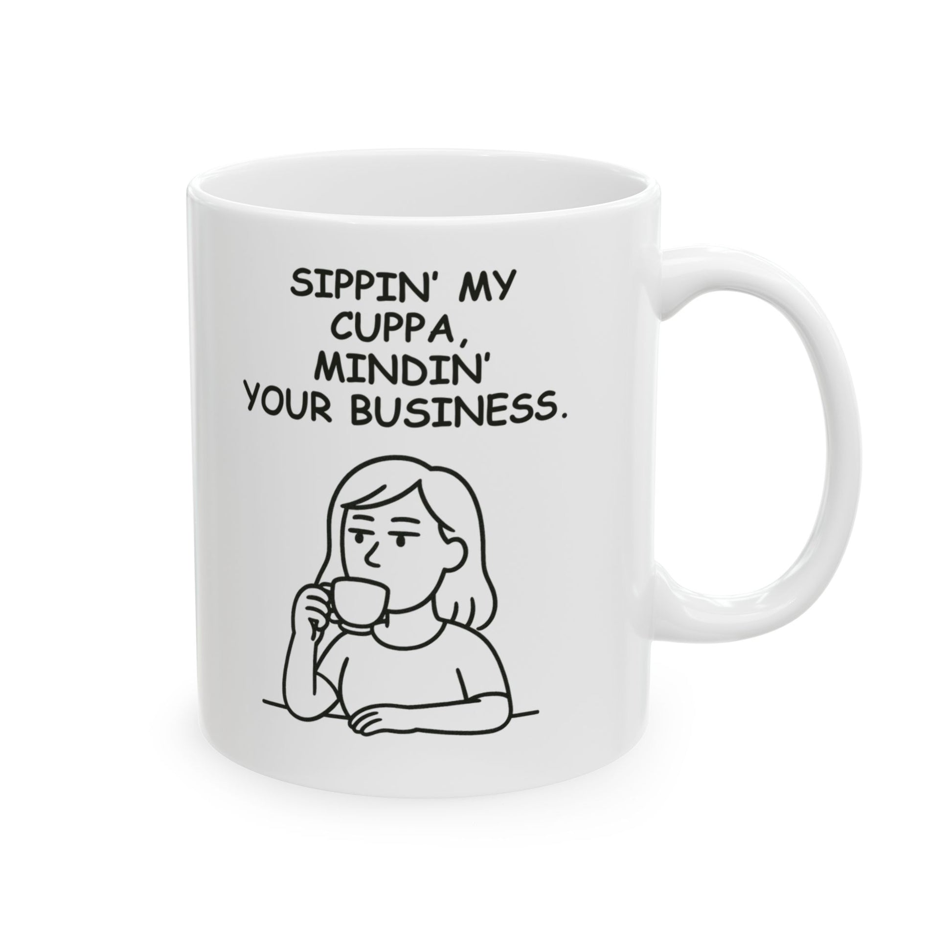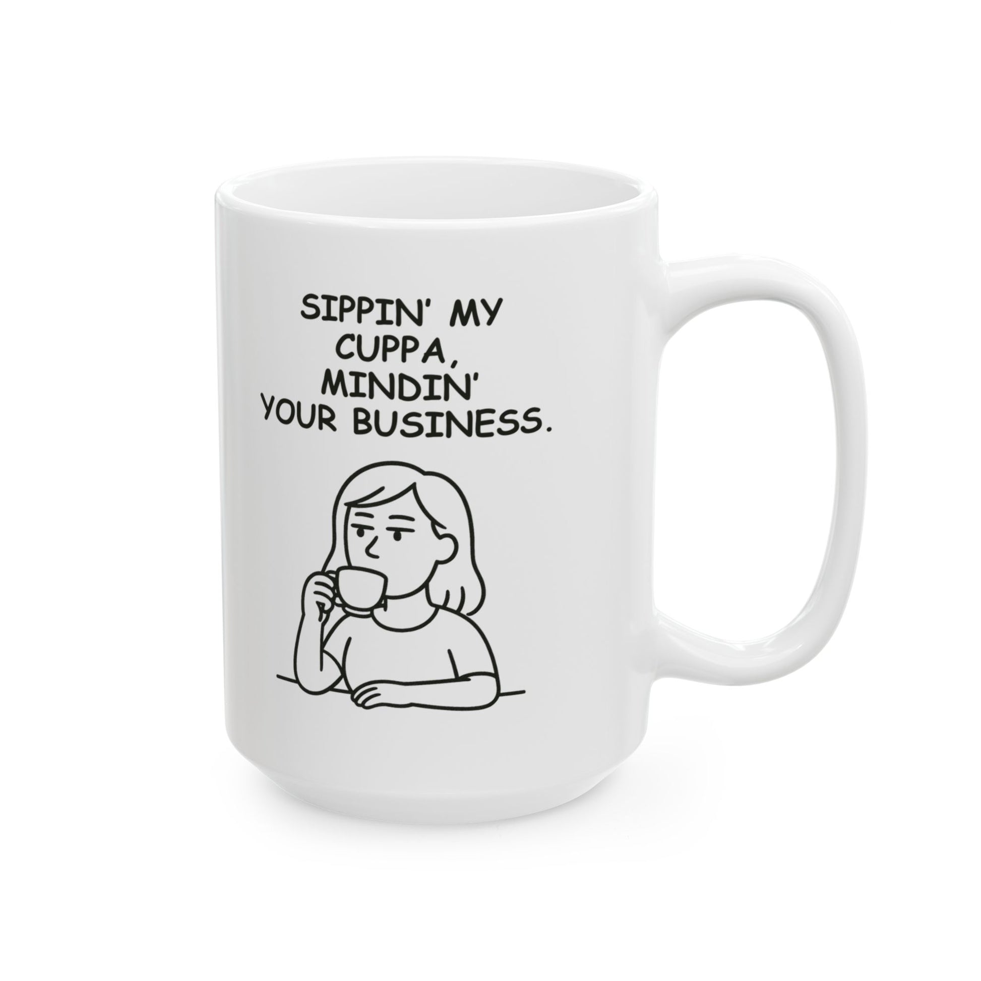“Sippin’ my cuppa, mindin’ your business.” Ceramic Mug - 12890