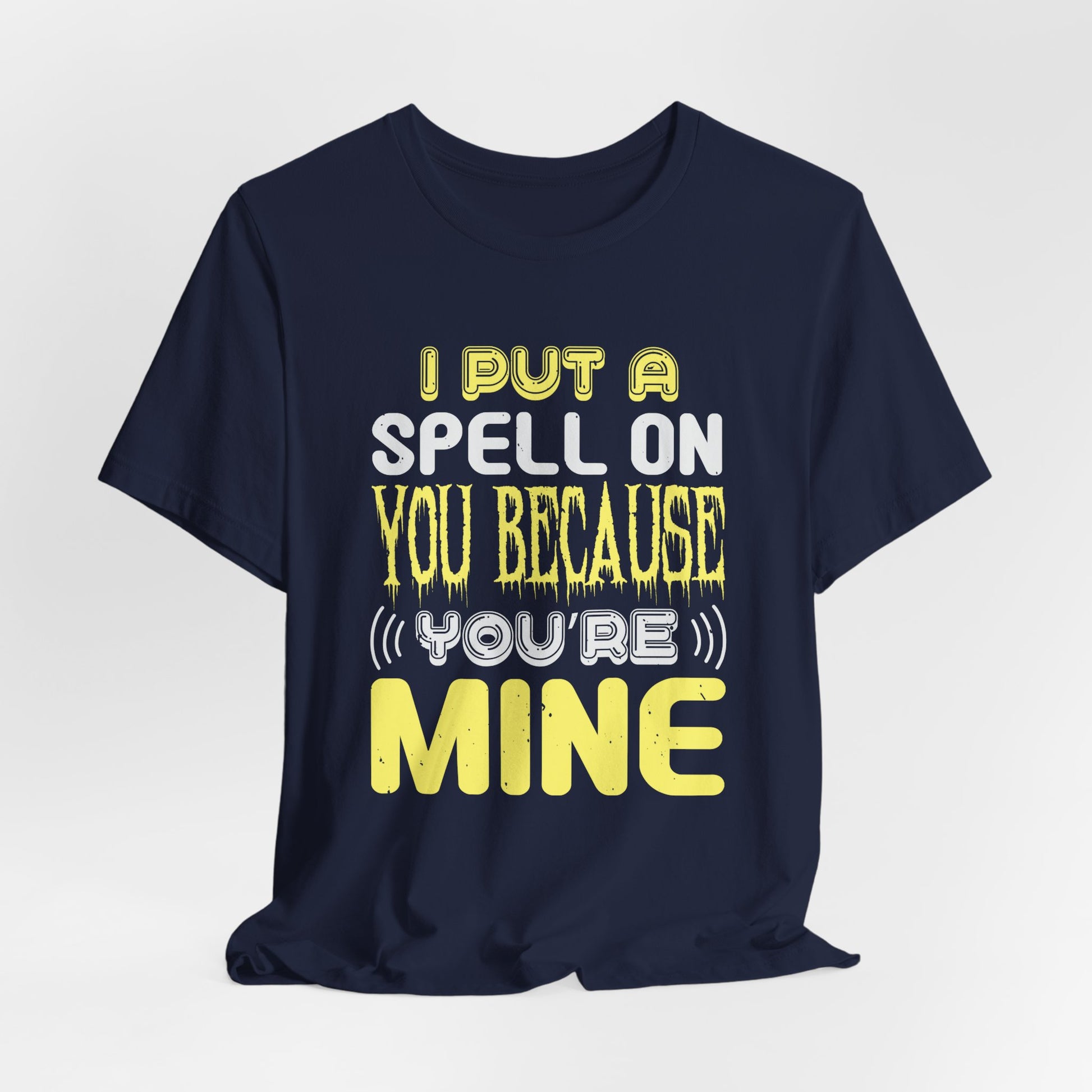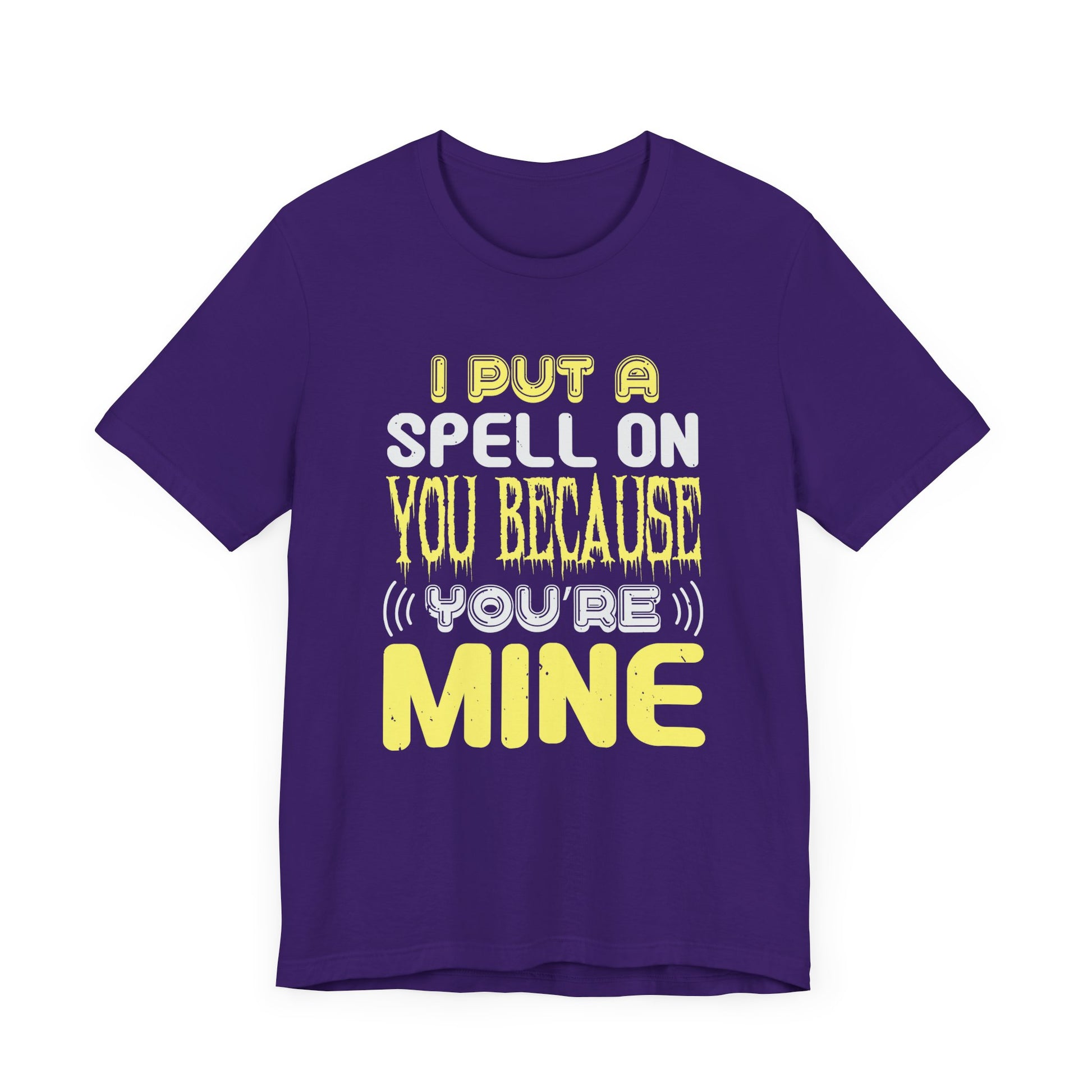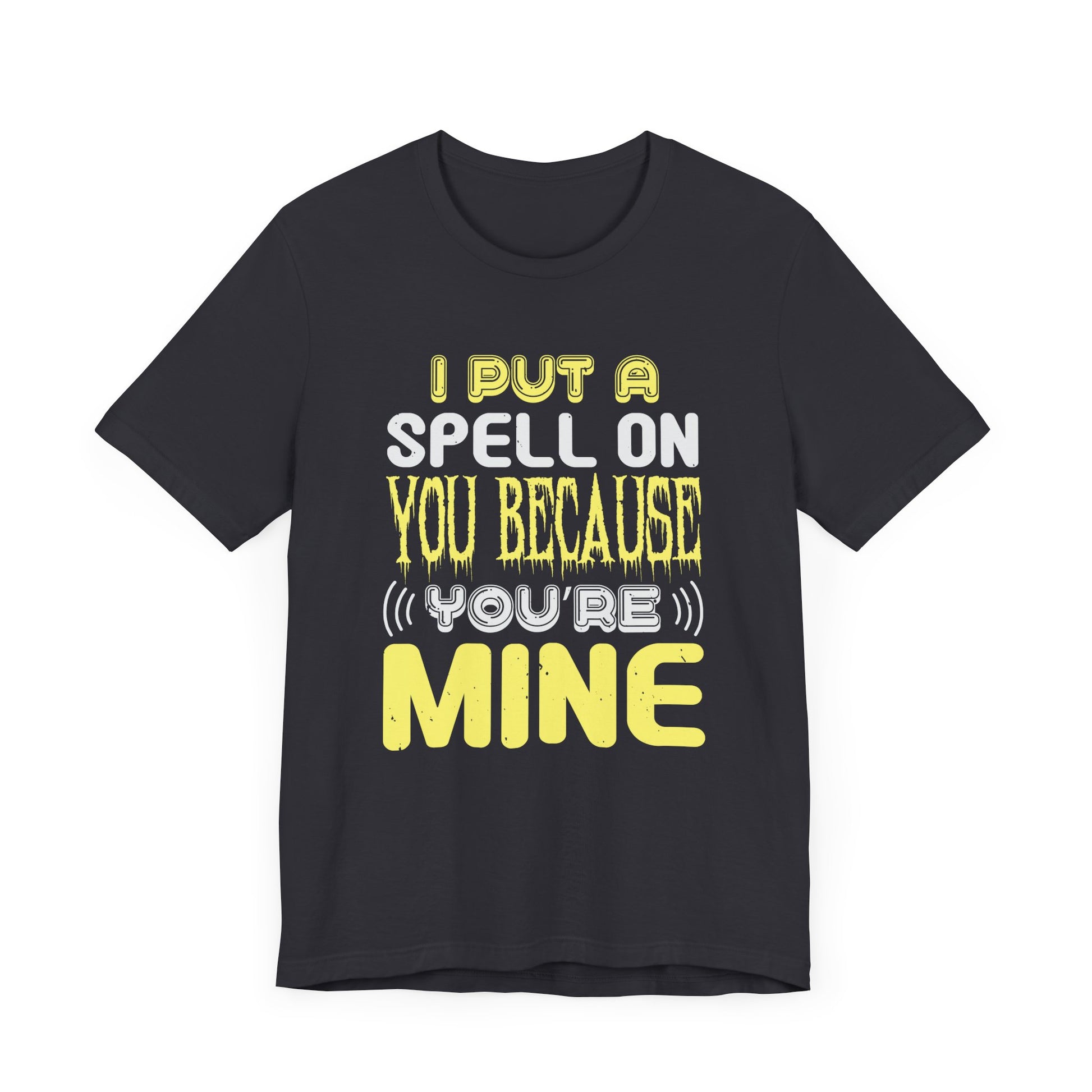 Cast a bewitching charm this Halloween with the "I Put a Spell on You Because You're Mine" Unisex Jersey Short Sleeve Tee! This enchanting design is perfect for those who love a mix of romance and spooky fun, making it a standout piece for the Halloween season.