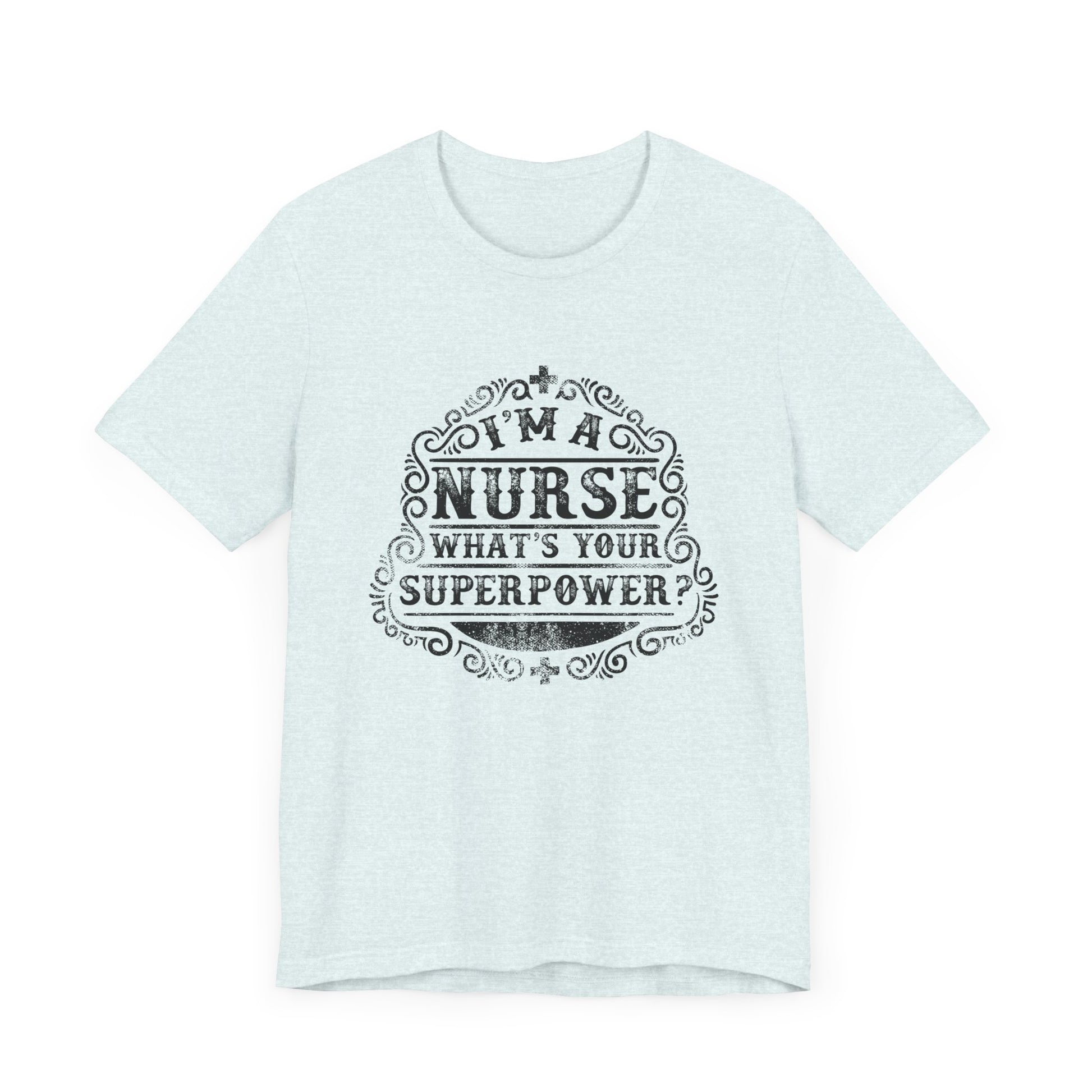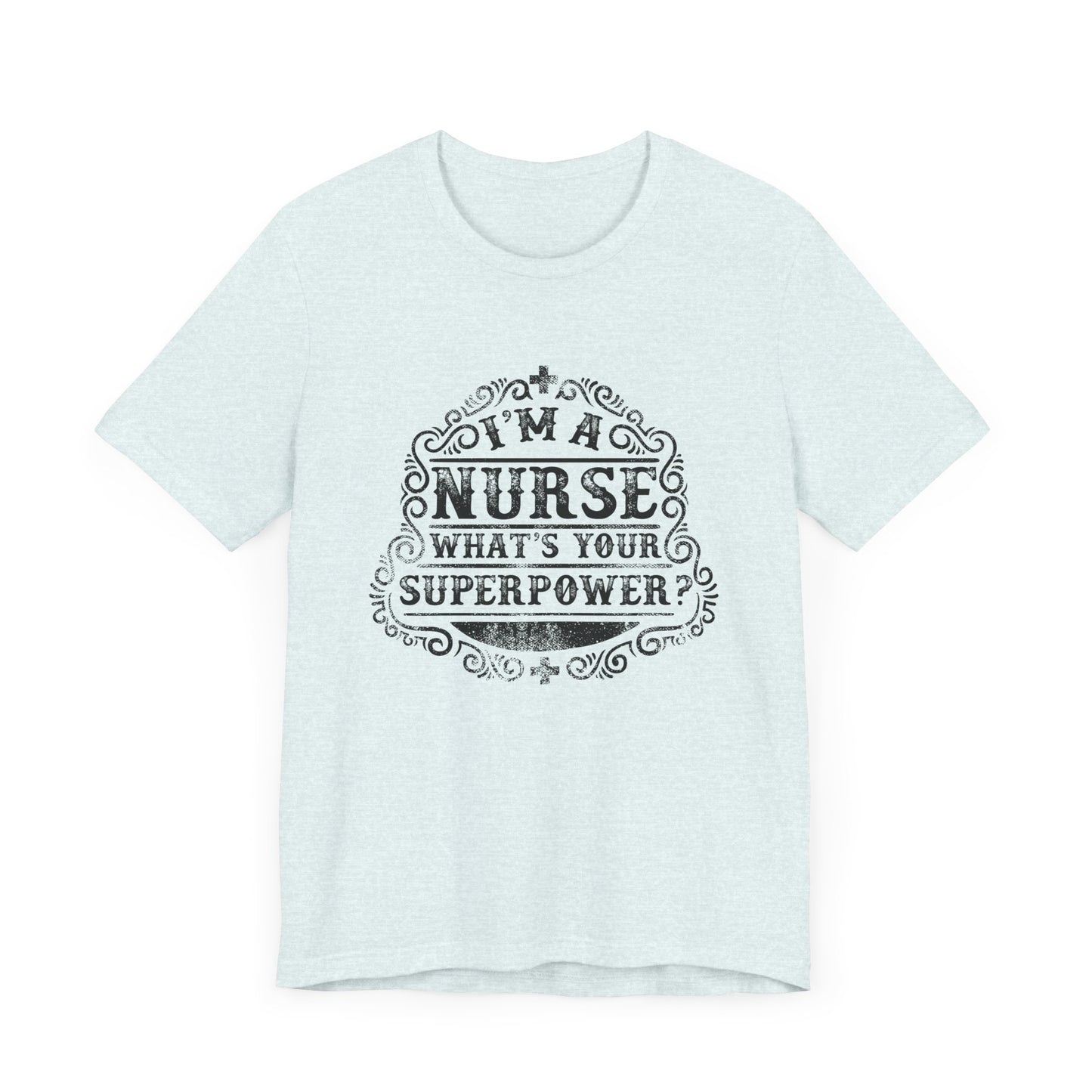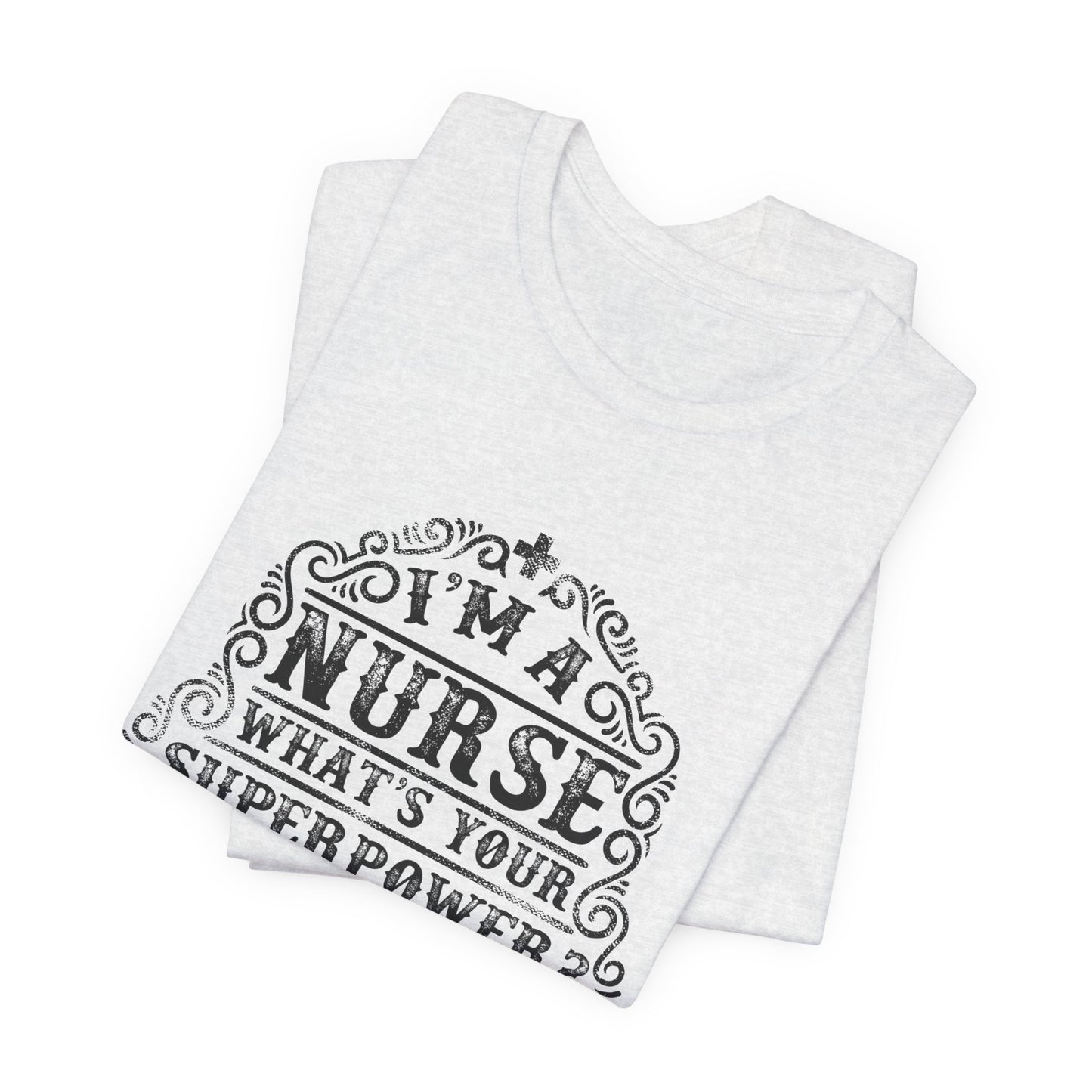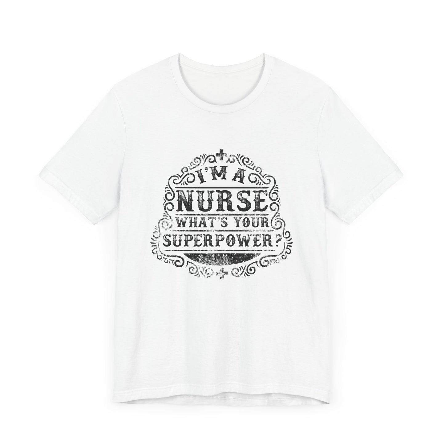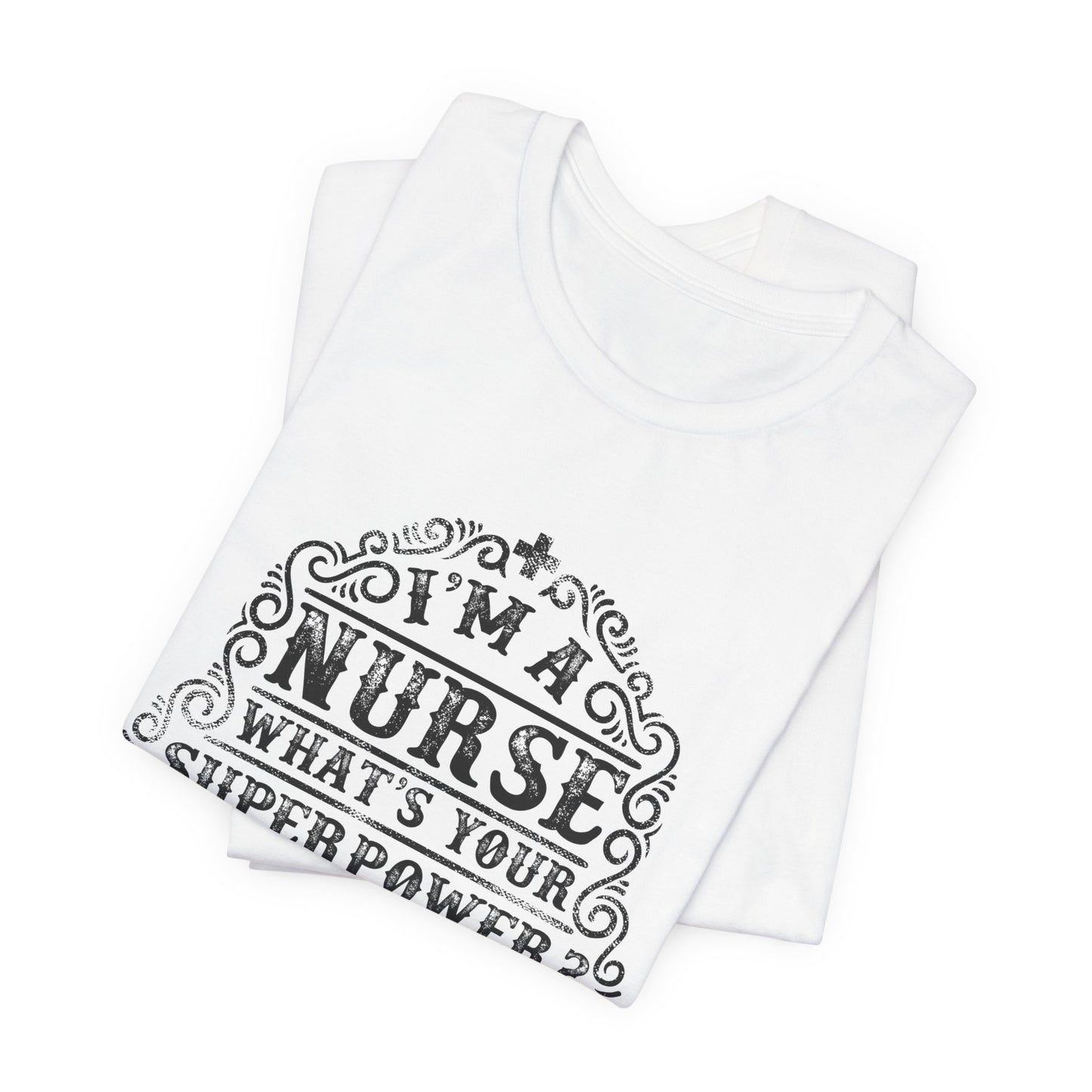 Embrace your superpowers with our "I'm A Nurse, What's Your Superpower?" tee. Whether you’re treating yourself or giving it as a gift, this t-shirt is a fun and empowering way to celebrate the extraordinary impact of nursing. Get yours today and let your superhero side shine!