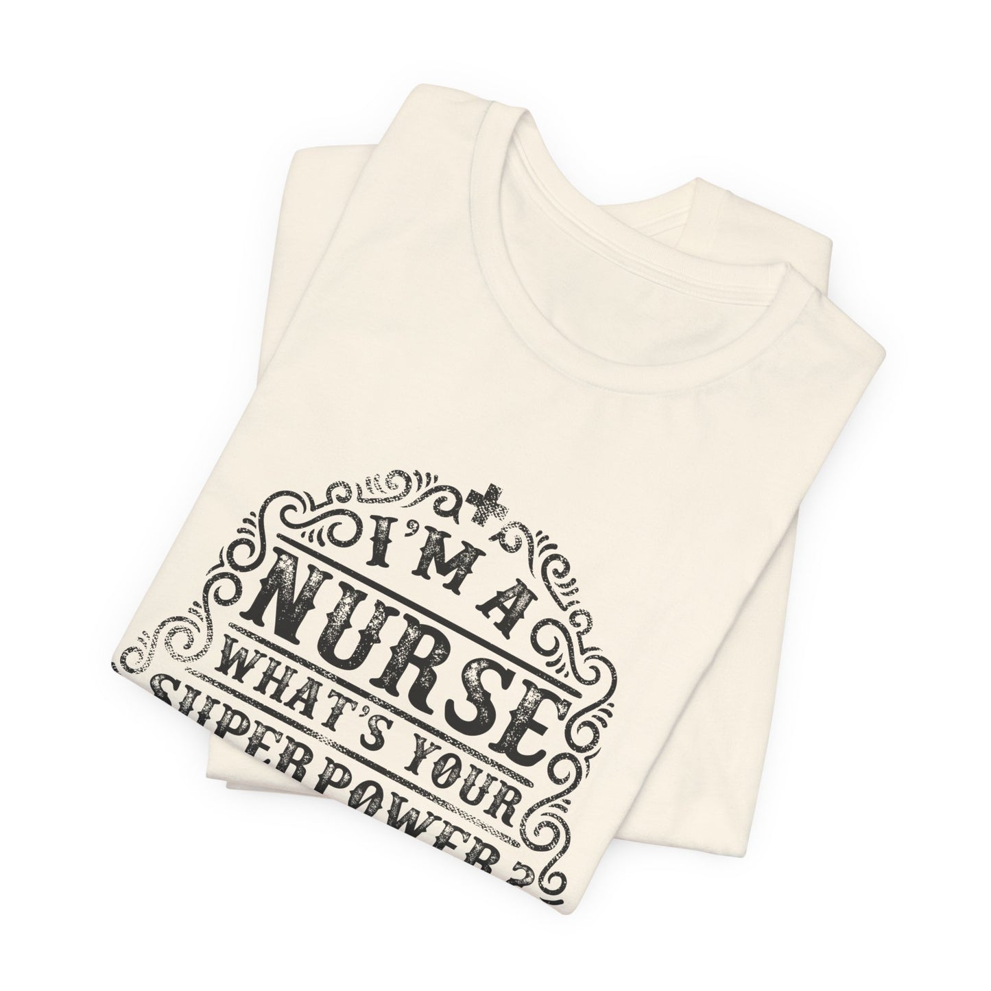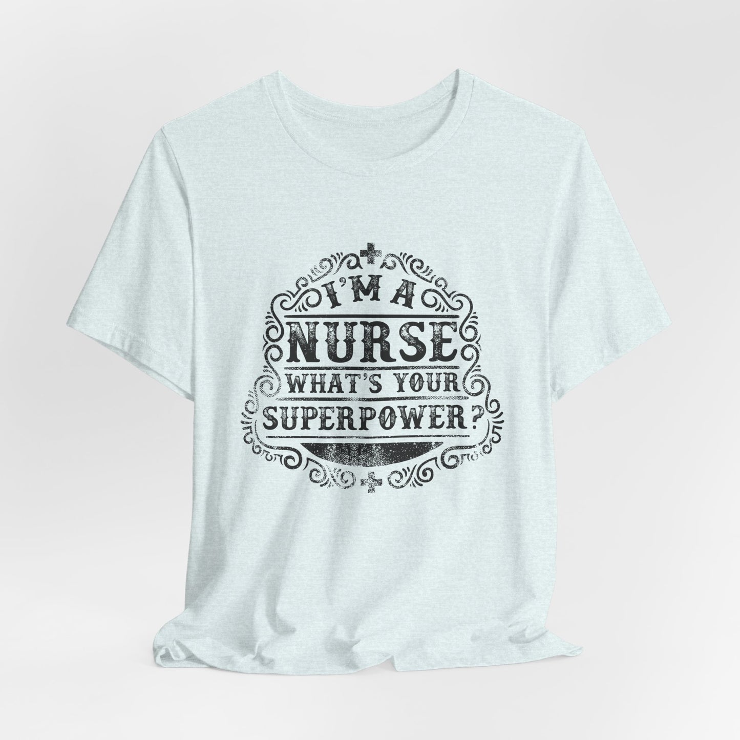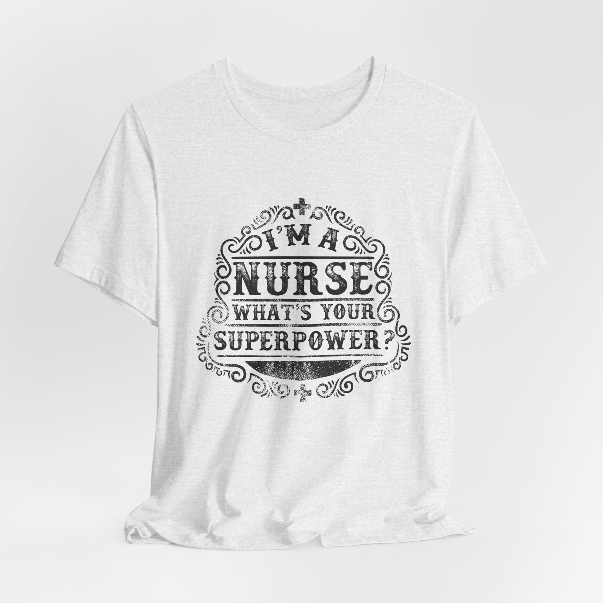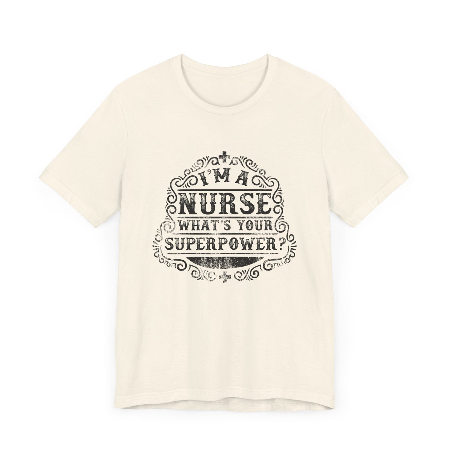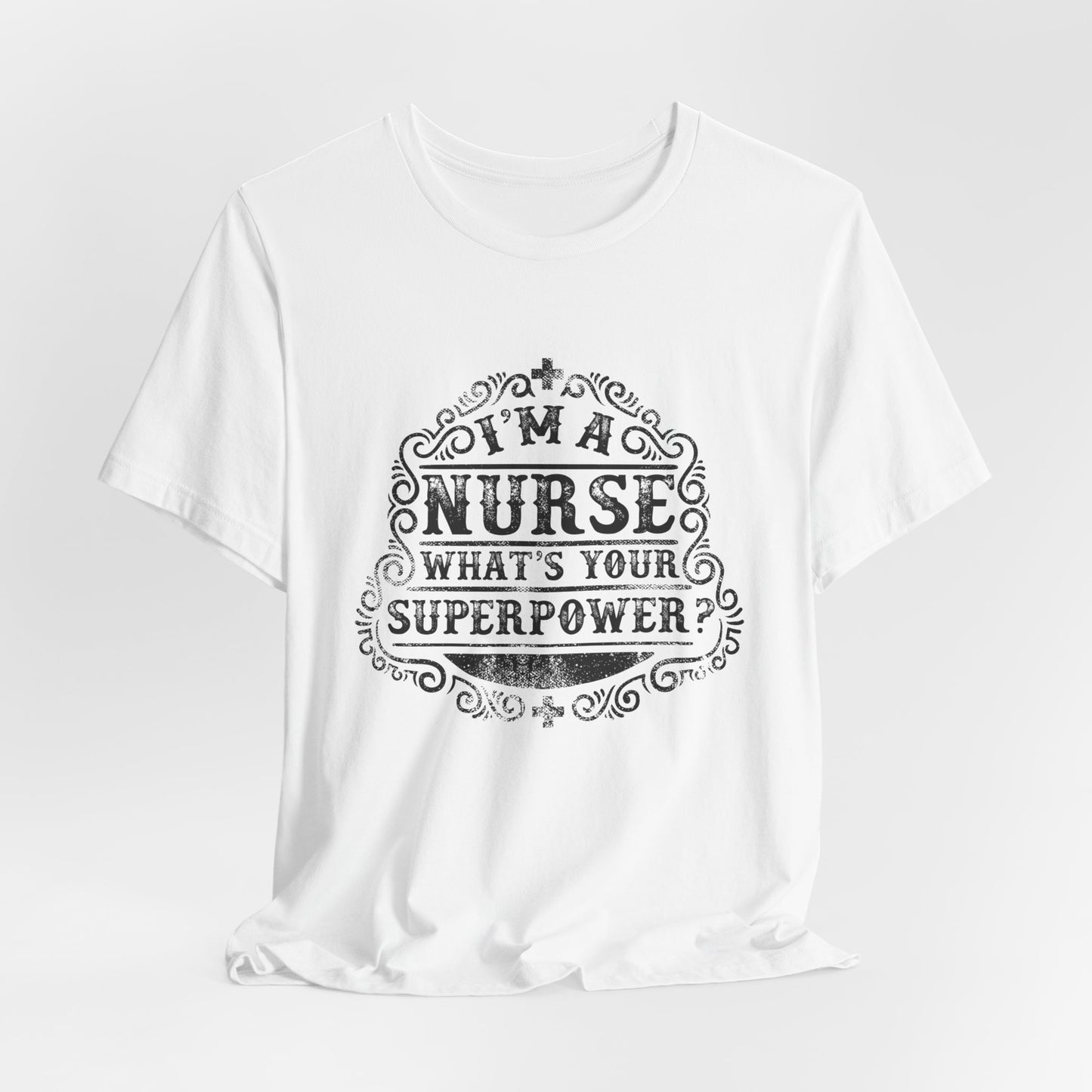 Embrace your superpowers with our "I'm A Nurse, What's Your Superpower?" tee. Whether you’re treating yourself or giving it as a gift, this t-shirt is a fun and empowering way to celebrate the extraordinary impact of nursing. Get yours today and let your superhero side shine!