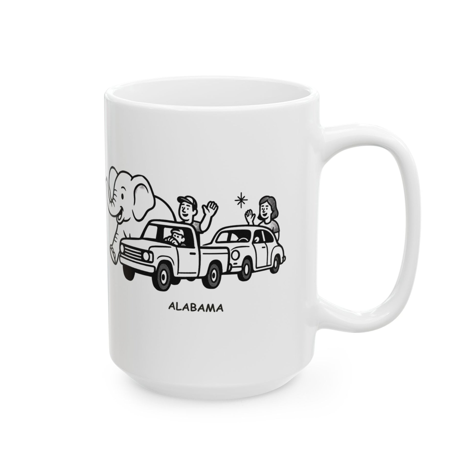 Experience the fun side of Alabama with this playful mug. Featuring the phrase 'In Alabama, we don’t do traffic; we do parades,' this ceramic mug captures the lighthearted spirit of Southern living. Whether you're sipping your morning coffee or relaxing with a hot tea, this mug, available in 11oz and 15oz sizes, brings a smile to every sip. Perfect for adding some Alabama charm to your day!