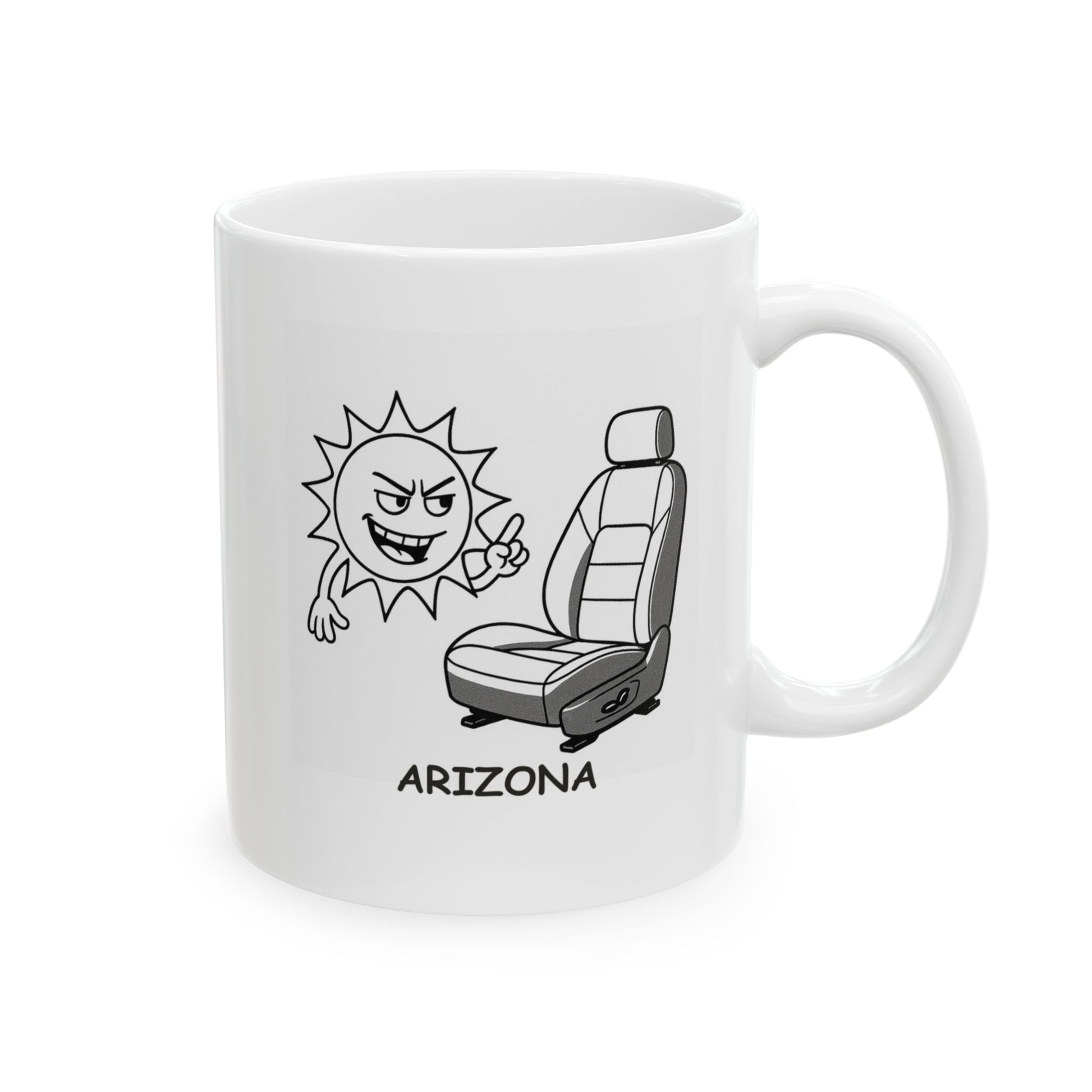 Hot weather problems? Arizona's got them all—and this mug says it best. With a humorous nod to every sun-scorched seat and thigh-sizzle moment, this ceramic mug is perfect for those who know the desert heat a little too well. Available in 11oz and 15oz sizes, it’s ideal for sipping something cool while laughing through the burn.