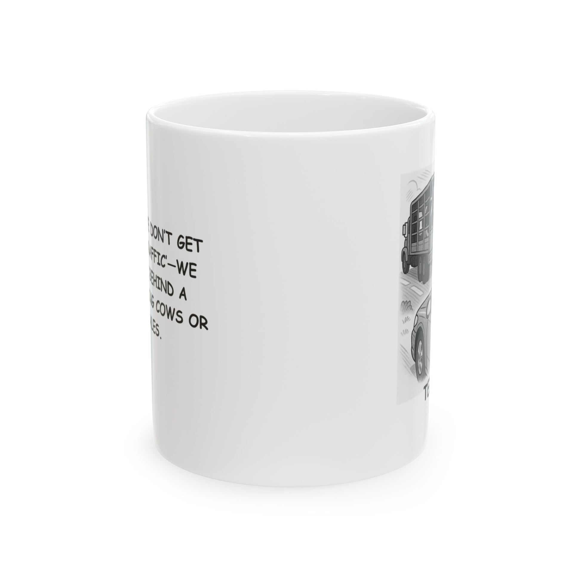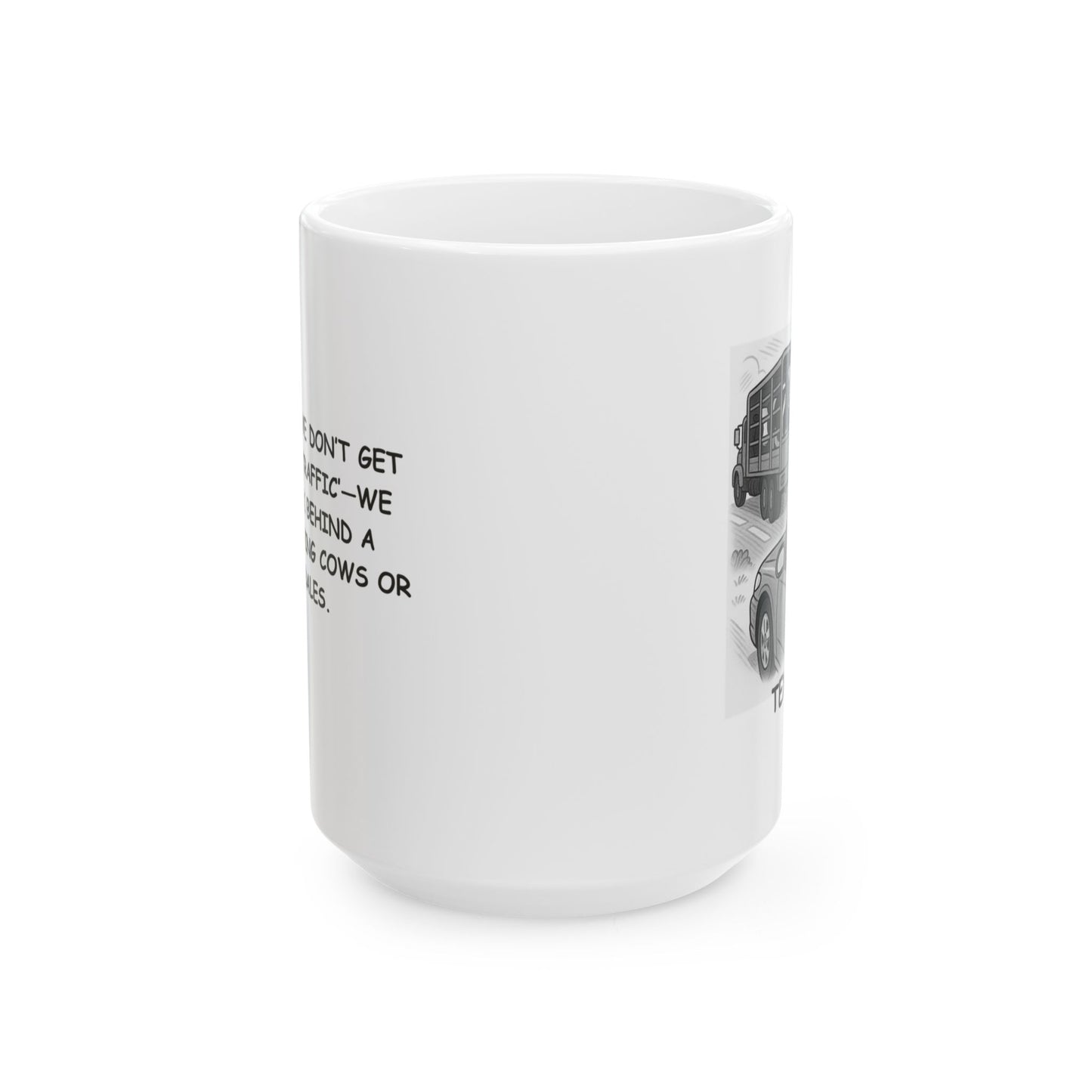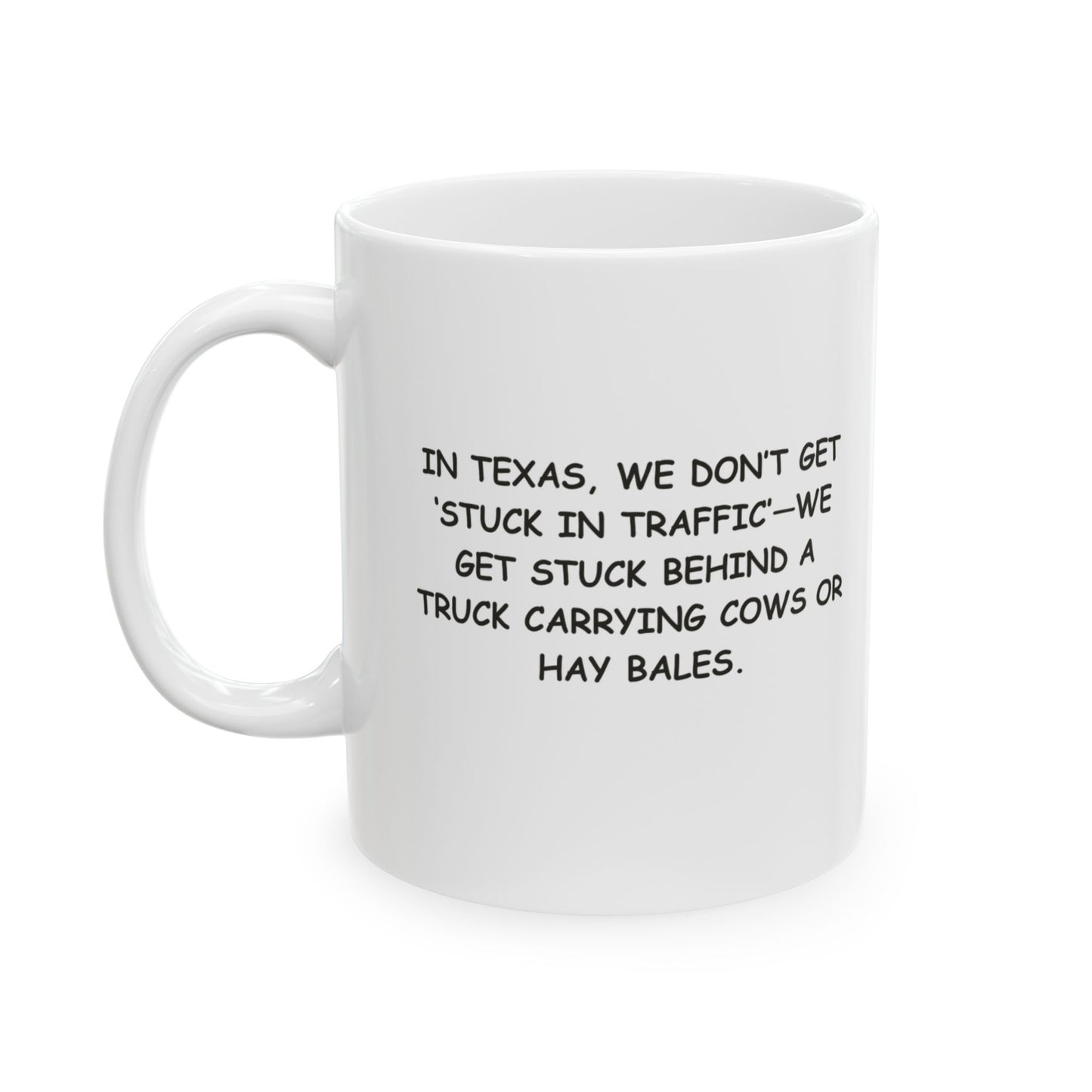 "In Texas, we don’t get ‘stuck in traffic’—we get stuck behind a truck carrying cows or hay bales. Ceramic Mug - 11oz / 15oz - 12756