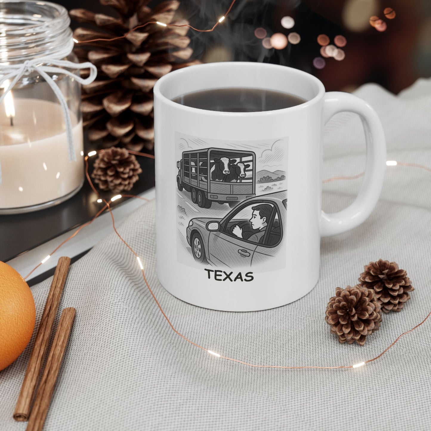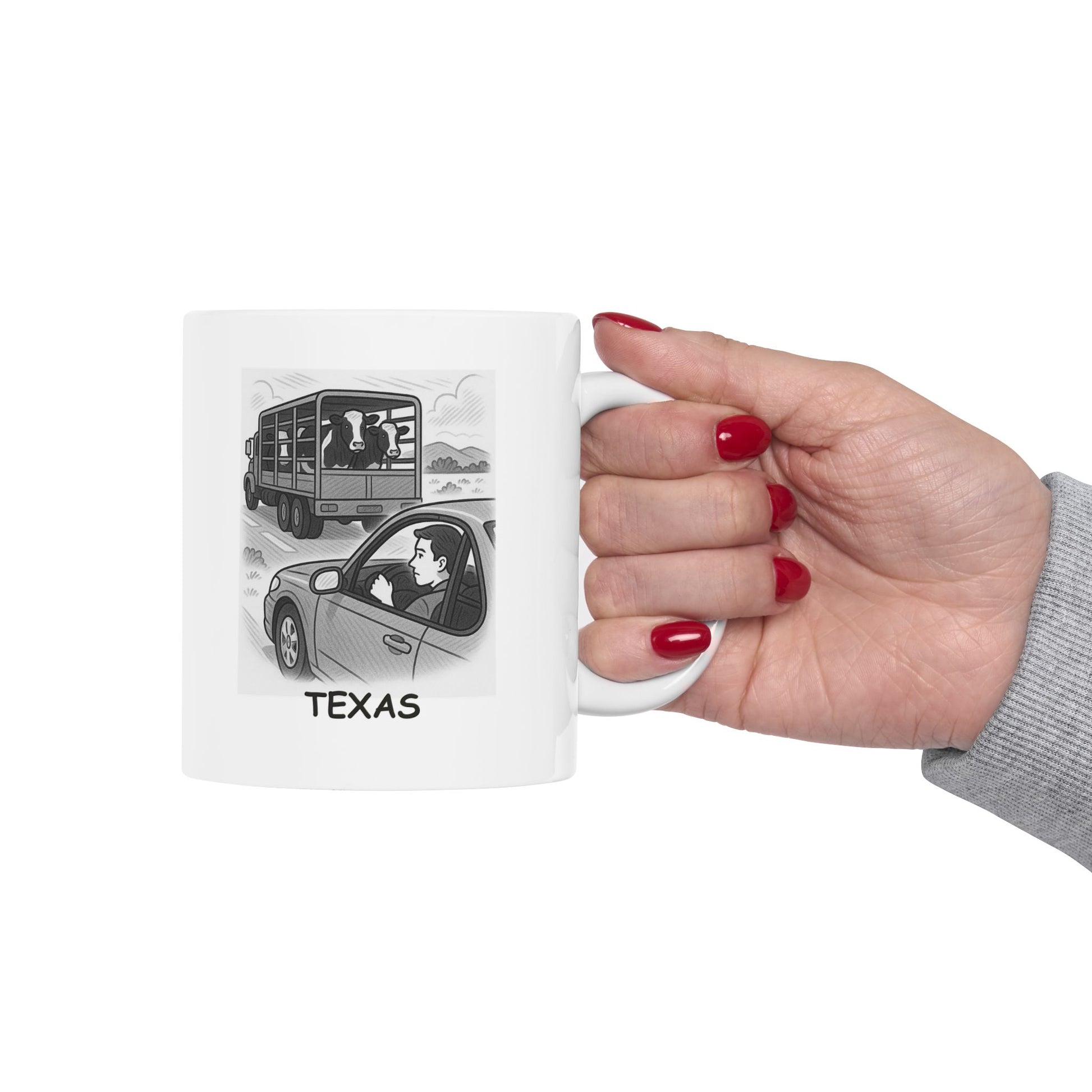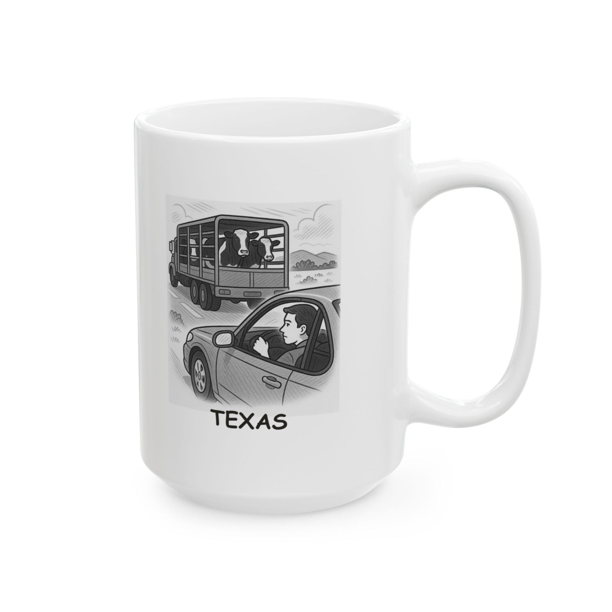 "In Texas, we don’t get ‘stuck in traffic’—we get stuck behind a truck carrying cows or hay bales. Ceramic Mug - 11oz / 15oz - 12756